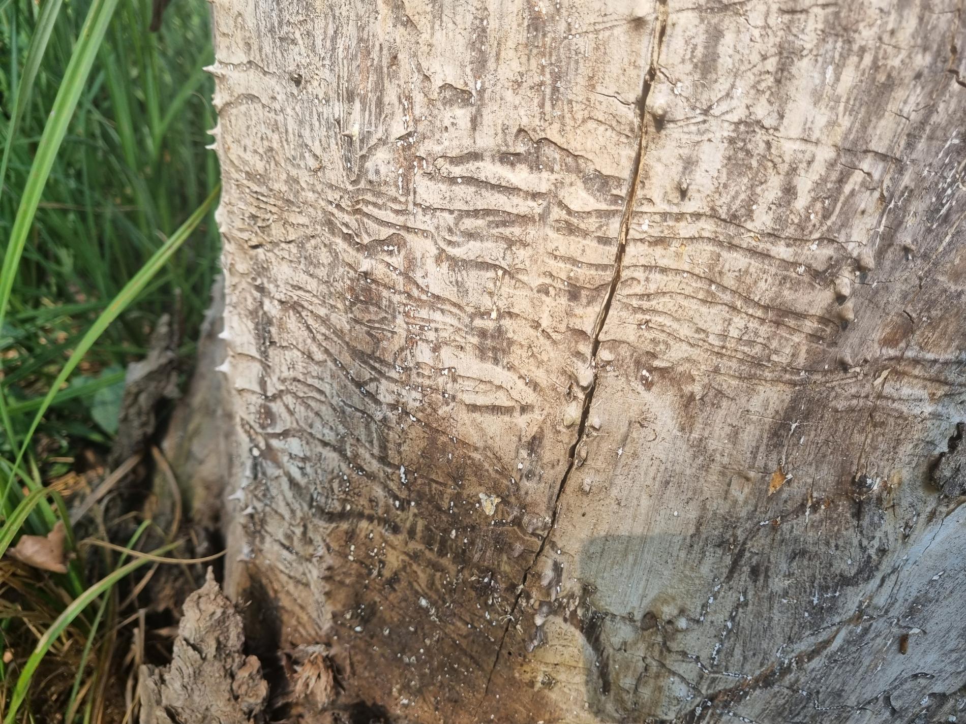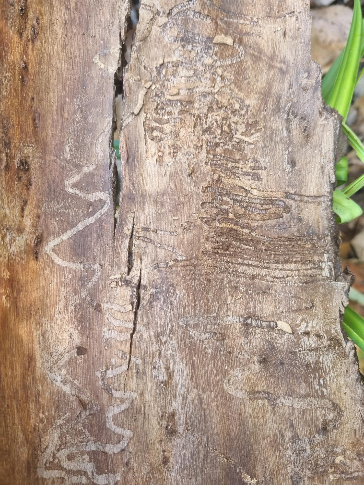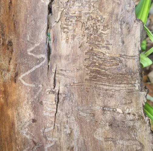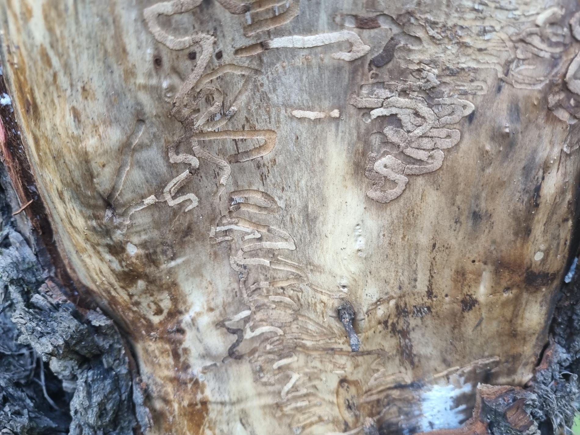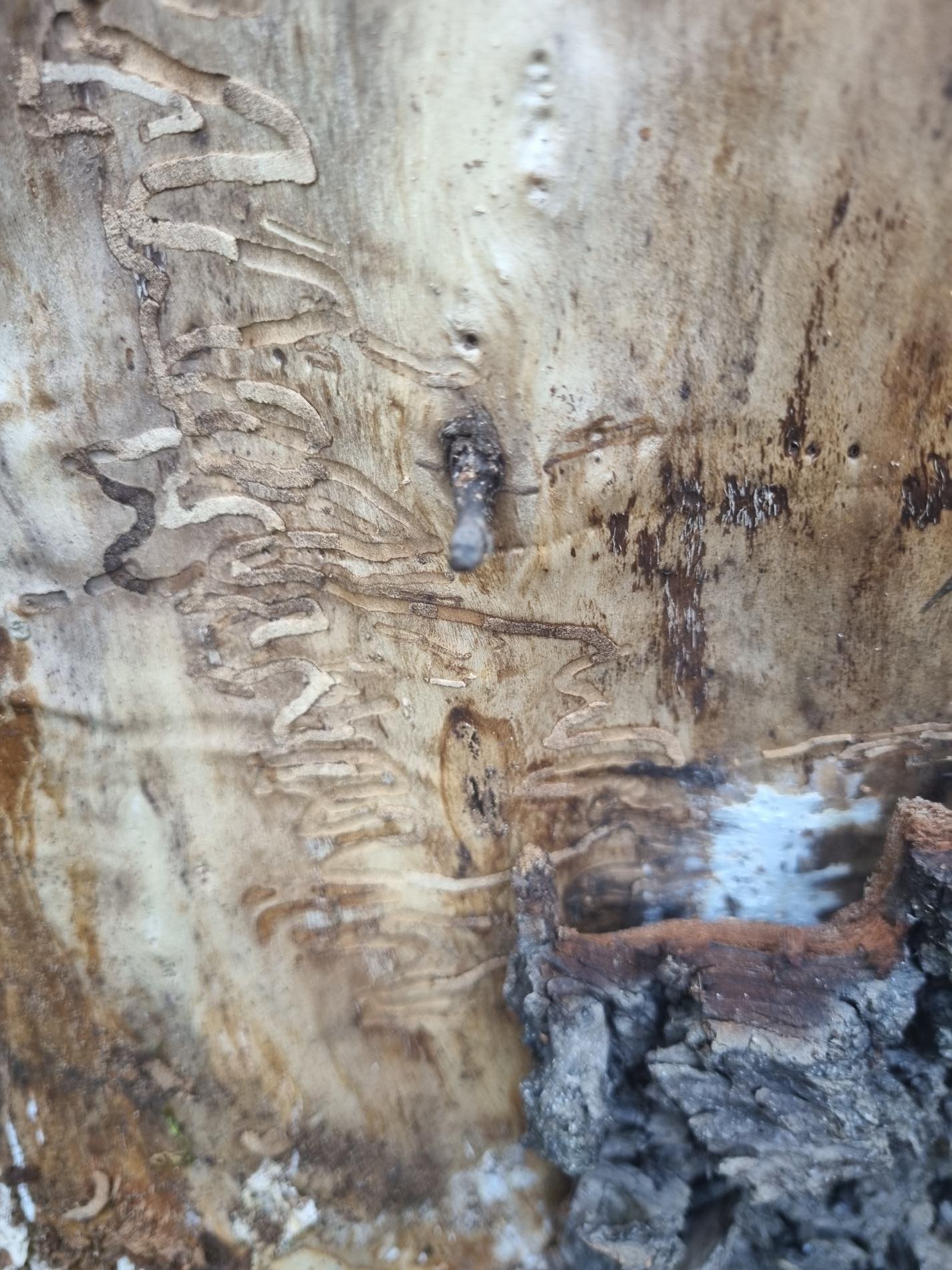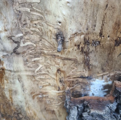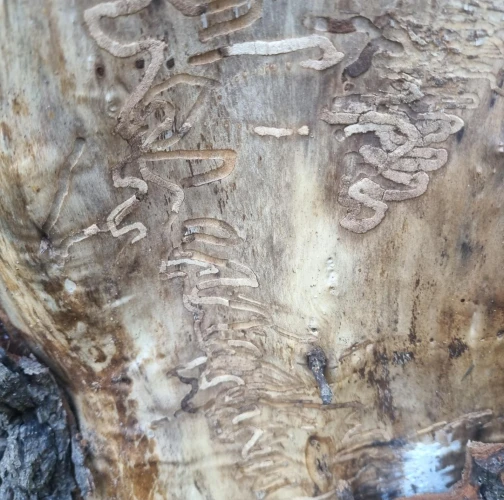 Visible signs of infestation include exit holes and large serpentine galleries under the bark.