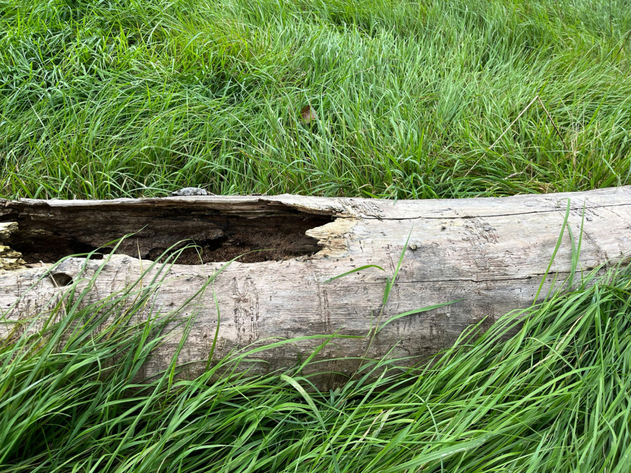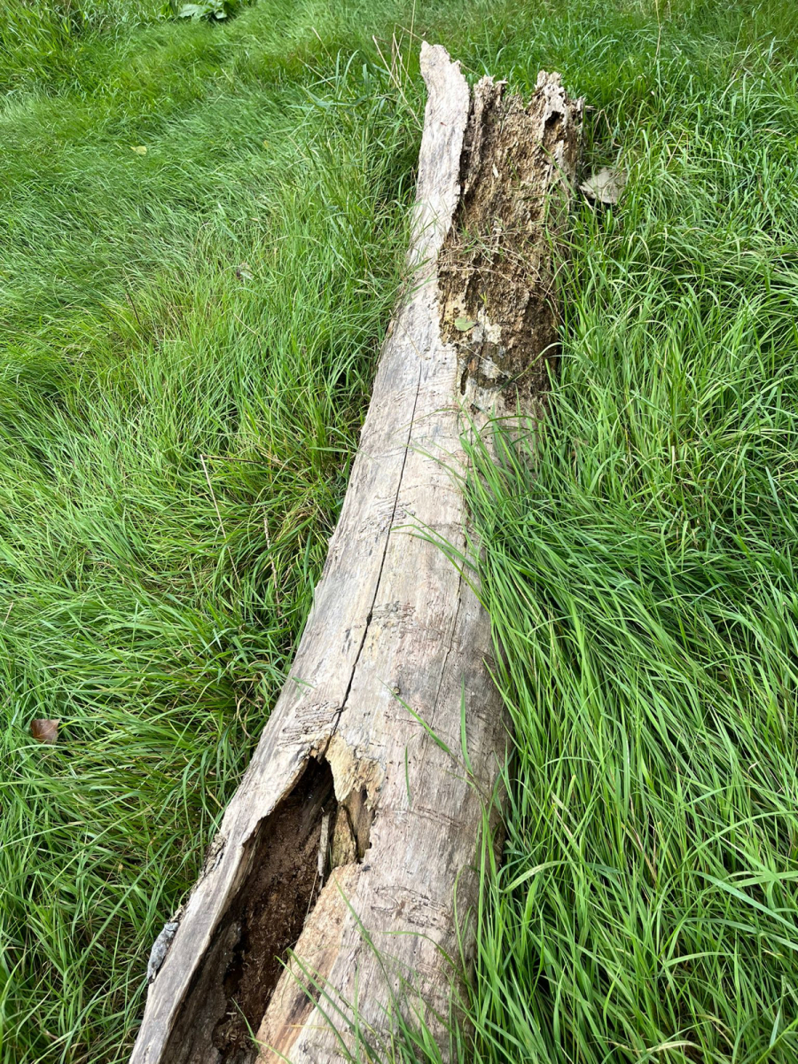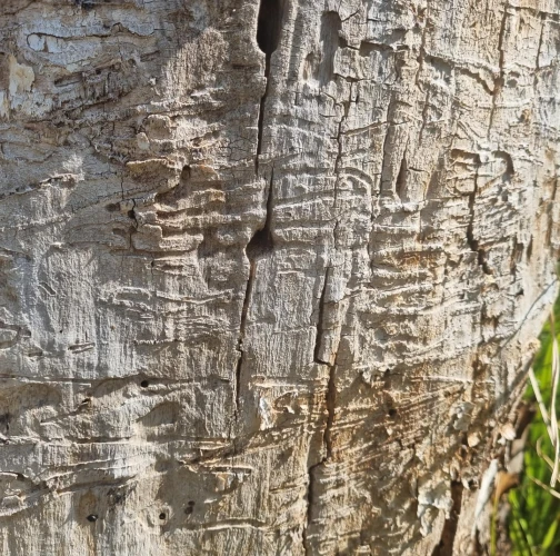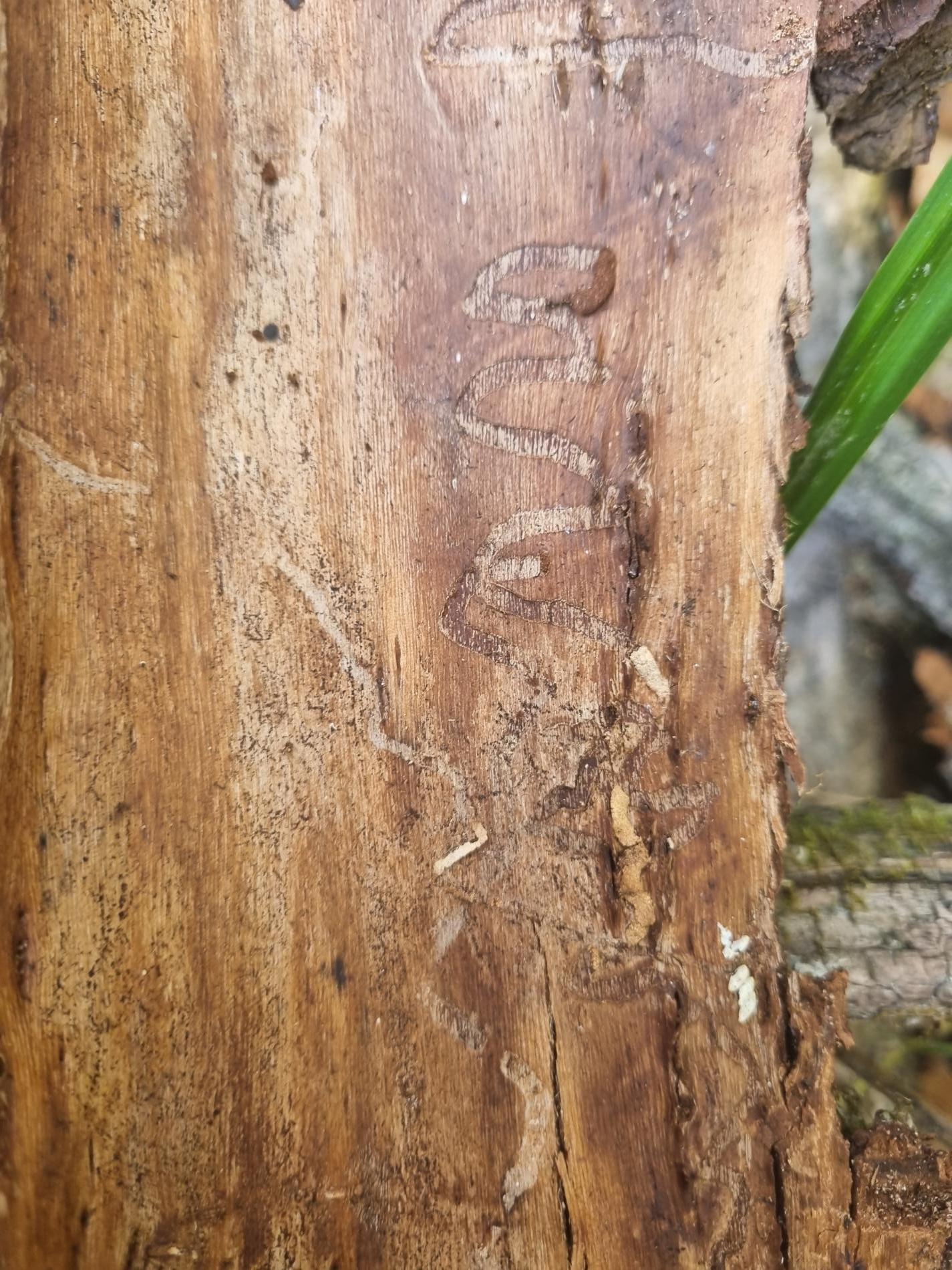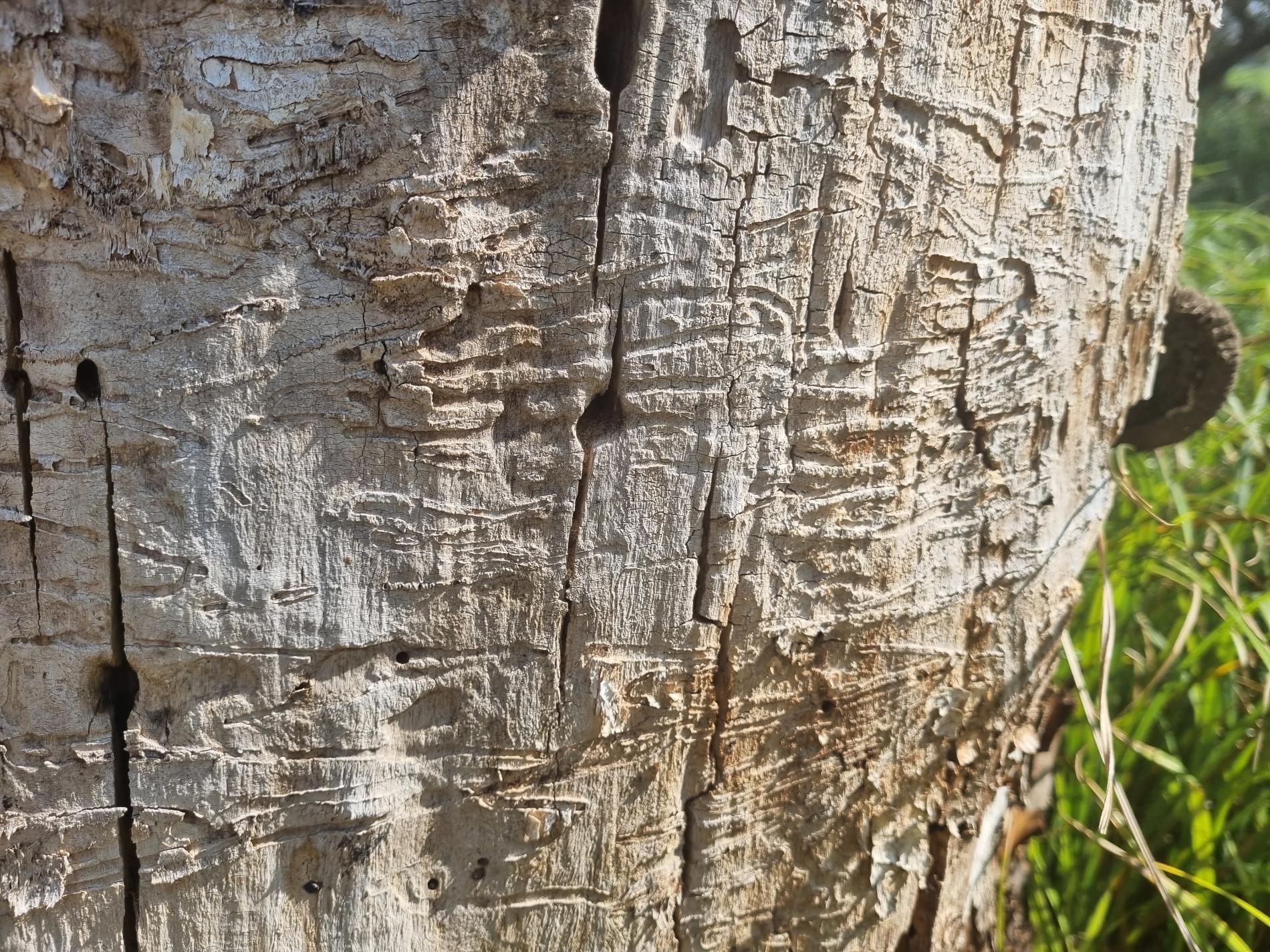 Visible signs of infestation include exit holes and large serpentine galleries under the bark.