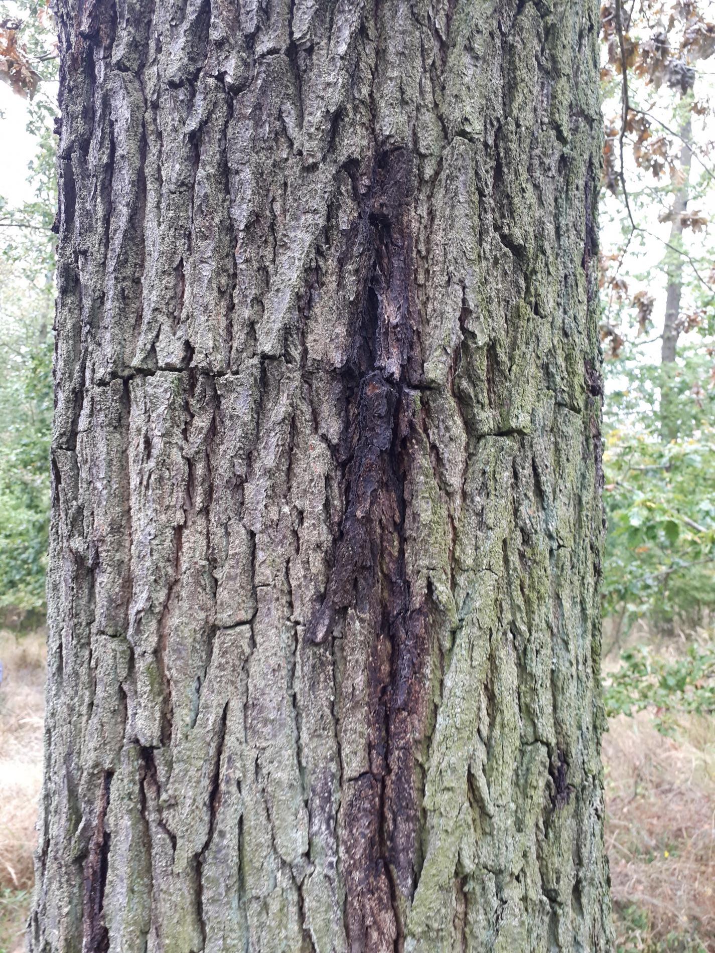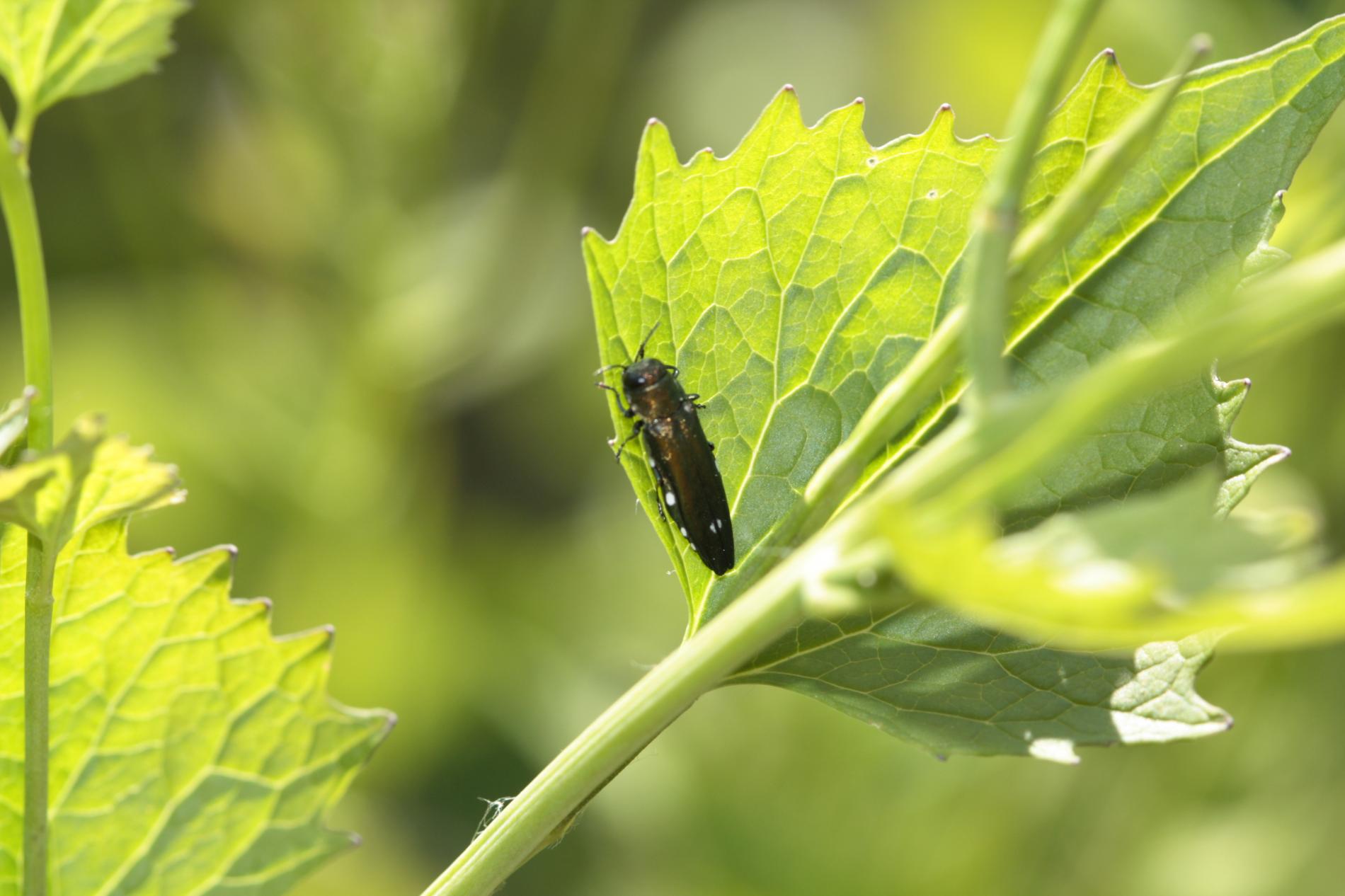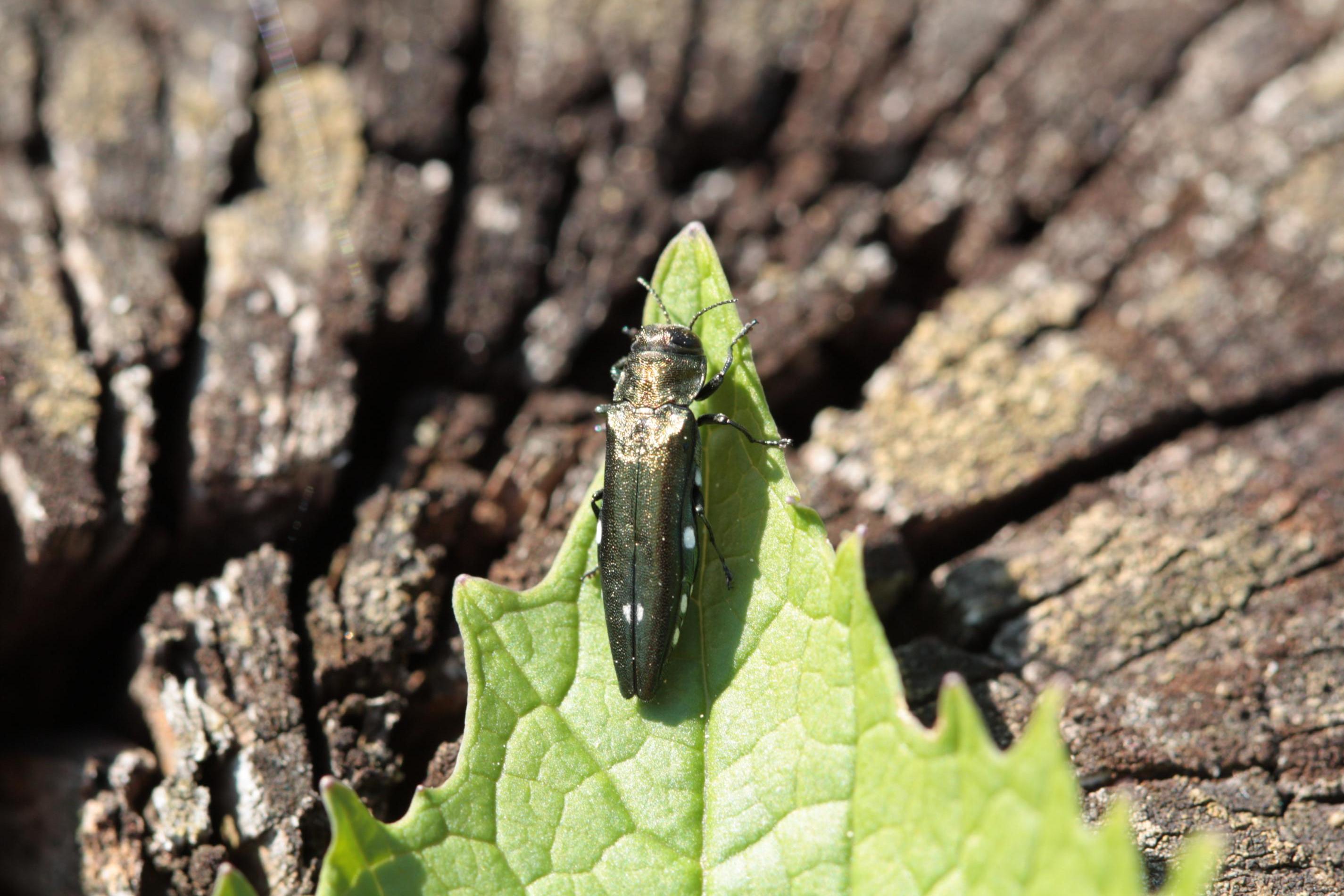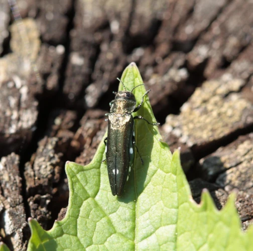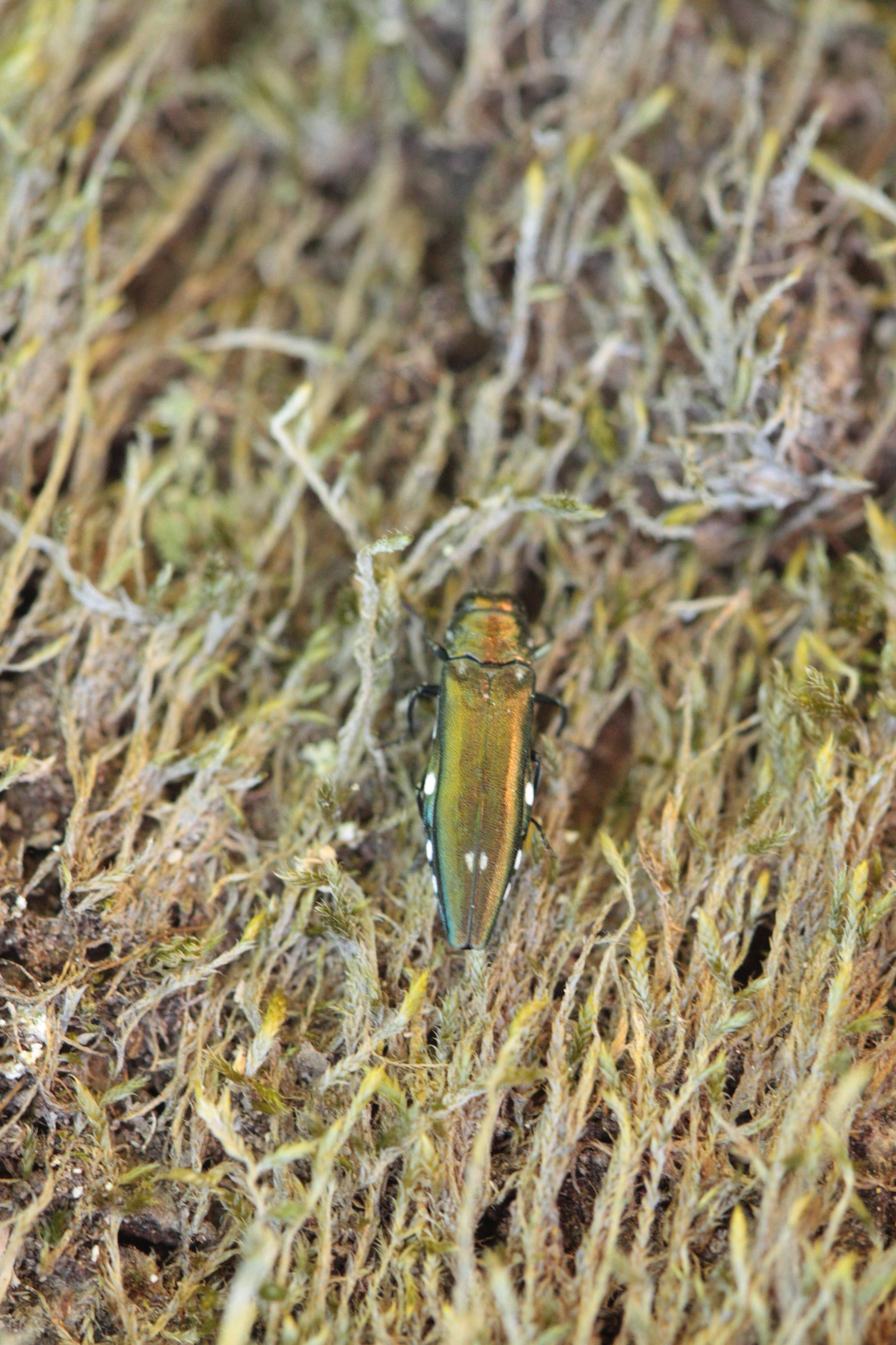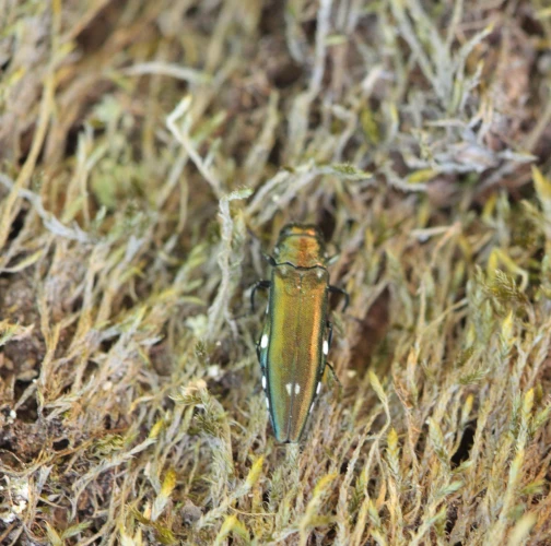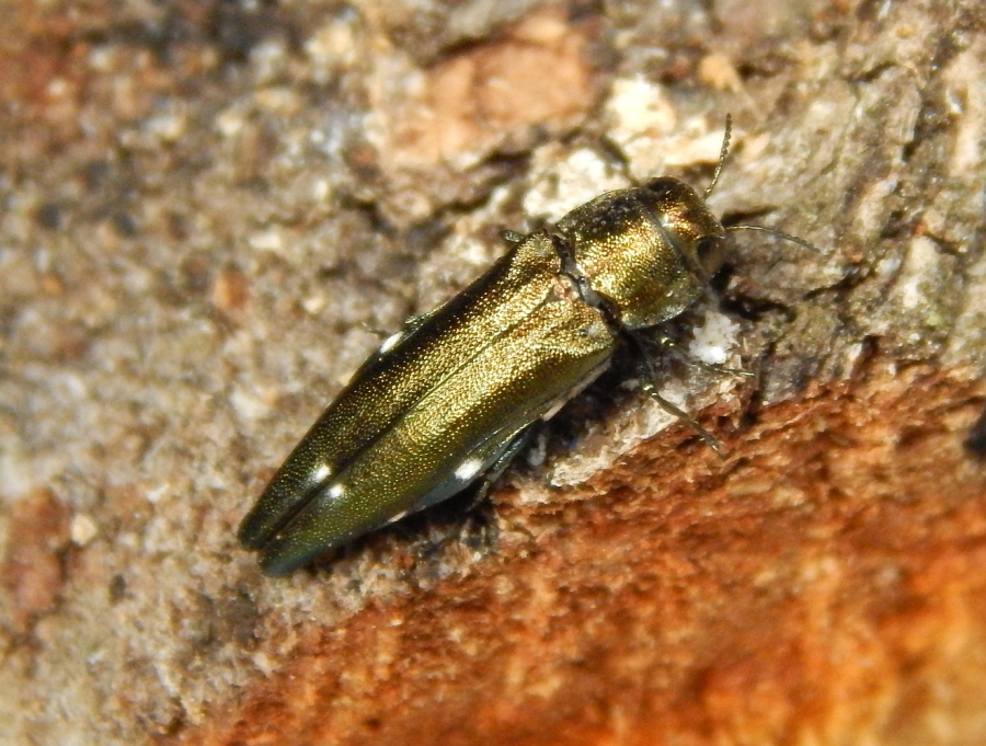 A metallic shiny green beetle, about 8.5-13.0 mm long. It attacks mostly older, languishing oaks in sunny and warmer locations. It is one of the major contributors responsible for oak death in Europe in the last decade. A. biguttatus lays eggs in groups into oak bark notches. Larvae bore into the bark where they excavate narrow galleries and pupate at their ends. The larva overwinters in the galleries and pupates in spring. It swarms towards the end of May and in June. Damage typically results in three dieback.