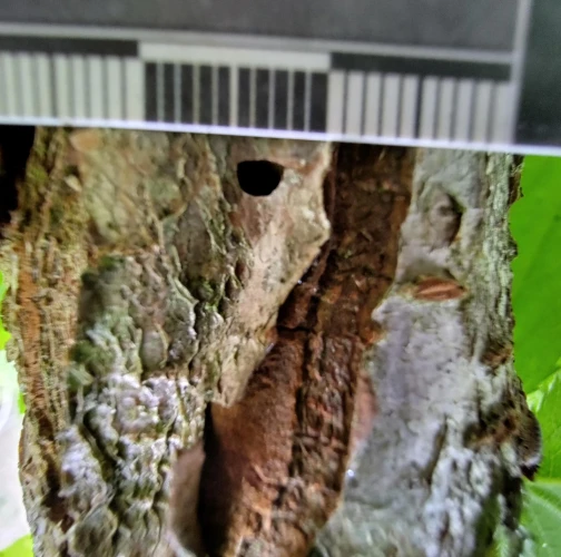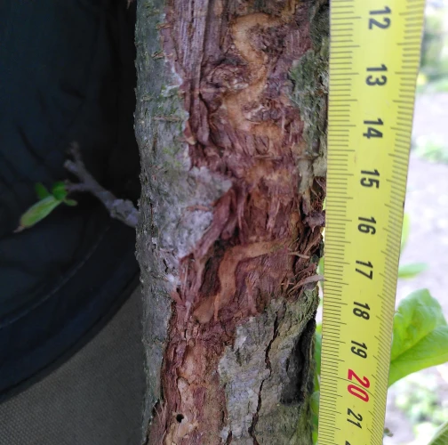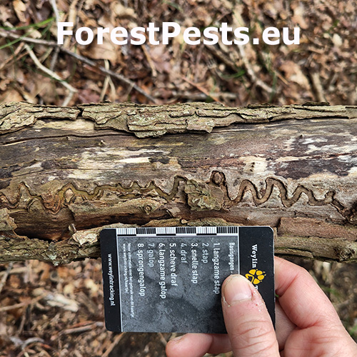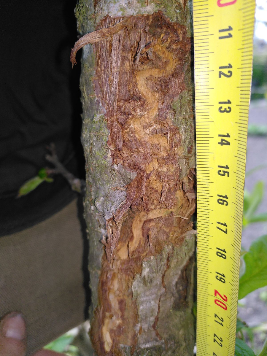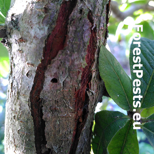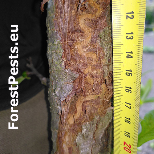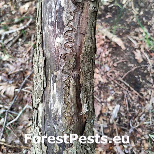 Larvae create typically downward-running sinuous galleries just below the bark. The bark of attacked trees becomes necrotic and dies off, creating cracks that provide entry points for various secondary pathogens. Attacked trees can die back.