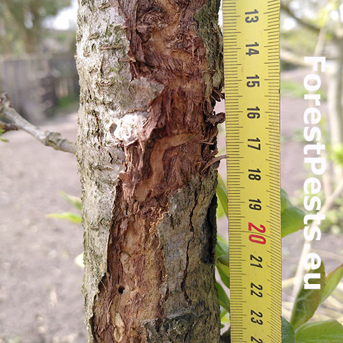 This species was mentioned in the 19th century, but just as an integral part of the ecosystems of deciduous, xerophilous forests. In the 20th century, it became increasingly known for the damage it causes, especially to ornamental and fruit trees. The population increase is attributed to climate change and the lengthening periods of heat and drought, which favor this thermophilic species. It causes damage to pears (Pyrus pyraster, P. communis), quince (Cydonia oblonga), apple (Malus spp.), plum (Prunus spp.), medlar (Mespilus germanica) etc.