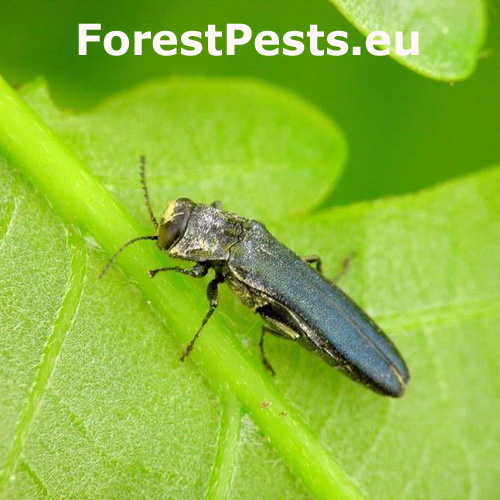 A metallic shiny blue beetle, about 6.0-8.5 mm long. The beetles commonly live on oak leaves in May-July. They also commonly fly onto log dumps. The larvae develop in thicker branches of languishing oaks in warmer localities. They eat out serpentine galleries under the bark. The full development takes 2 years, but the length of the larval development is strongly influenced by the environmental conditions (sun exposure, bark thickness, etc.). Recently was accidentally introduced to North-America. Its mass attack can cause branch dieback. This species - together with other Agrilus species - is considered as potential vector of oak tracheomycosis caused by Ceratocystis fungi. It can be found along with the related species A. biguttatus. The tree crowns of attacked oaks open up, epicormic shoots can occur. The trees die in groups.