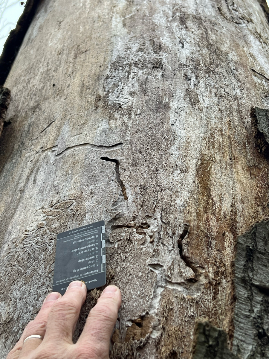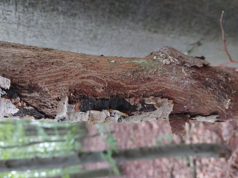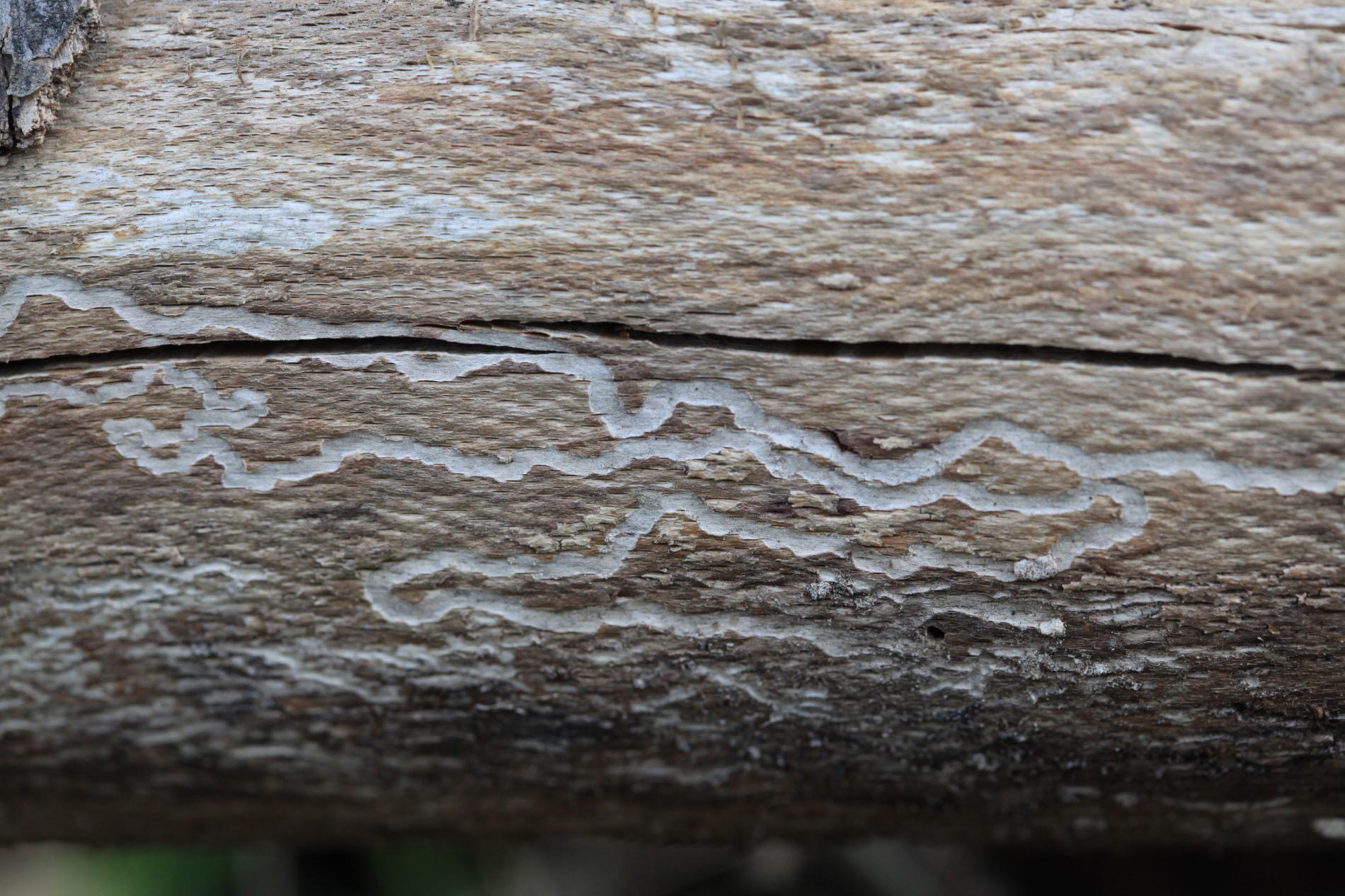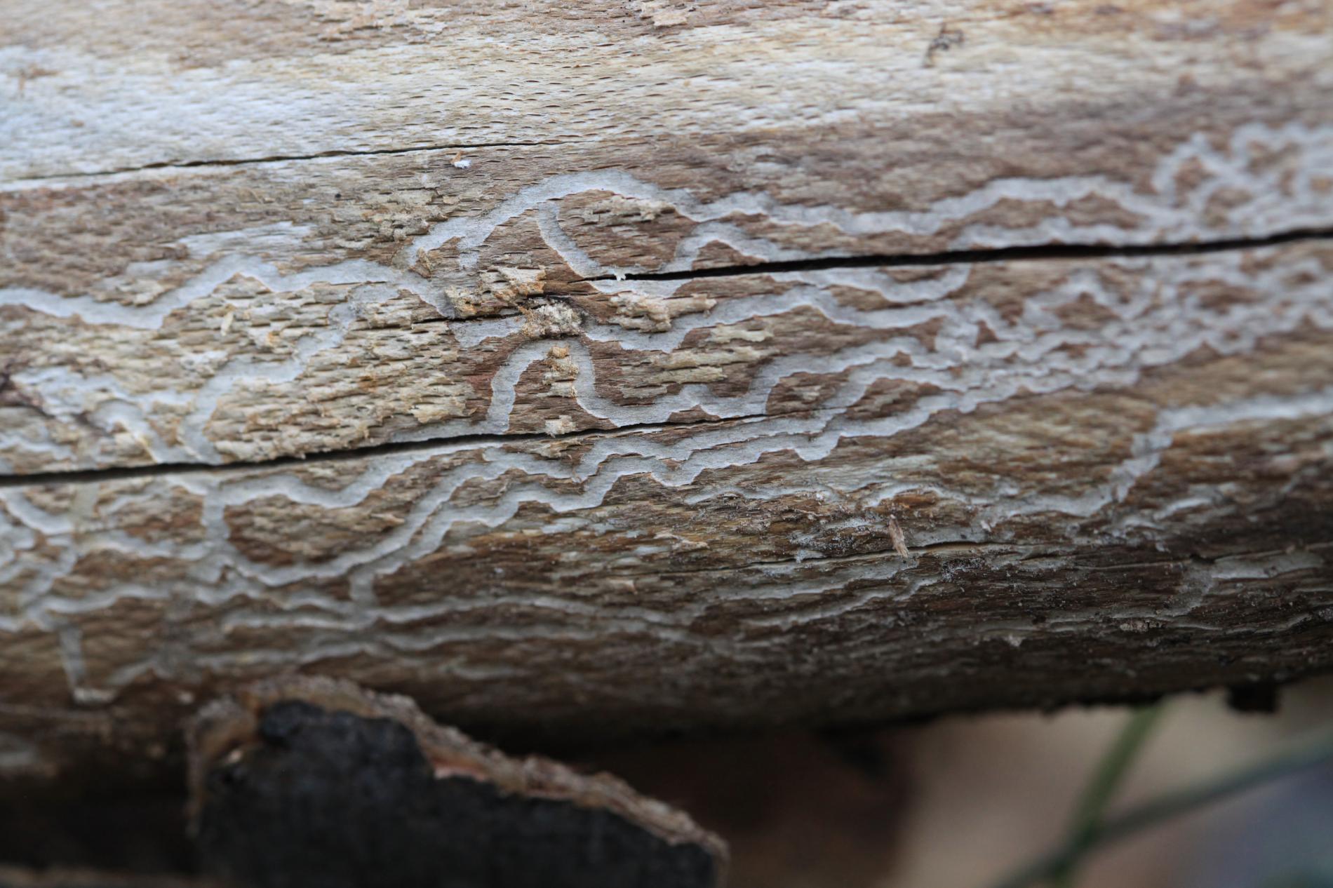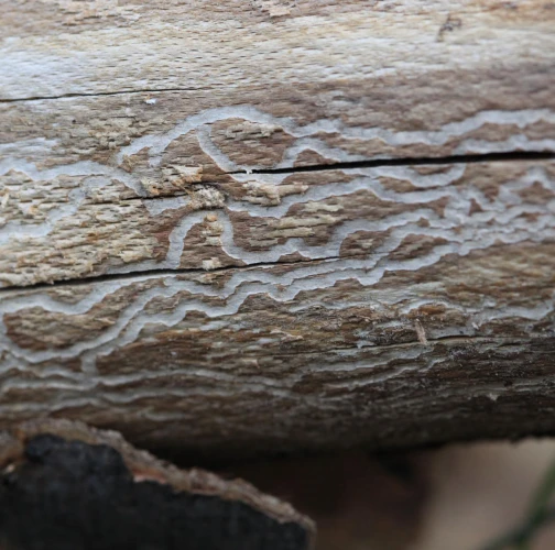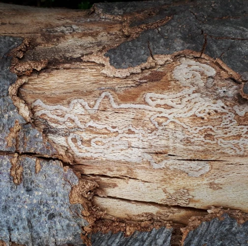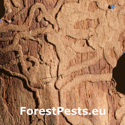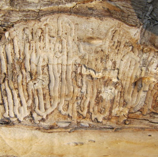 The larvae excavates S-shaped feeding galleries under bark of branches and trunks. Dark spots on the bark.