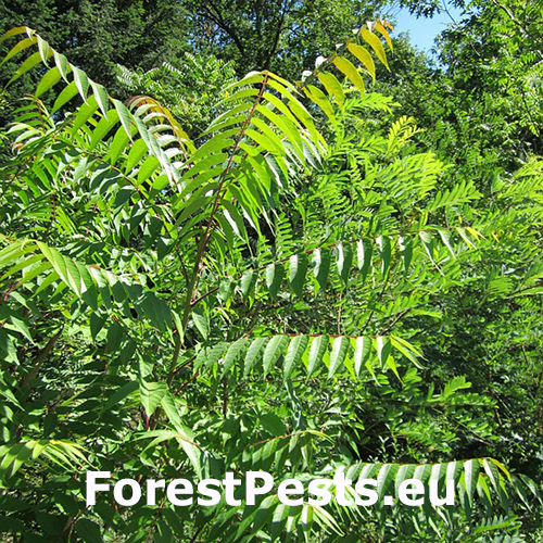 The tree of heaven  is a fast-growing woody plant that can limit the growth of surrounding vegetation by its roots and leaves. It excludes the substance ailanthon, which limits the growth of about seventy species of deciduous and coniferous trees. It spreads by seeds and cuttings. In the first year, seedlings can grow to a height of up to 2 meters, they begin to bear fruit in the 10th year. In response to damage, the woody plant produces intensive root and stump shoots, is light-loving and does not tolerate shading. It is short-lived, it dries up after 30 to 50 years. Tree of heaven is among the 40 most invasive trees in the world. It suffers from rotting of the root system. Trees older than 35 years are prone to refutation and break. The best possible removal of these often undesirable woody plants is a deep cut or a drill followed by a final application of a concentrated herbicide directly into the wound.