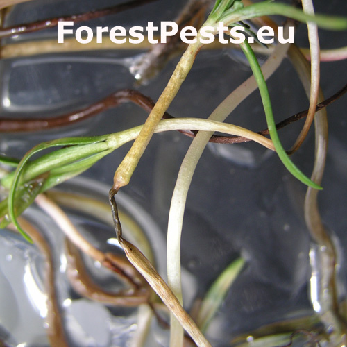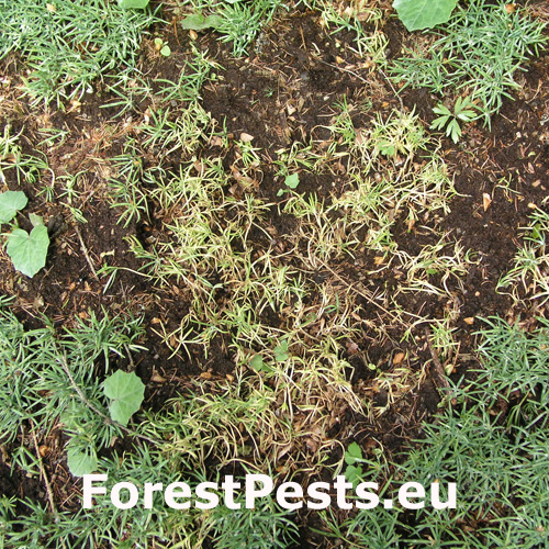The fungus is commonly found on a variety of plant remains and appears frequently also on seeds of woodland trees, degrading their germination capacity or infesting sprouting seeds and early growth of saplings in humid conditions. If kept dry, the seeds are resistant against the fungus. Only occasionally it may cause die-back of sapling or young plantation shoots, manifested by crumpling of wilted tips. The central black section is formed by a mass of conidia, while the gray edge is the mycelium. As a rule, the fungus is a secondary pathogen causing generally no severe damage in forest crop.