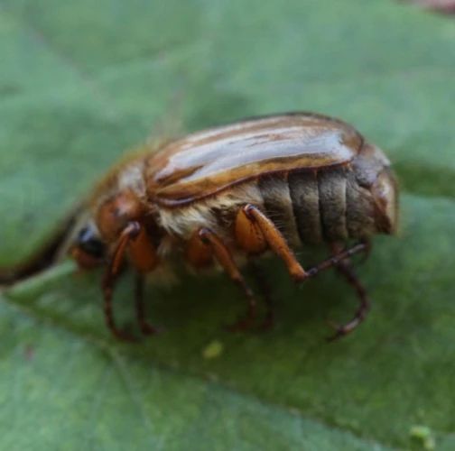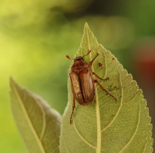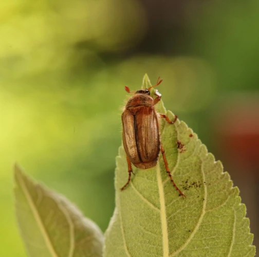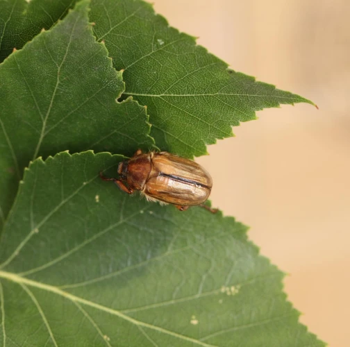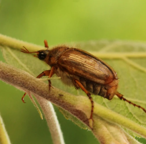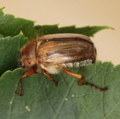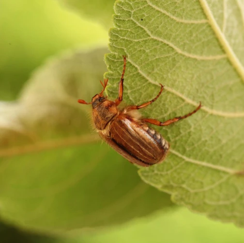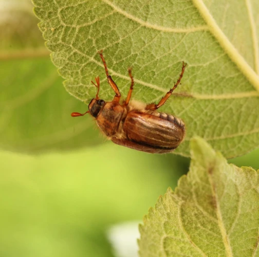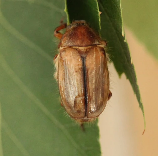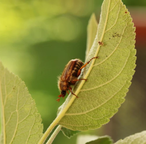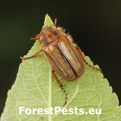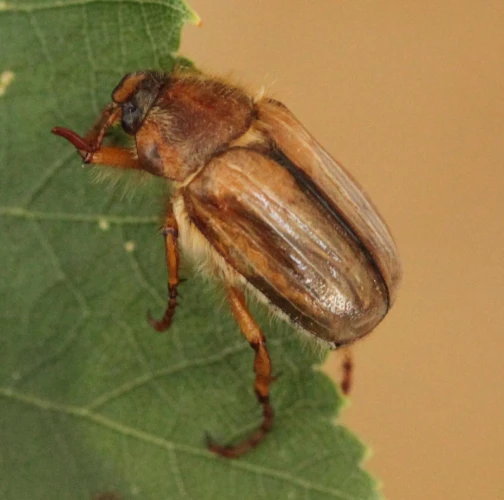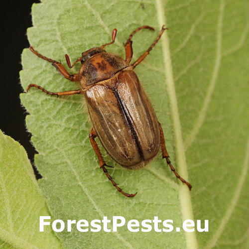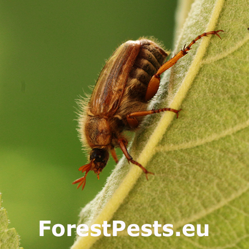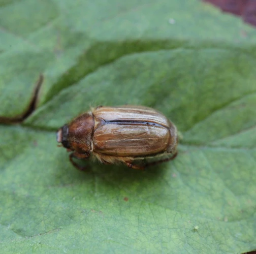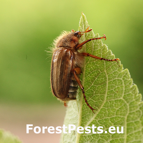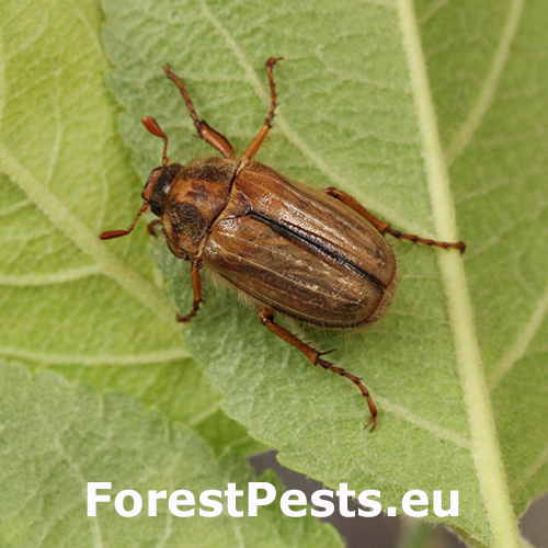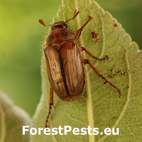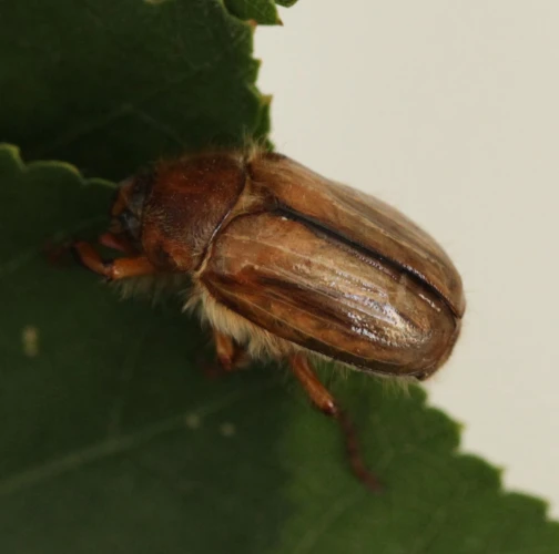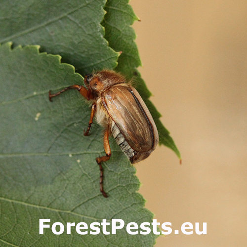 Ocher brown small chafer sitting on tree leaves. Active at dusk in summer. Whitish larvae on plant roots. Damage to leaves and roots.