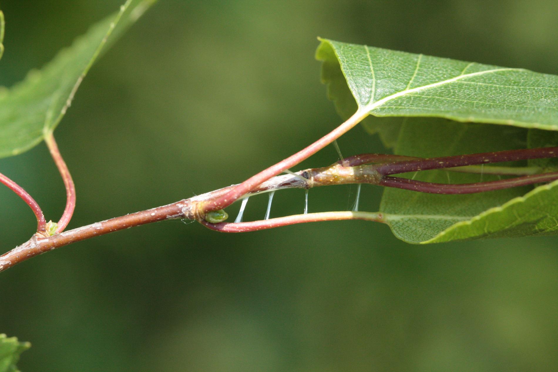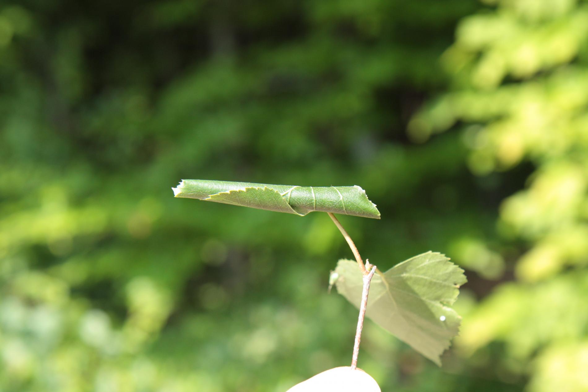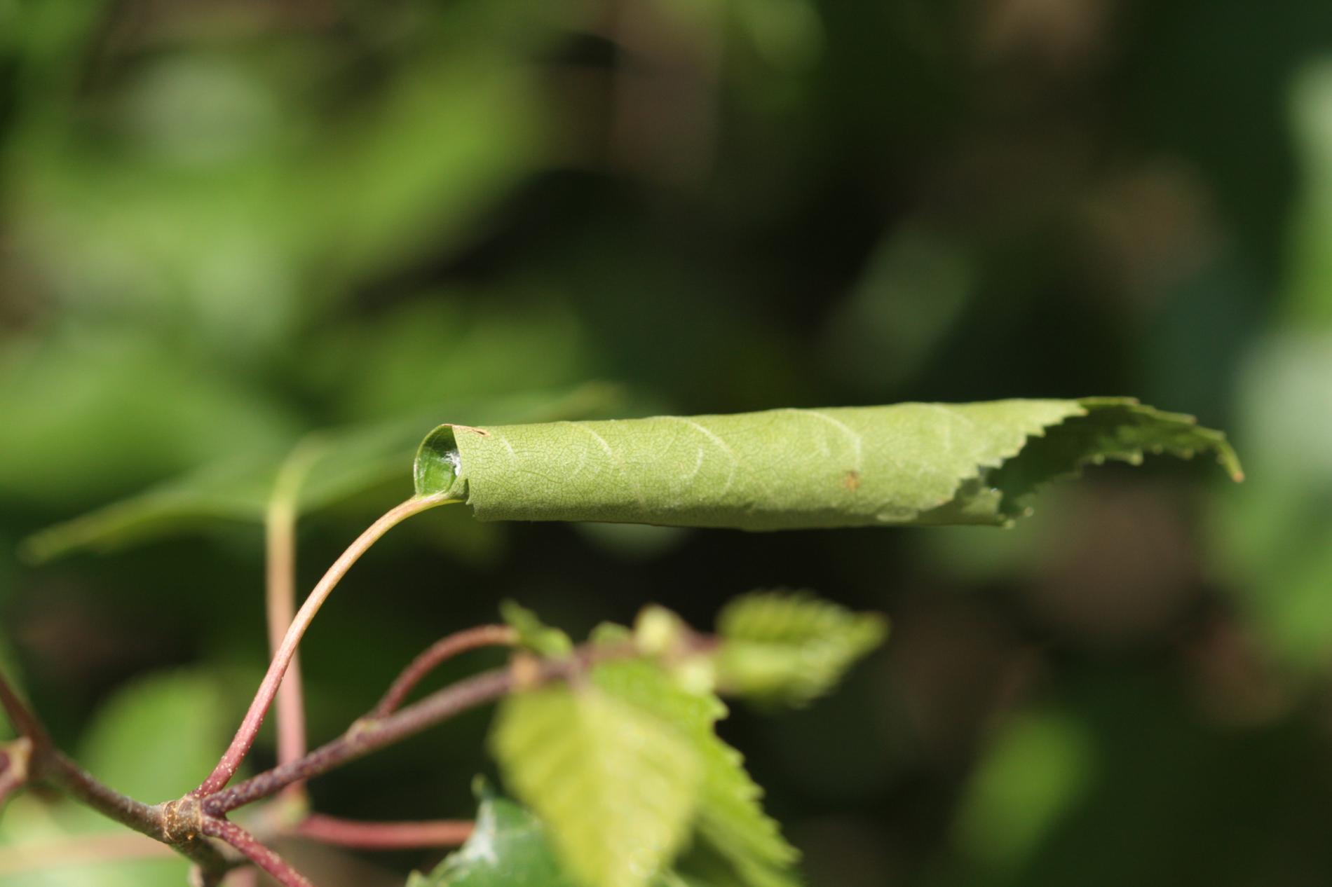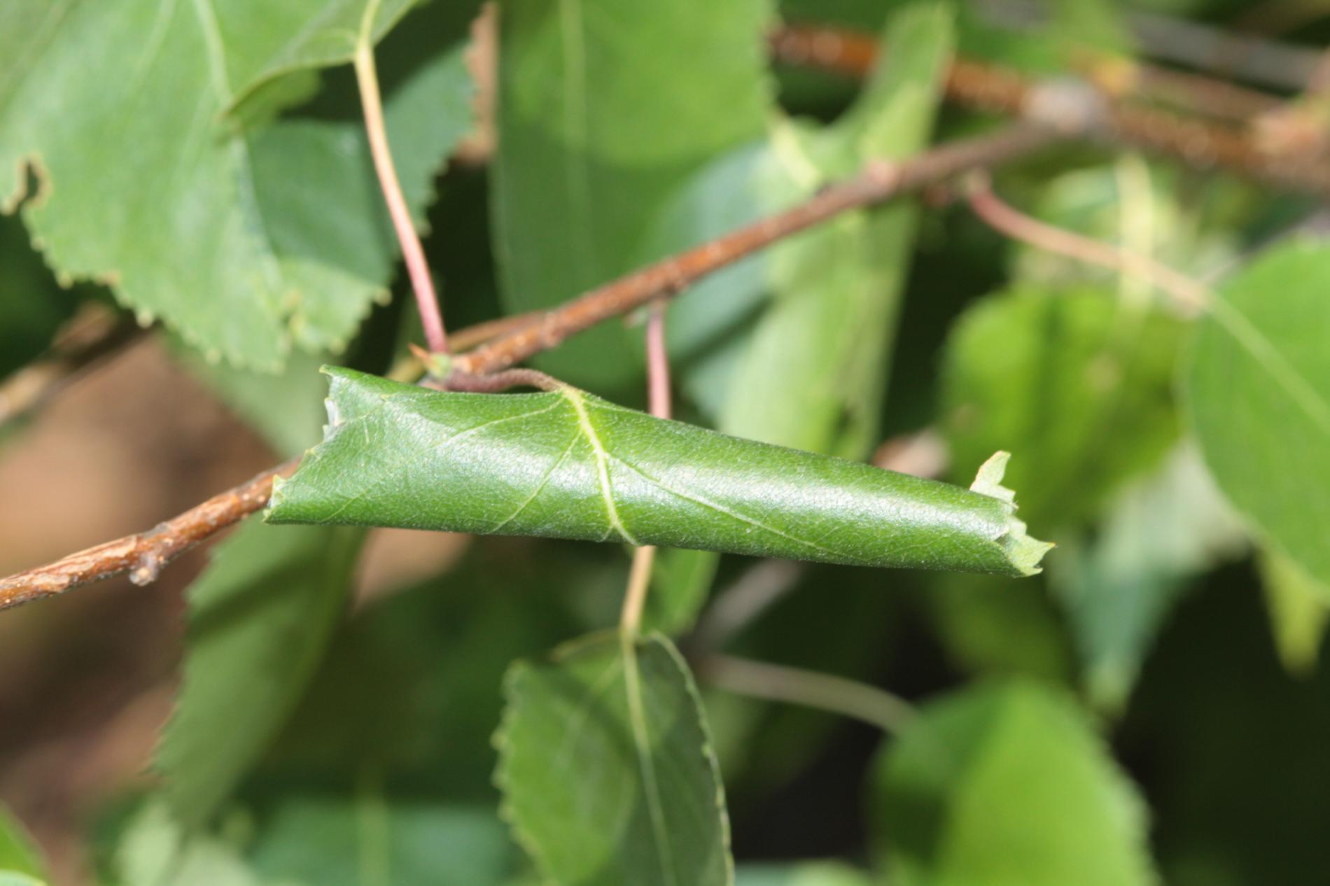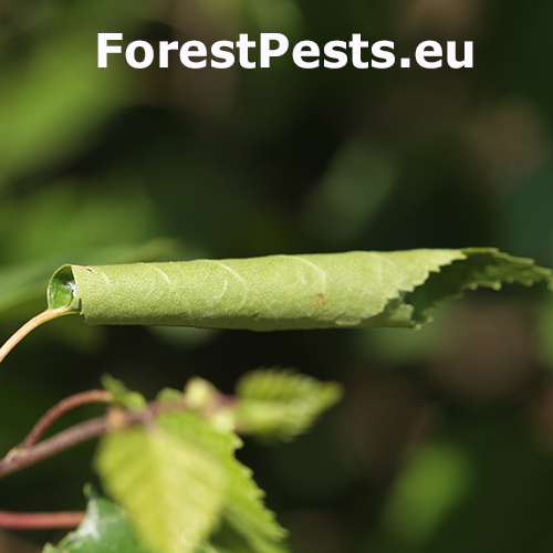 Larvae exhibit a unique behavior where they roll a leaf of their host plant predominantly (but not exclusively) longitudinally along the midrib, creating a sheltered feeding area. It is very typical that the leaf is kept rolled up with the help of short white ties made of white fibers, which the caterpillar uses to strengthen the leaf blade. These white ties are typical also for other species of Gelechidae and are not found in species of Tortricidae, which also curl leaves in a similar manner.