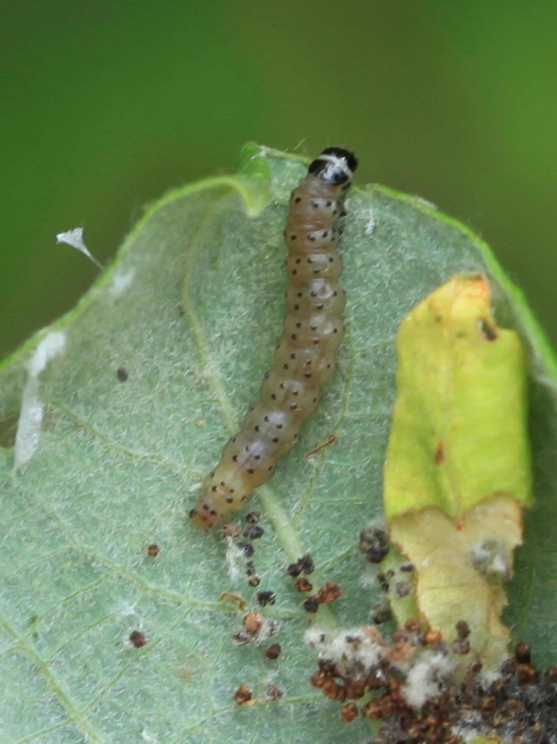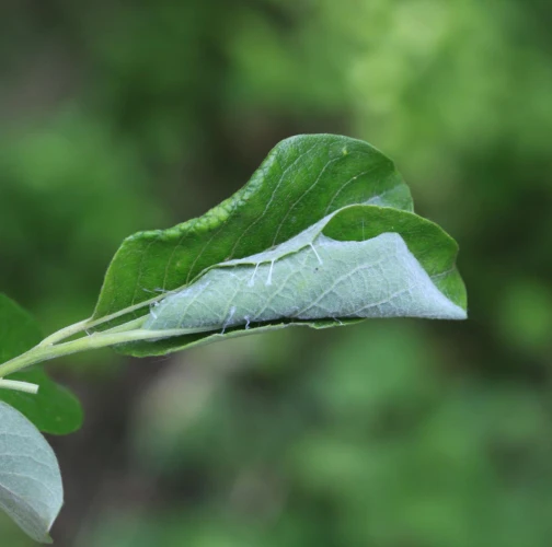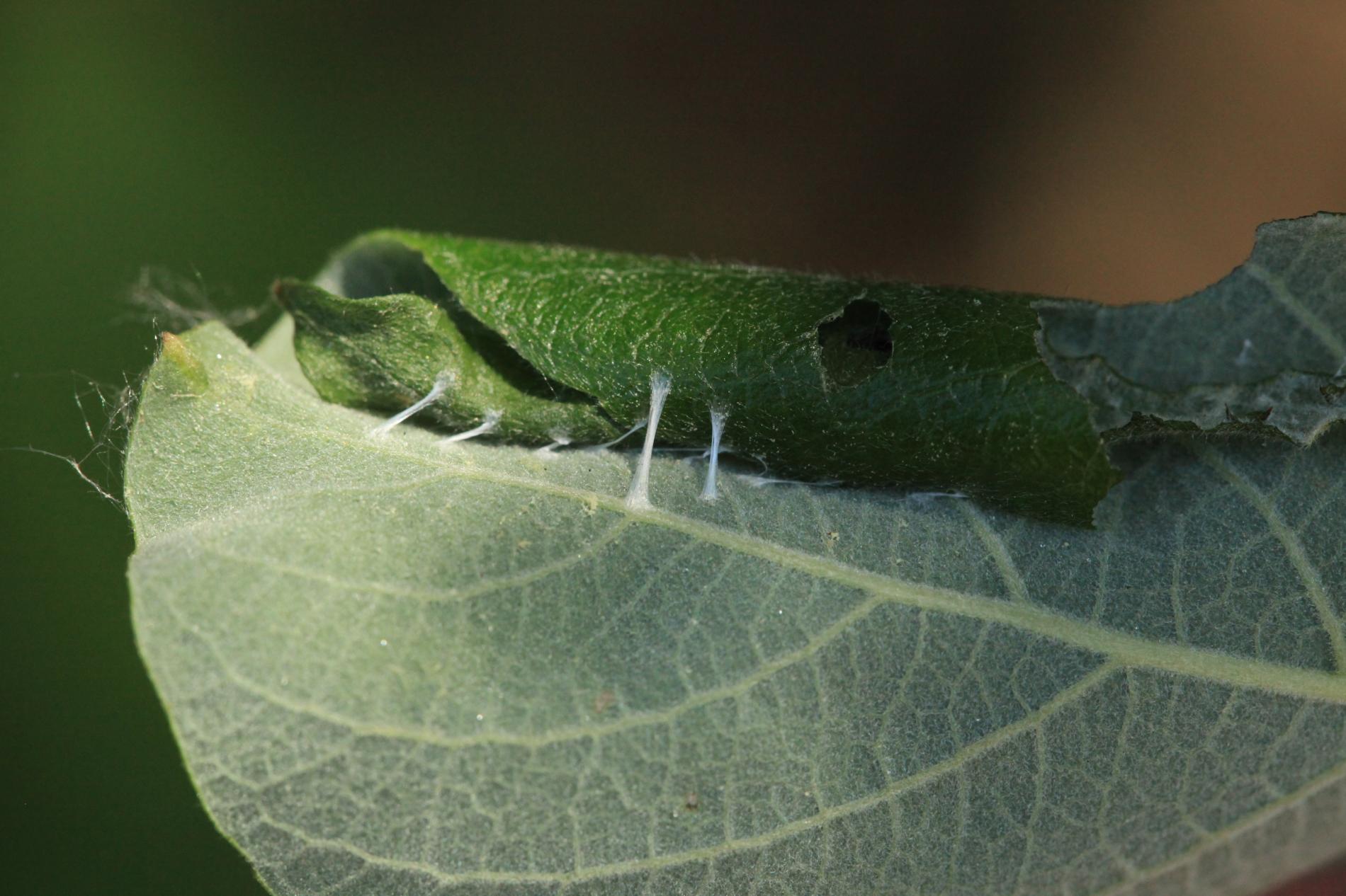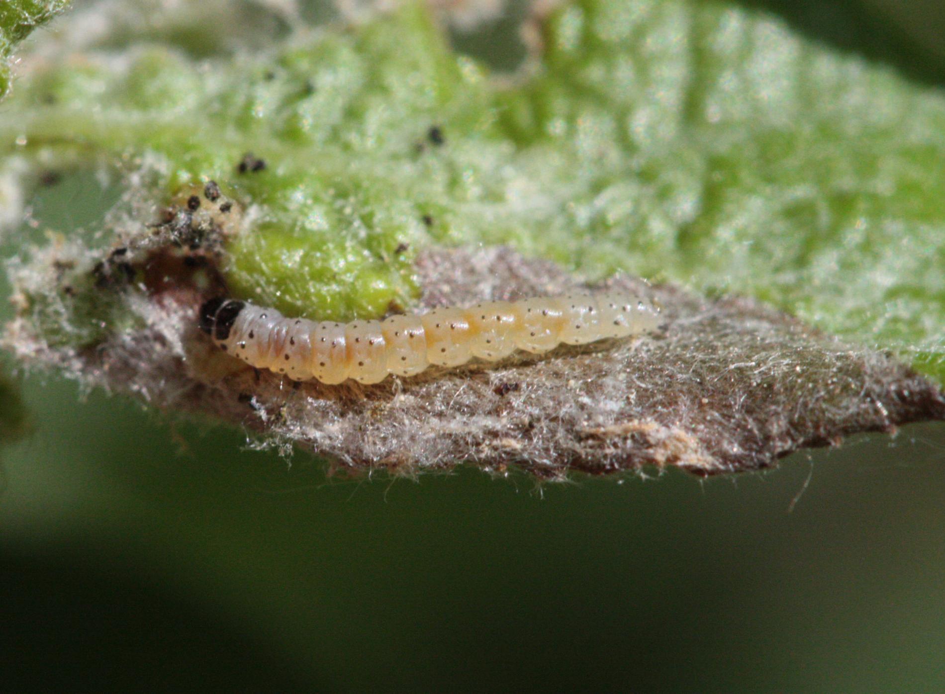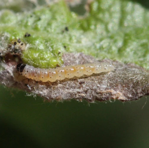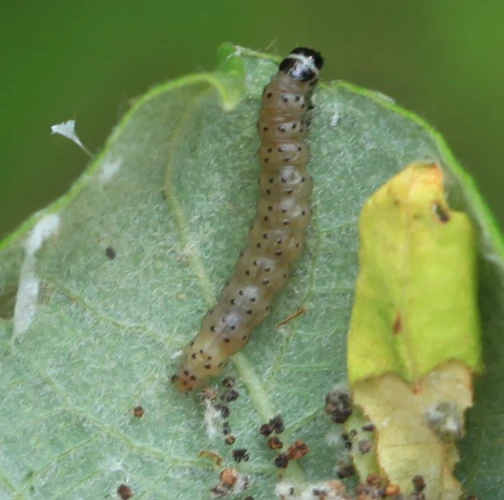 Larvae exhibit a unique behavior where they roll a leaf of their host plant predominantly (but not exclusively) longitudinally along the midrib, creating a sheltered feeding area. It is very typical that the leaf is kept rolled up with the help of short white ties made of white fibers, which the caterpillar uses to strengthen the leaf blade. These white ties are typical also for other species of Gelechidae and are not found in species of Tortricidae, which also curl leaves in a similar manner.
