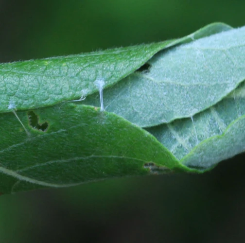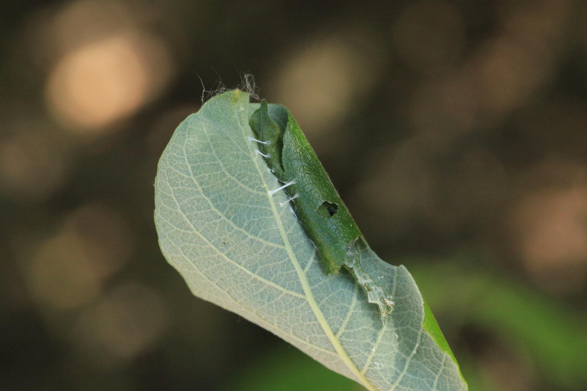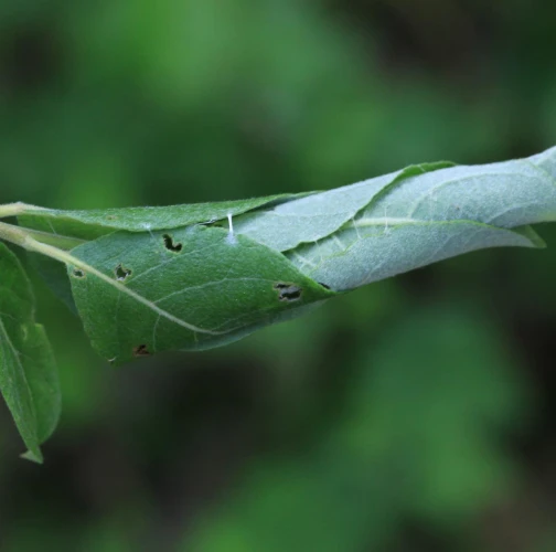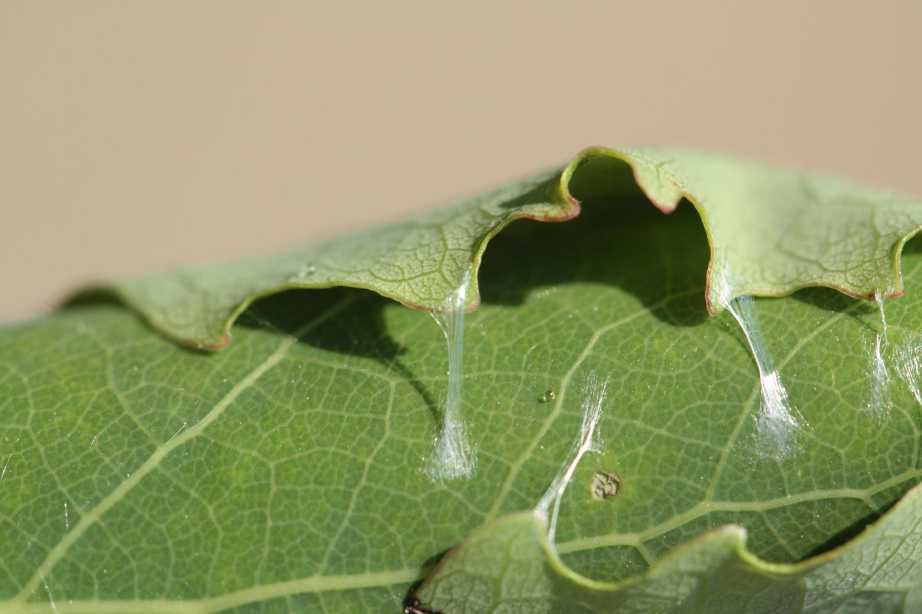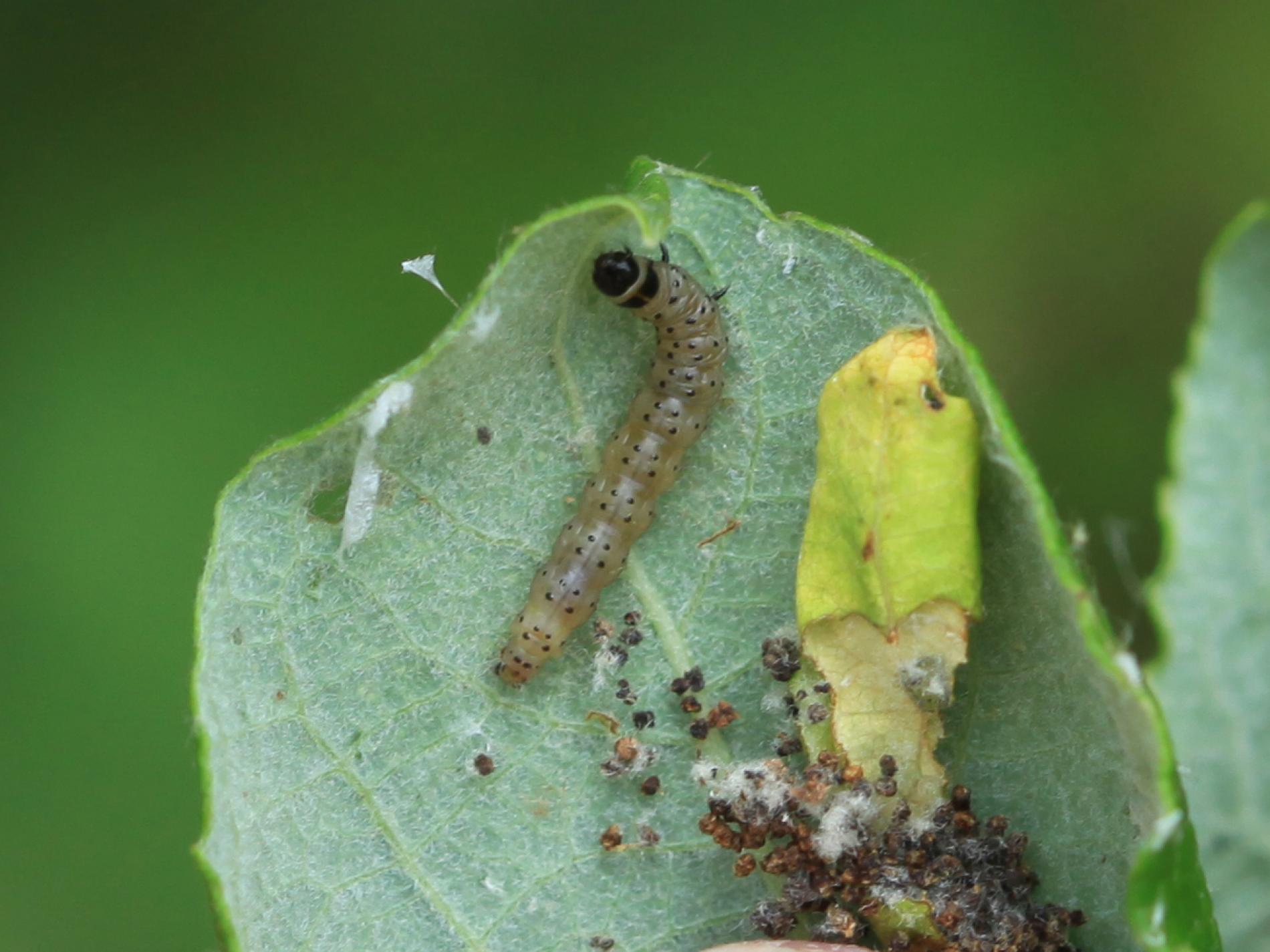 Larvae exhibit a unique behavior where they roll a leaf of their host plant predominantly (but not exclusively) longitudinally along the midrib, creating a sheltered feeding area. It is very typical that the leaf is kept rolled up with the help of short white ties made of white fibers, which the caterpillar uses to strengthen the leaf blade. These white ties are typical also for other species of Gelechidae and are not found in species of Tortricidae, which also curl leaves in a similar manner.