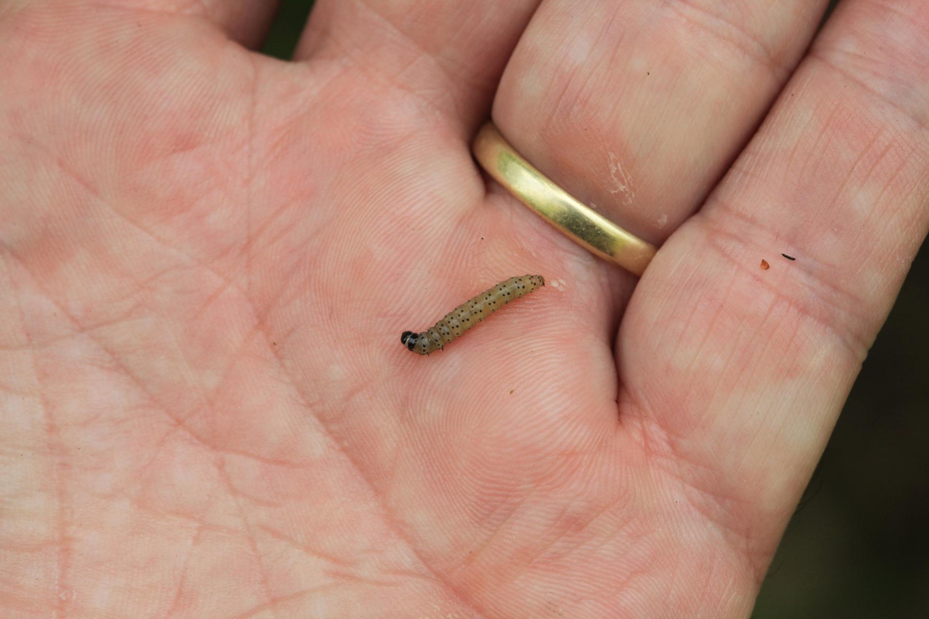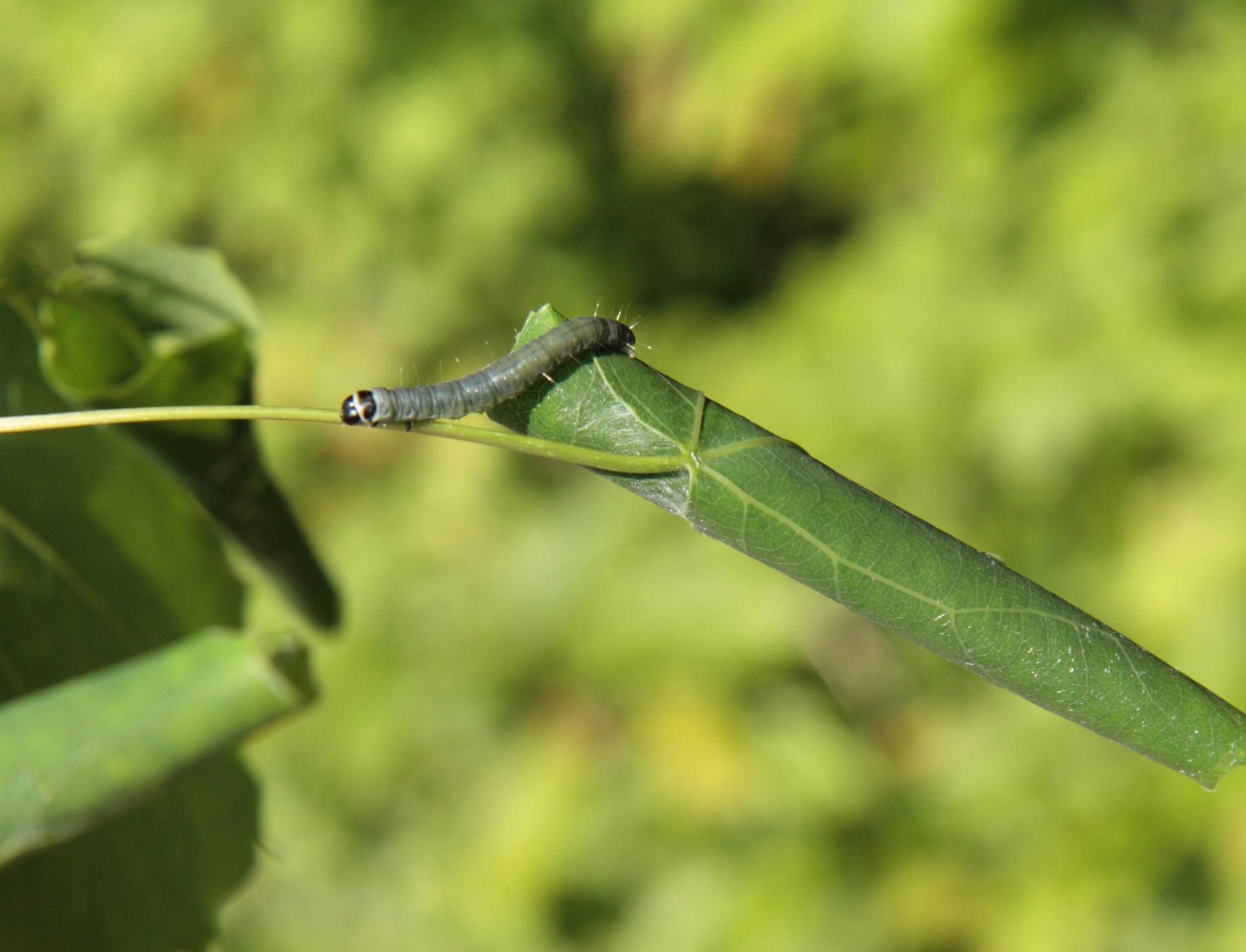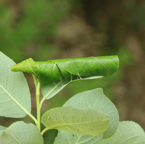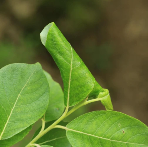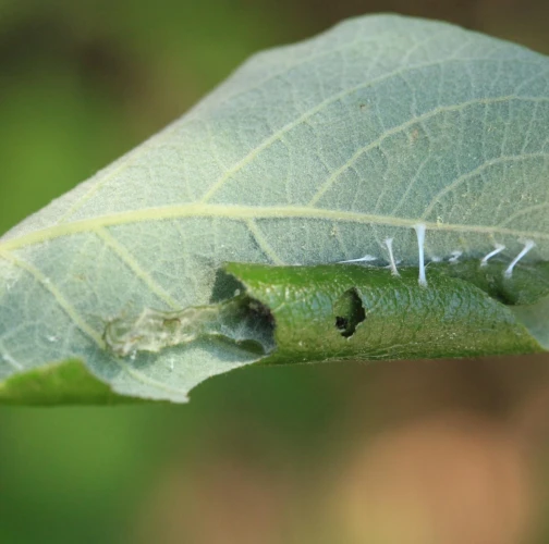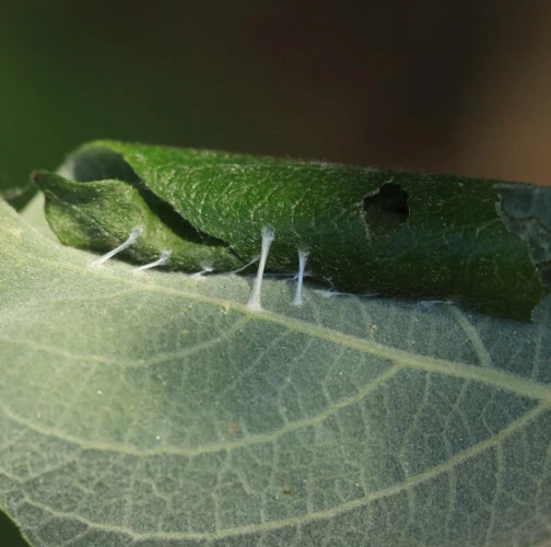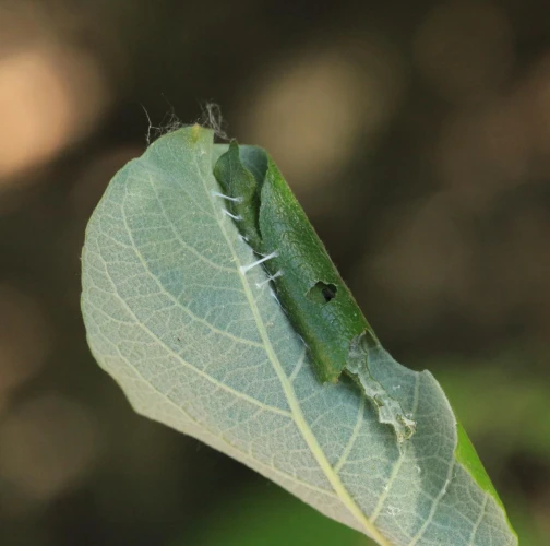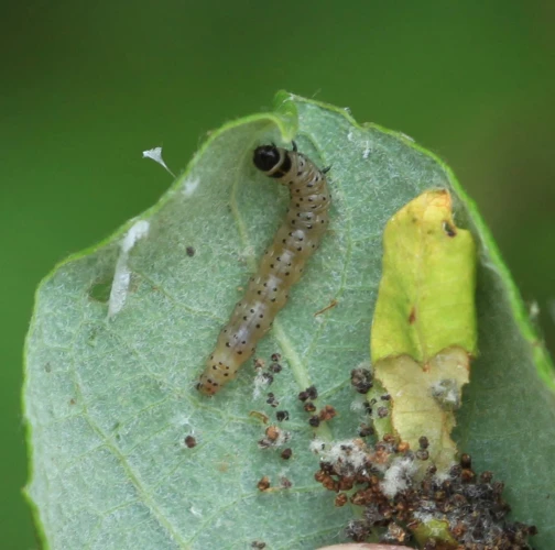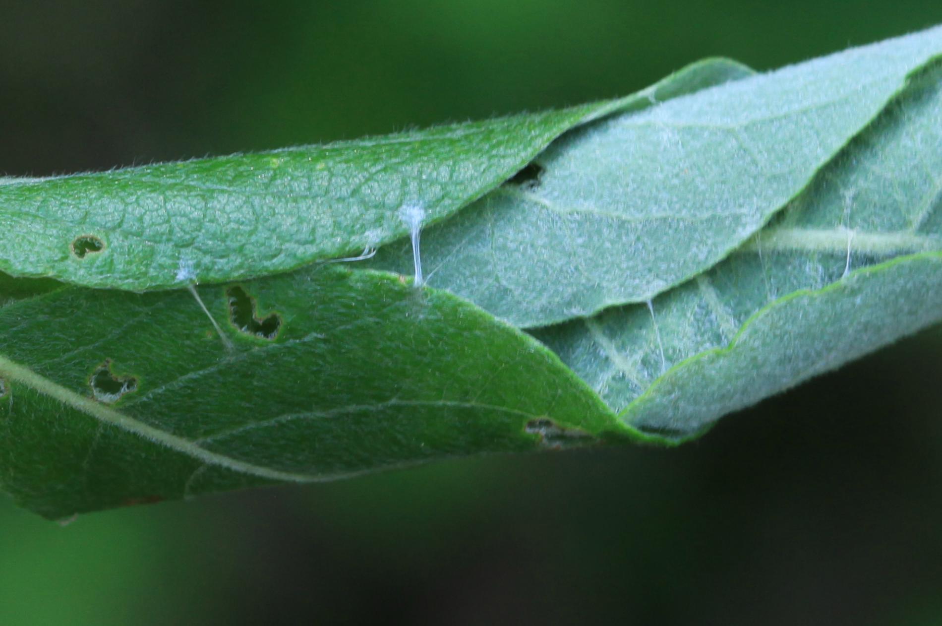 Larvae exhibit a unique behavior where they roll a leaf of their host plant predominantly (but not exclusively) longitudinally along the midrib, creating a sheltered feeding area. It is very typical that the leaf is kept rolled up with the help of short white ties made of white fibers, which the caterpillar uses to strengthen the leaf blade. These white ties are typical also for other species of Gelechidae and are not found in species of Tortricidae, which also curl leaves in a similar manner.