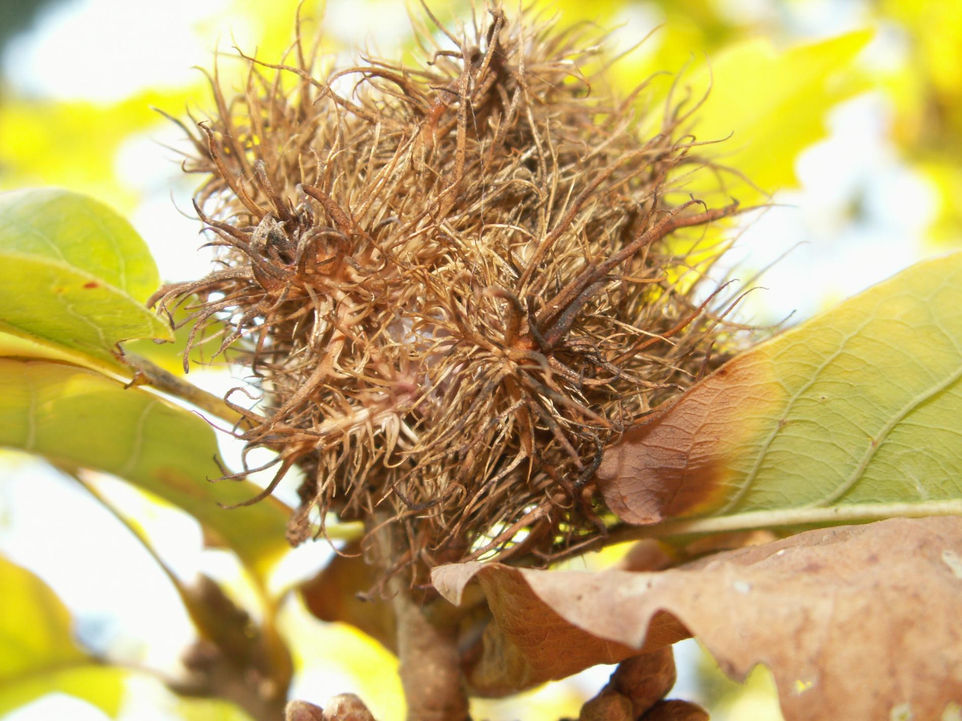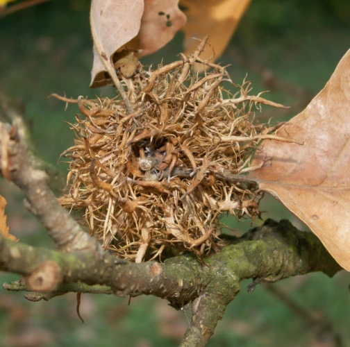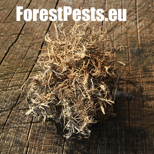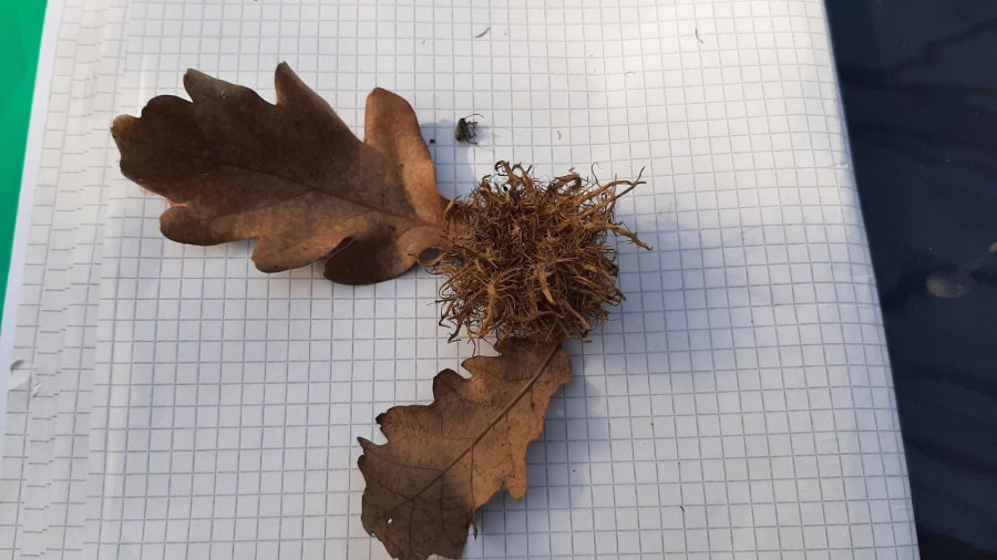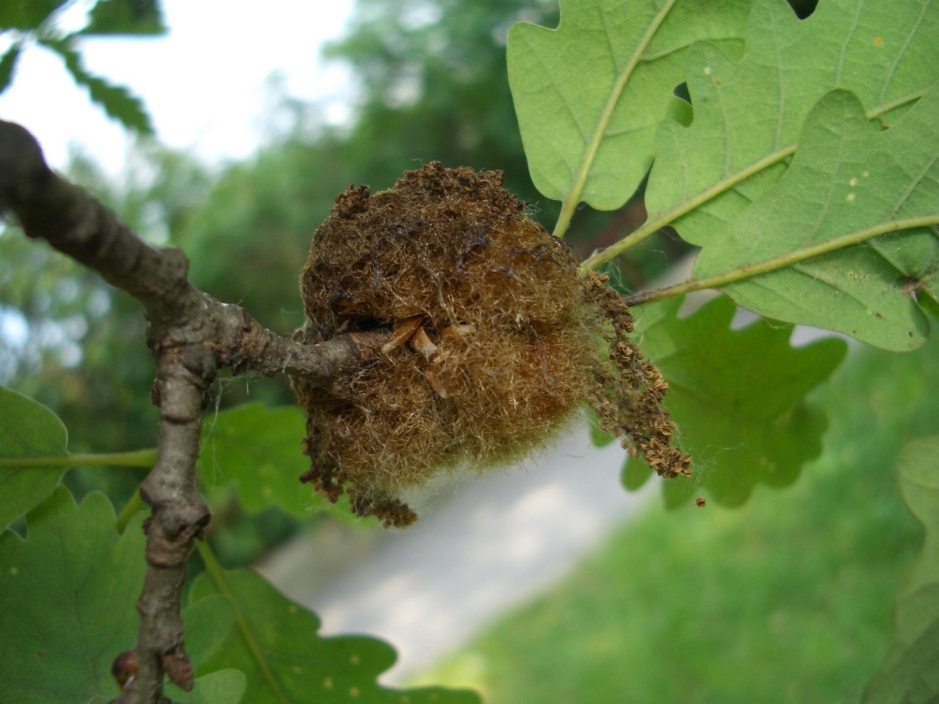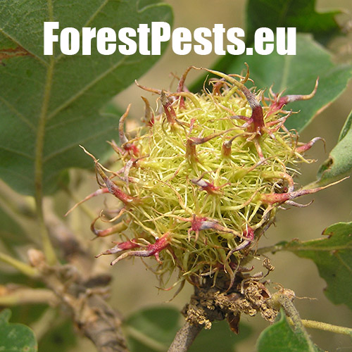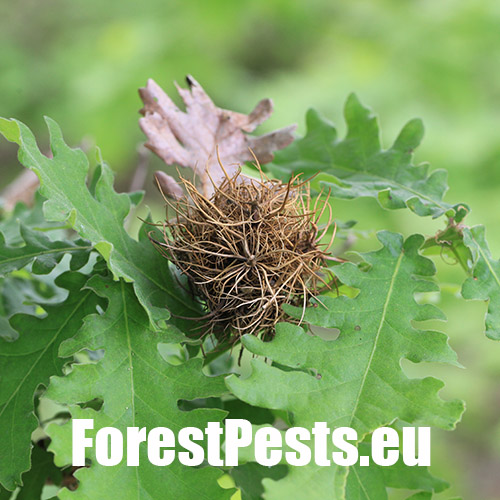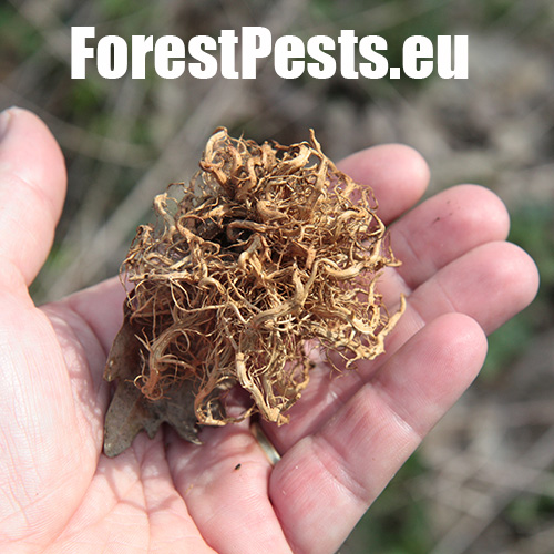 A spectacular gall is formed by this species. Known only from the bud galls of the asexual generation. A bud changes into a “hairy” gall with a lot of outgrowths. Individual galls may reach 6 cm in diameter and are single-chambered. Young galls are bright pink and sticky, mature are brown and sticky.The larva develops inside the gall. The gall remains on a tree for more years. Diplolepis rosae creates very similar galls on roses.