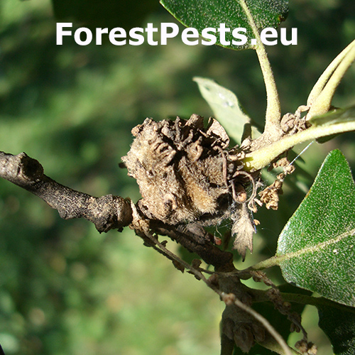 The galls of the sexual generation develop in spring as a result of excessive hypertrophic growth of terminal or lateral shoot buds. These buds transform into ovoid or nearly spherical swellings, ranging from 10 to 40 mm in diameter. Often, multiple galls merge, forming large clusters exceeding 50 mm. Young galls are light green, gradually darkening to dark green and eventually turning brown as they mature. Deformed or normal leaves may be present on their upper part. The sexual generation occurs primarily on Q. cerris, producing galls very similar to those of A. multiplicatus.