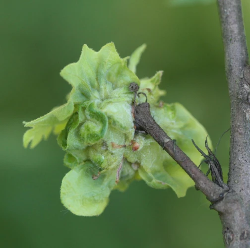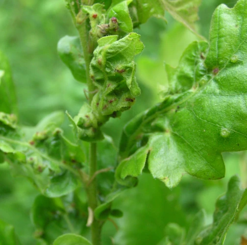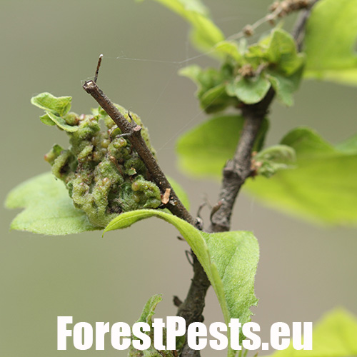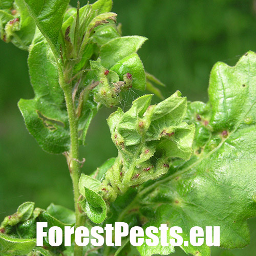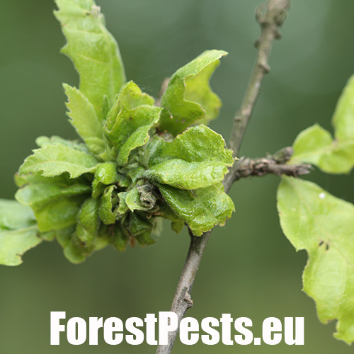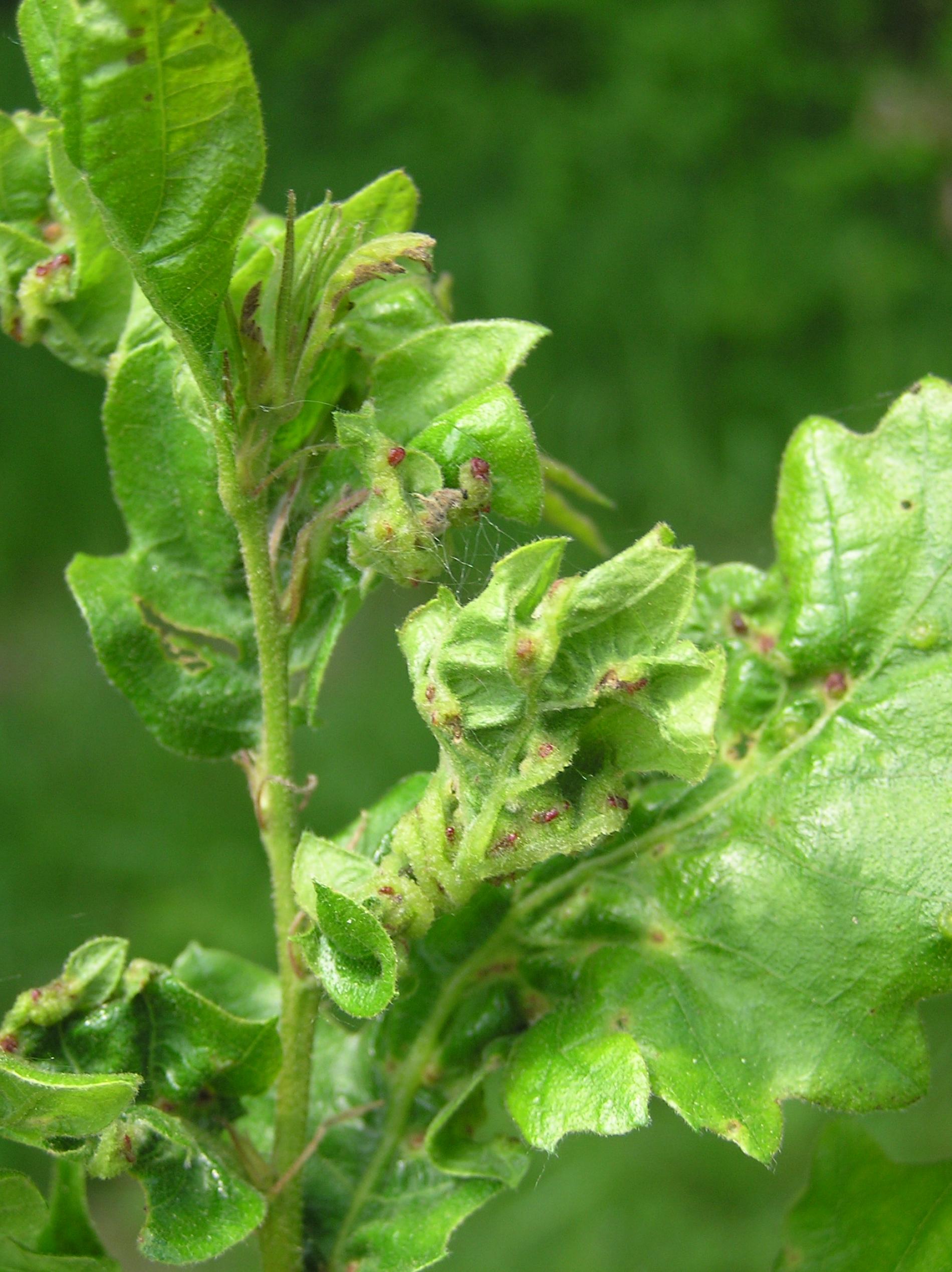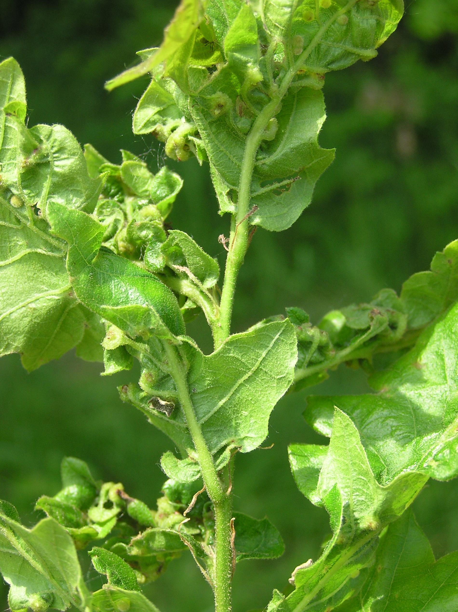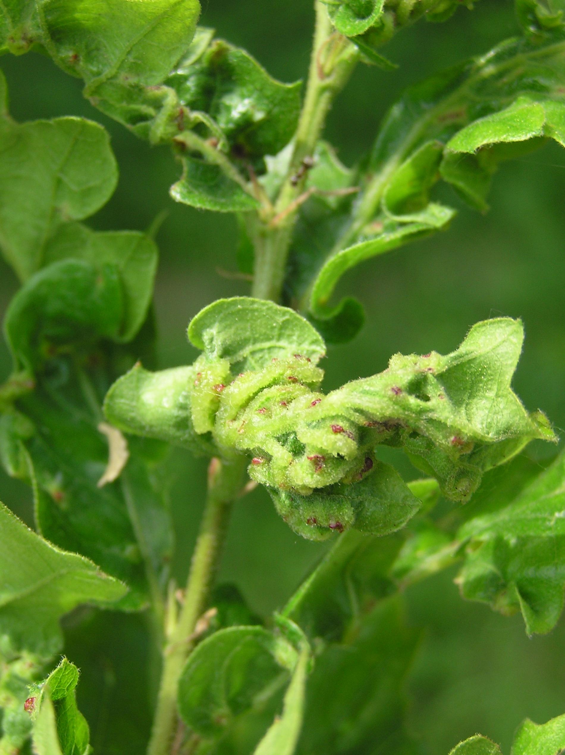 The leaves are thickened; in some places they have greenish red swellings. Deformations and tumorous thickening affect leaves blades and also stalks.