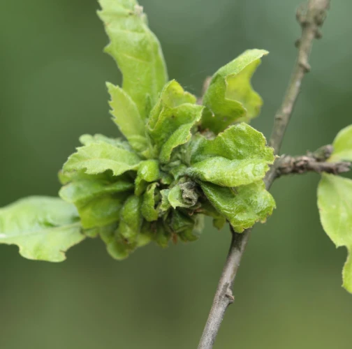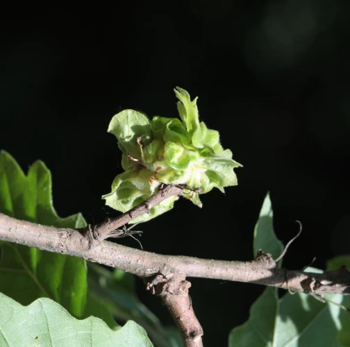 On the Turkey oak leaves are formed irregular deformations. The leaves are thickened; in some places they have greenish red swellings. Deformations and tumorous thickening affect leaves blades and also stalks.