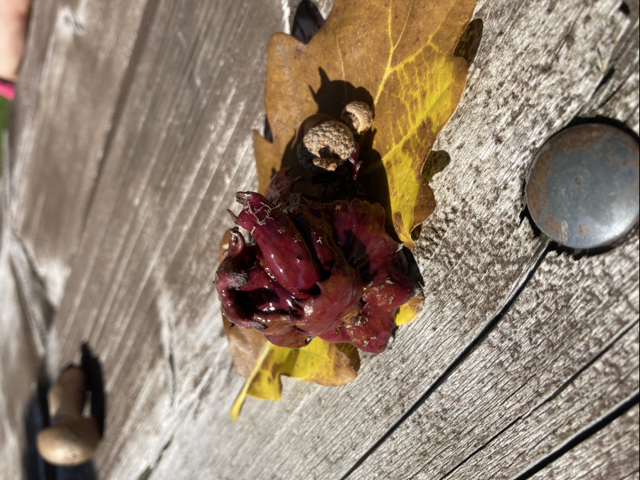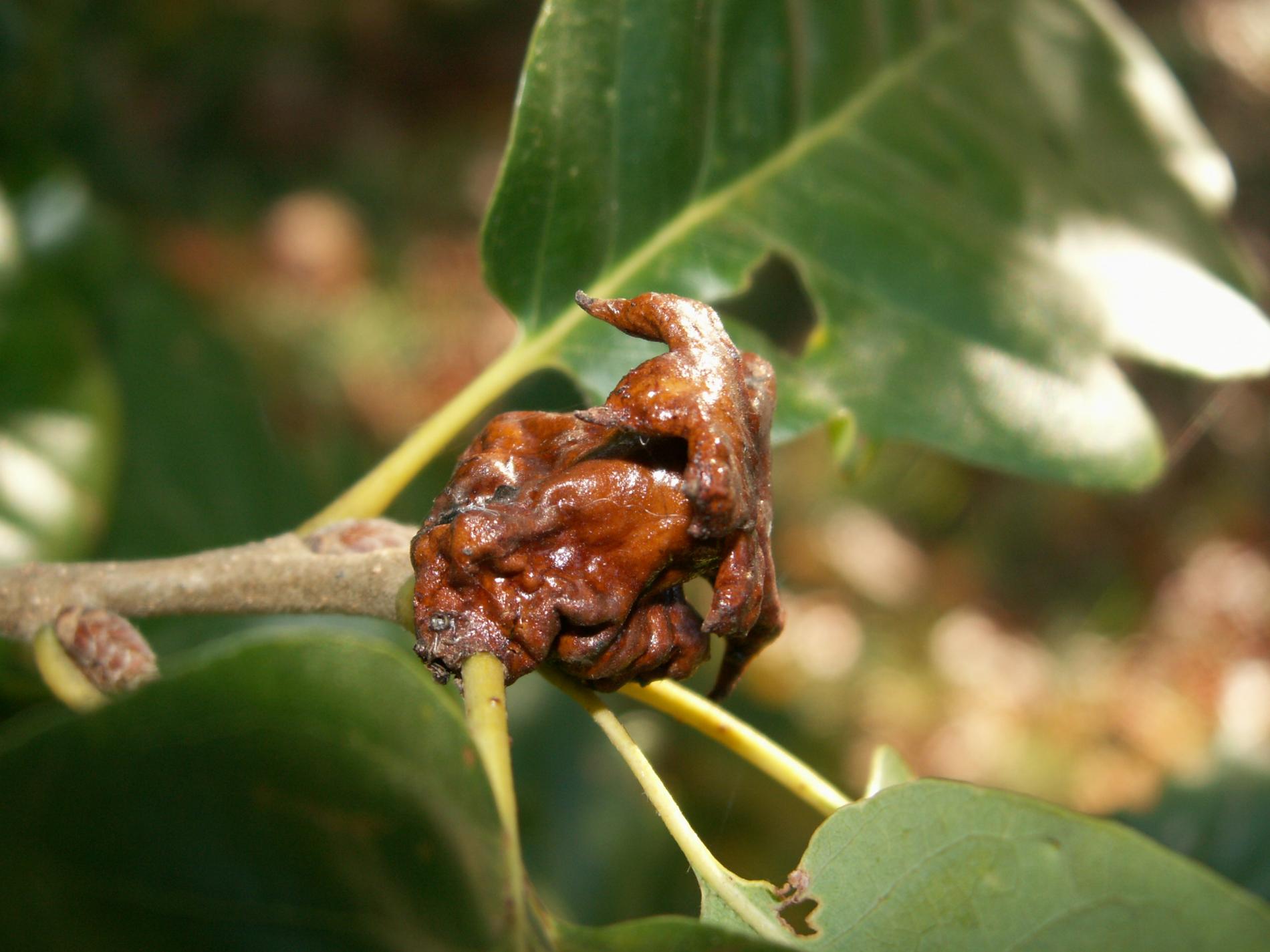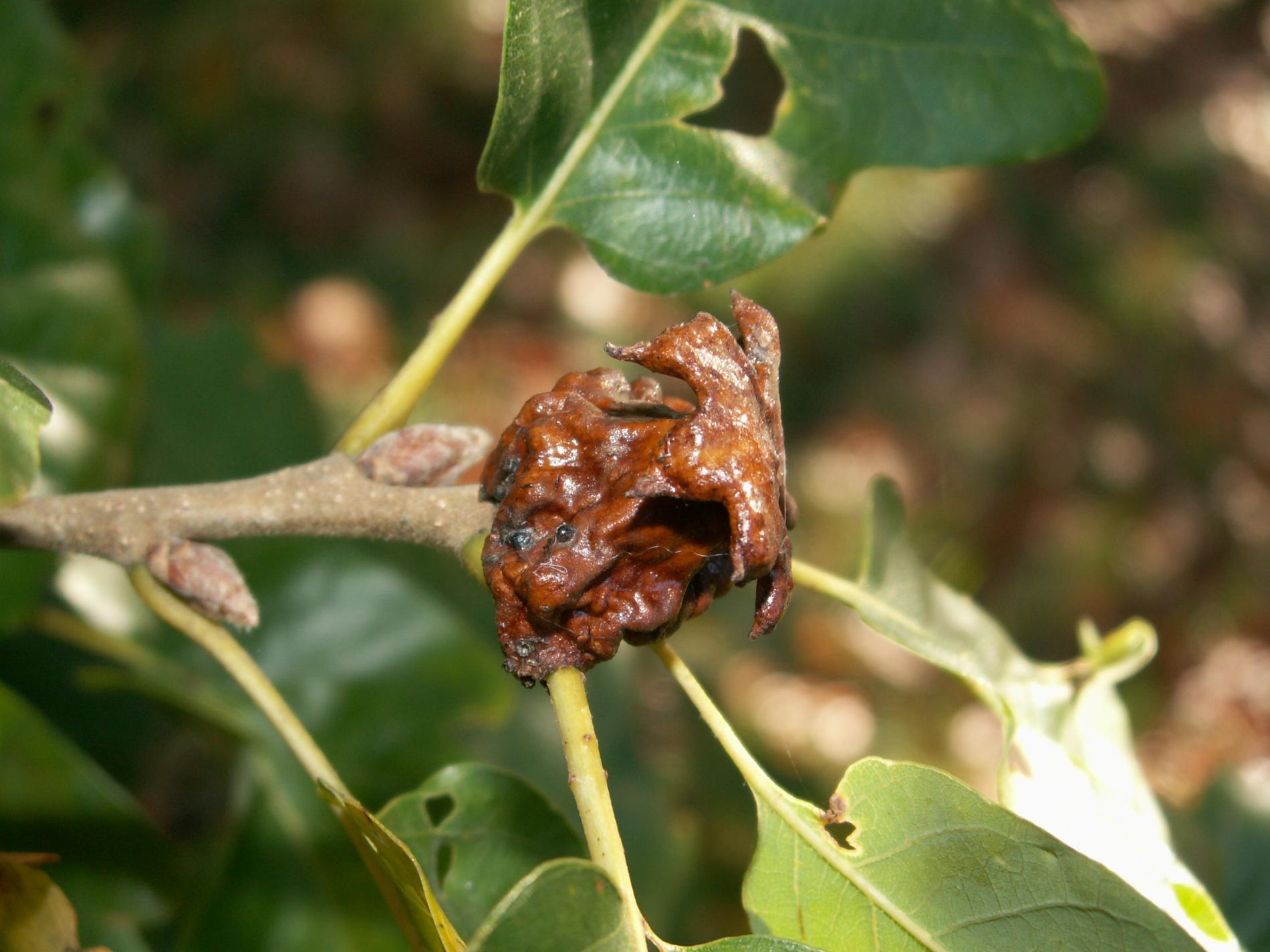 Shiny, brown-red galls on acorns.