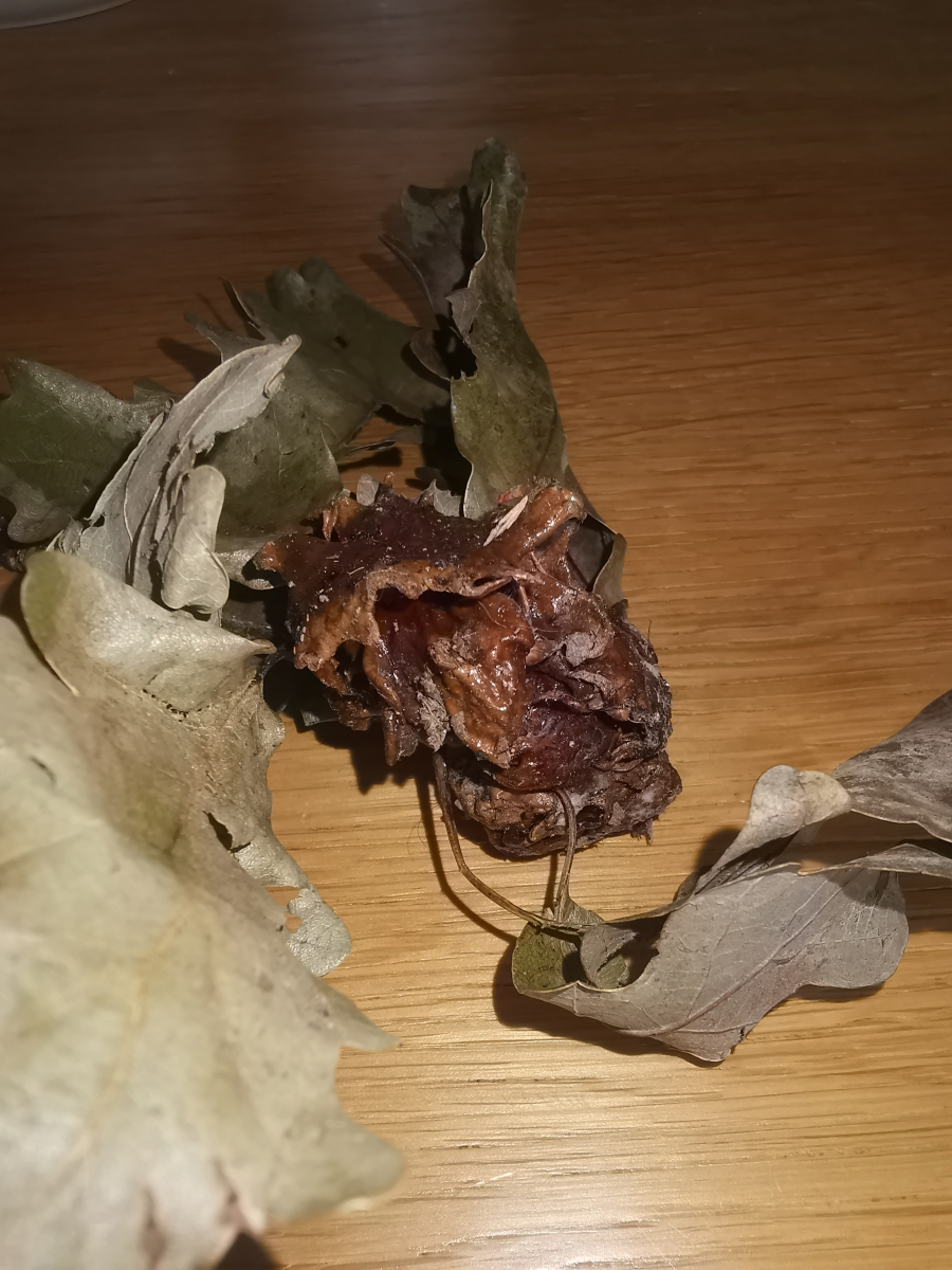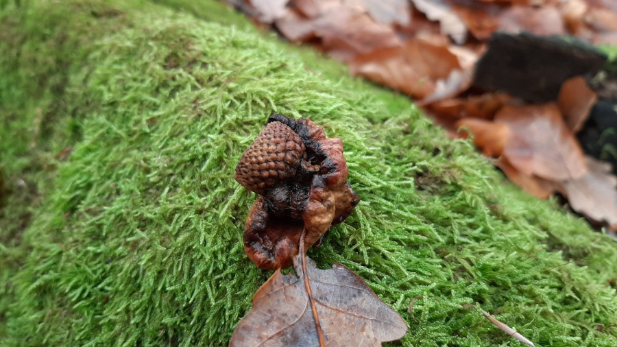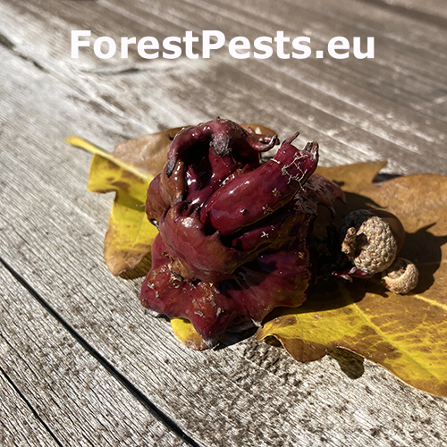 The gall is caused by Andricus dentimitratus on acorns. Its larva lives inside the gall. More often can be seen on acorns also another, related and similar species - Andricus quercuscalicis. Andricus dentimitratus is more abundant in southern Europe, in the Mediterranean, but also lives in Central Europe. It can damage most acorns in a tree, which can be a problem if the oak seed is expected to be used for natural regeneration in the next forest. The occurrence of this gall does not influence significantly the health status of the tree.