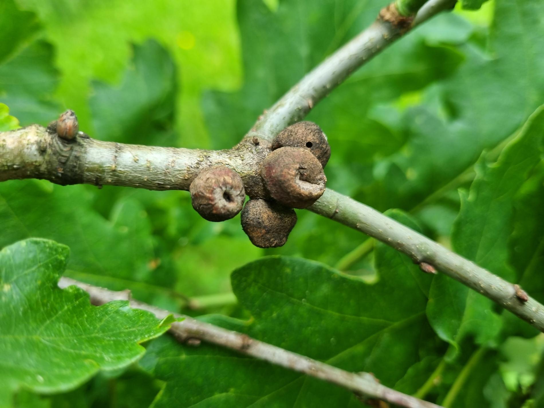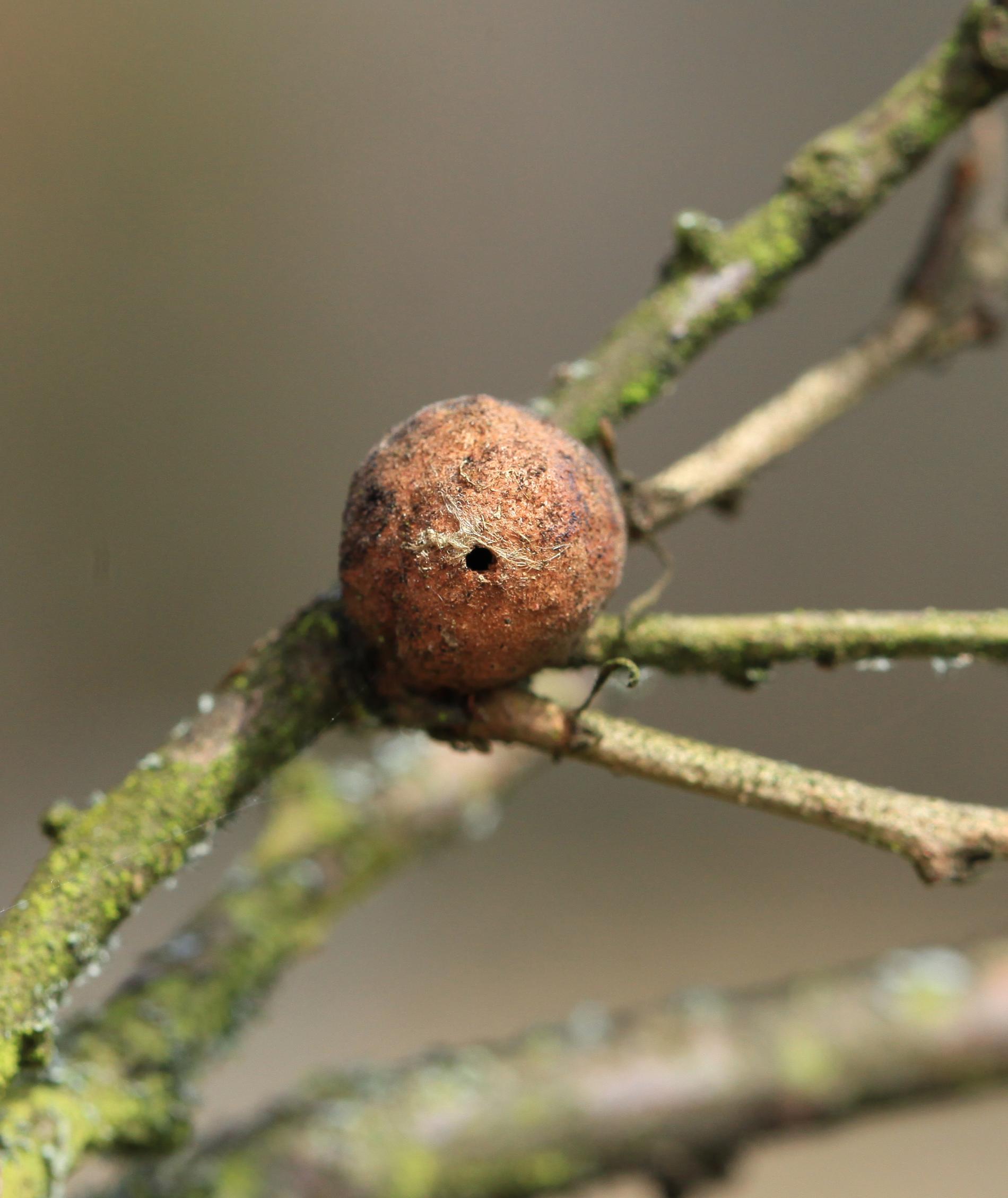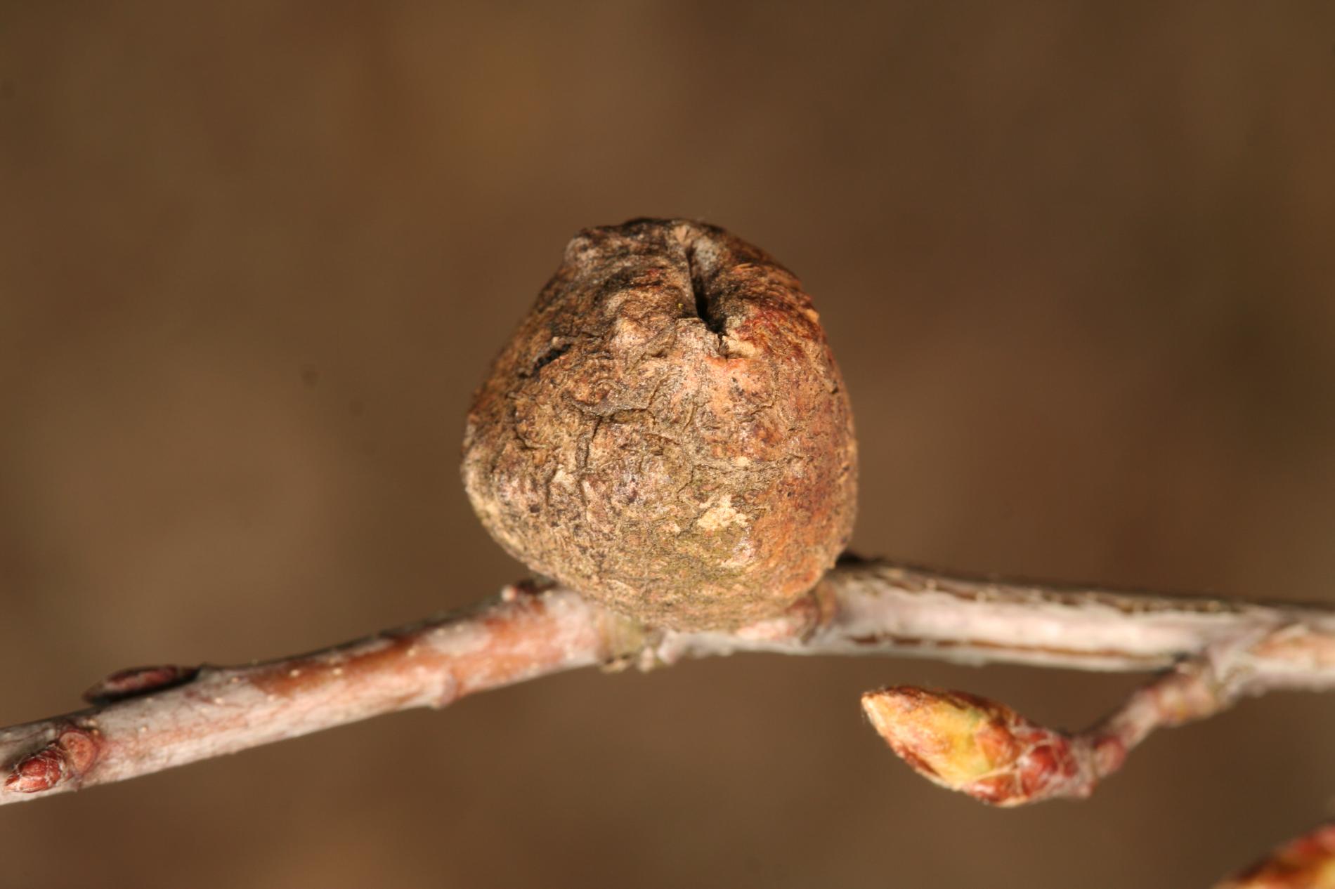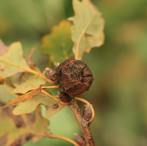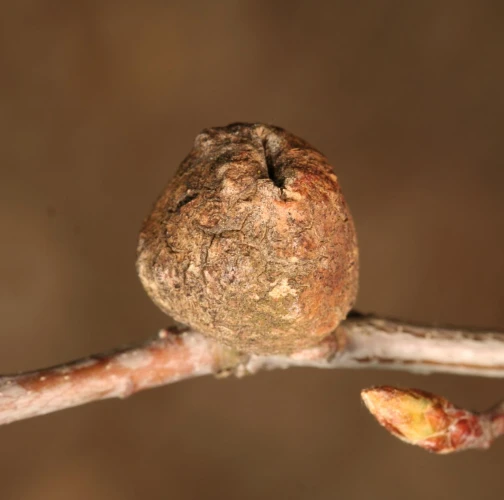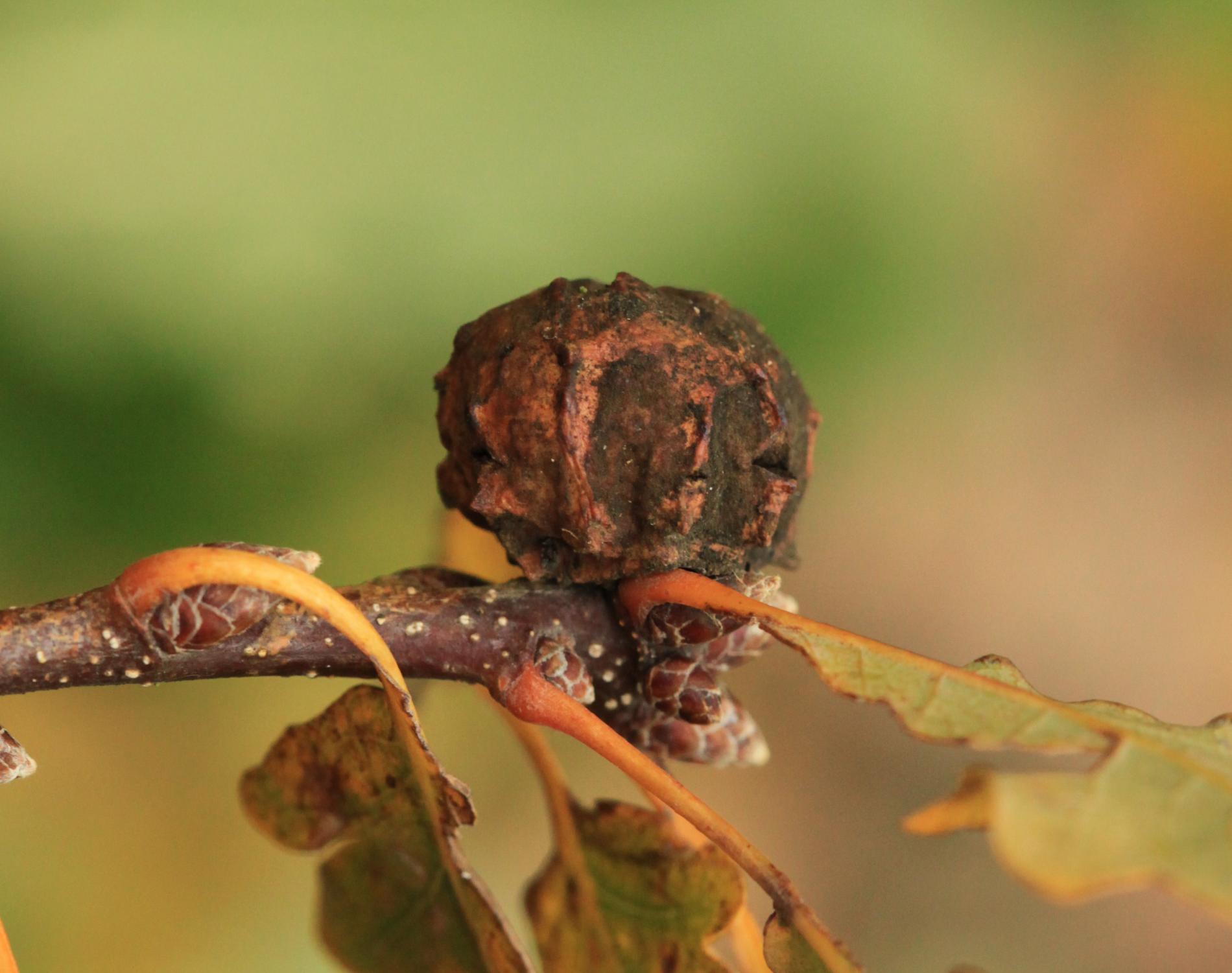 The species forms 10-15 mm high, small barrel-like gall on oak twigs.