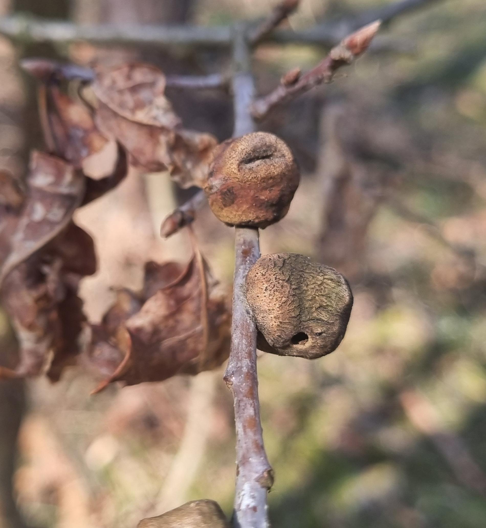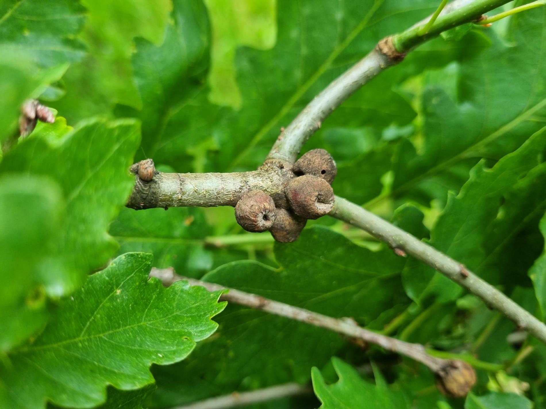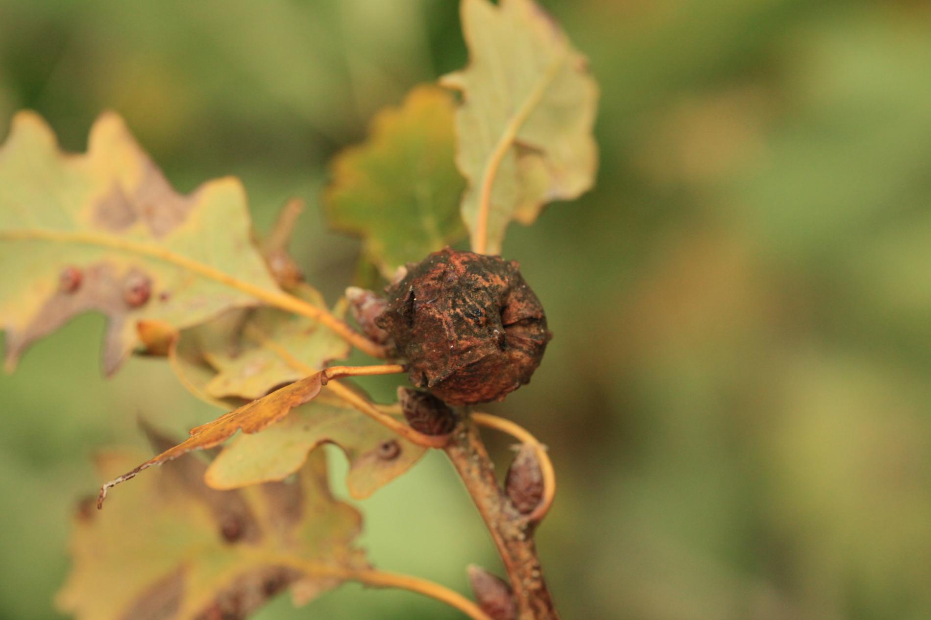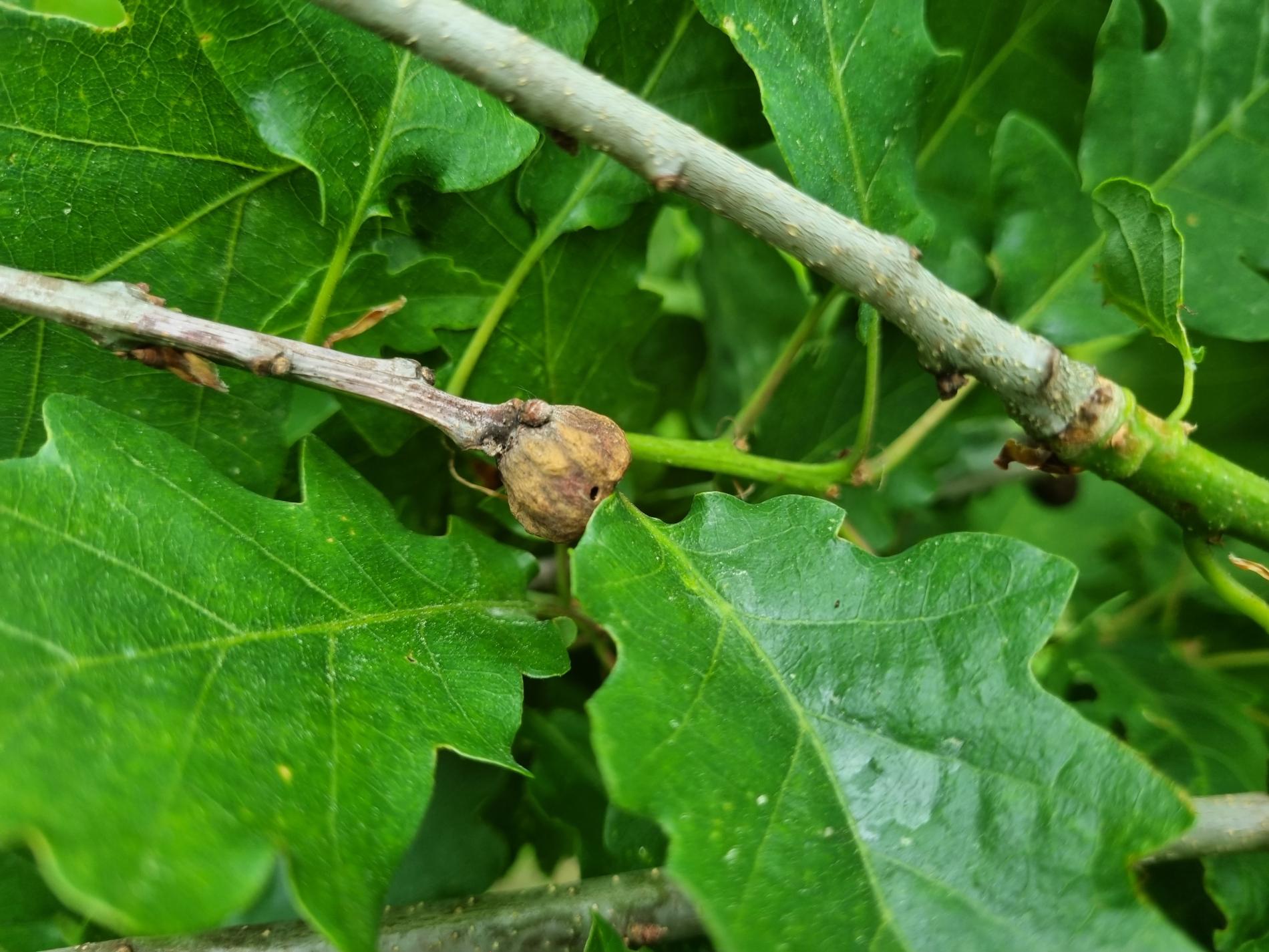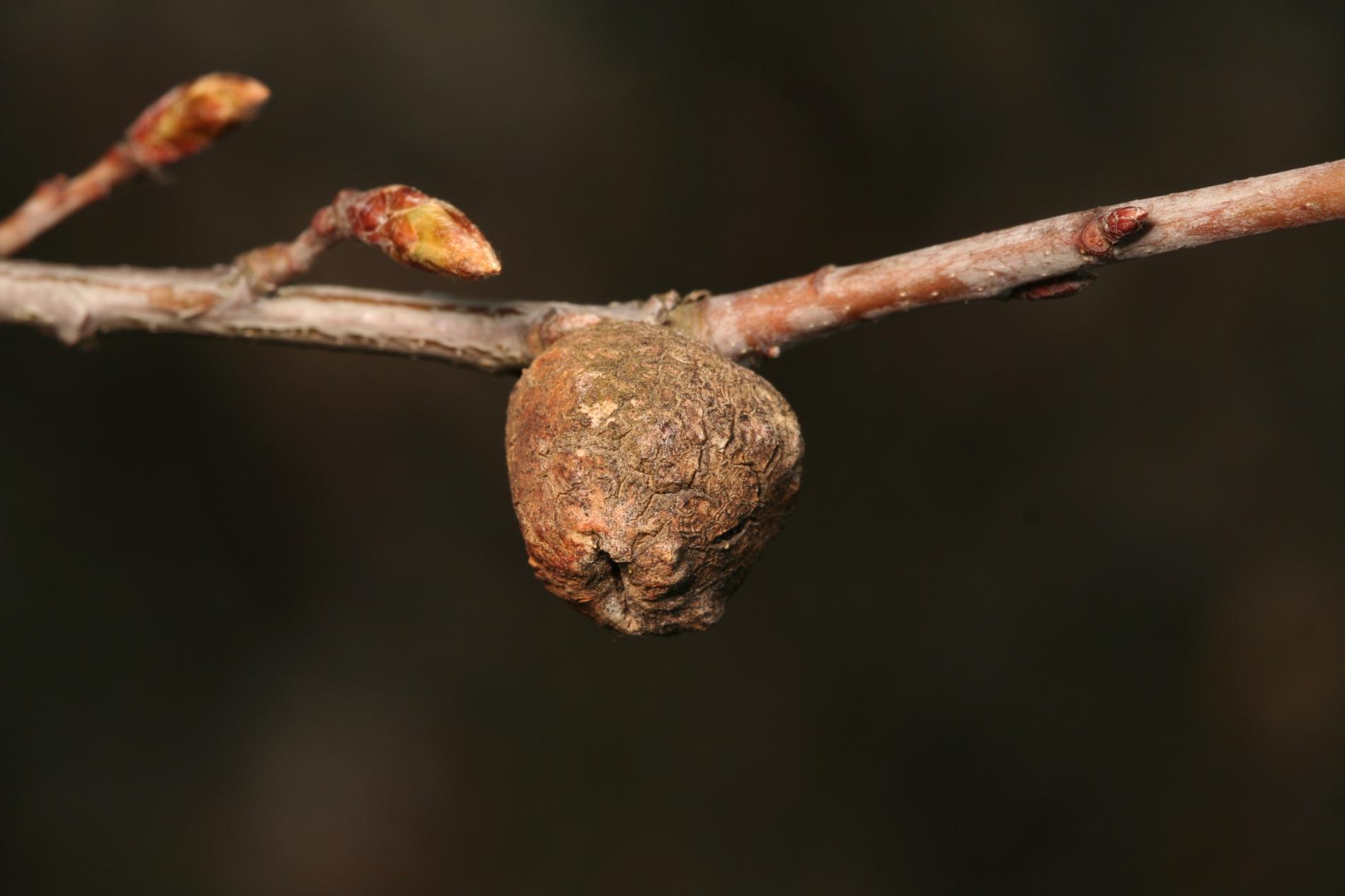 The species forms 10-15 mm high, small barrel-like gall on oak twigs.