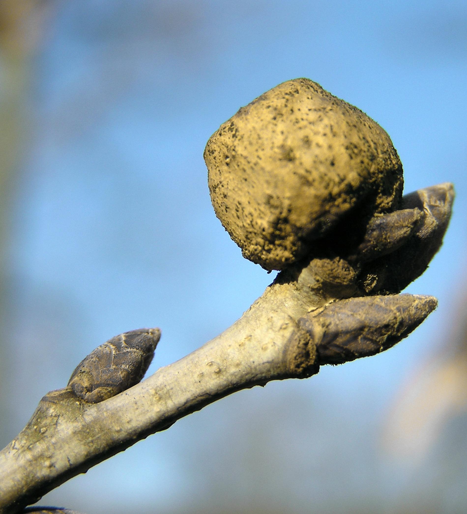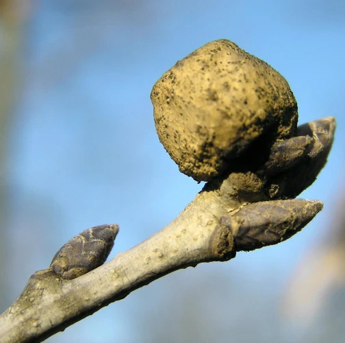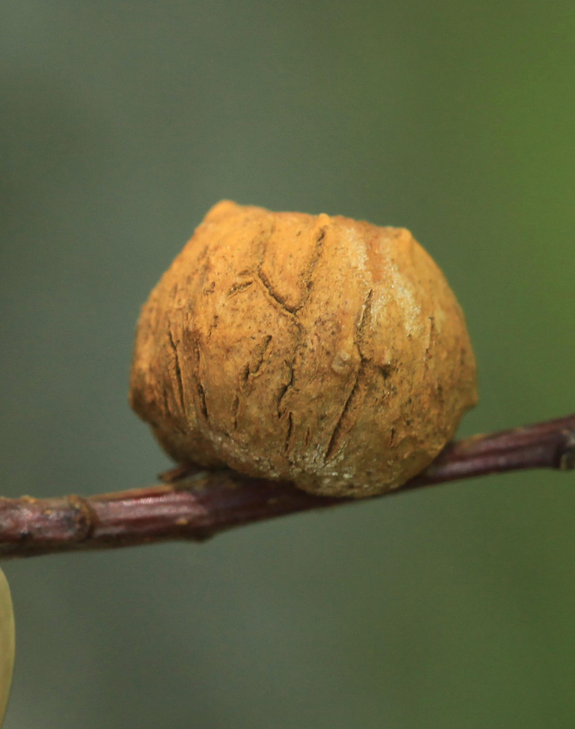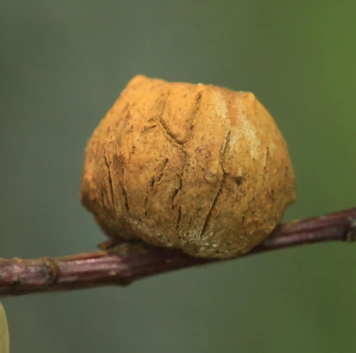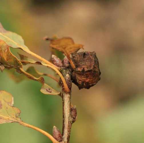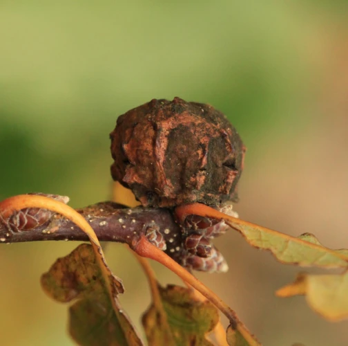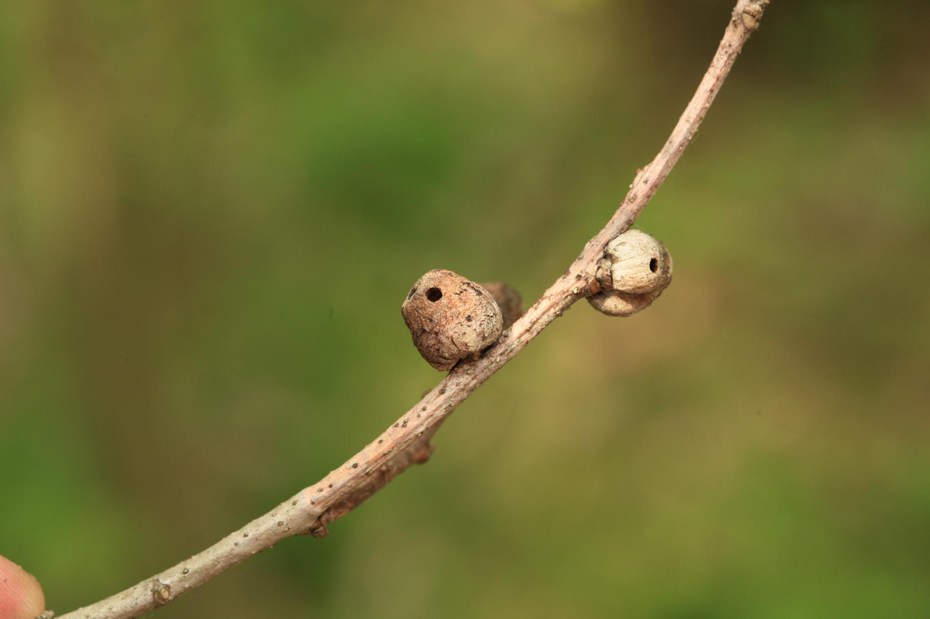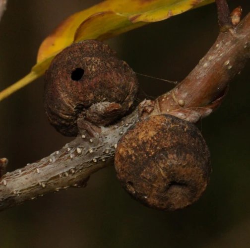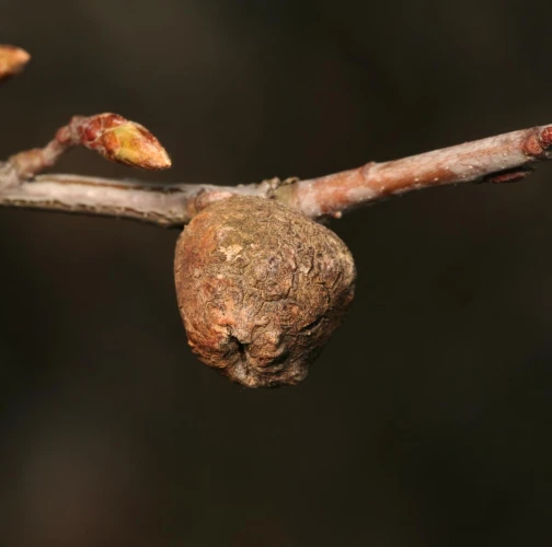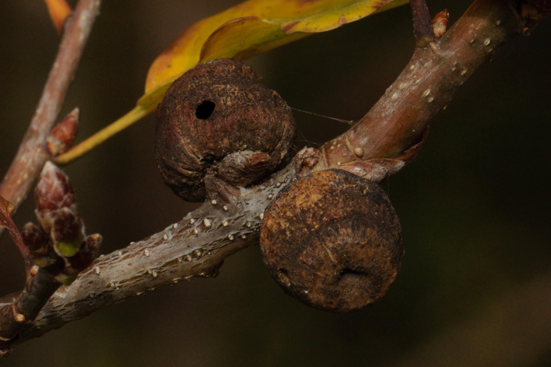 The species forms 10-15 mm high, small barrel-like gall on oak twigs.