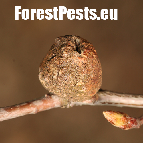 The species forms 10-15 mm high, small barrel-like gall on oak twigs. It broadens out towards its base. From the upper side is visible a distinct cavity. It is green, later brown. Adults hatch in spring. It is common all over Central Europe.