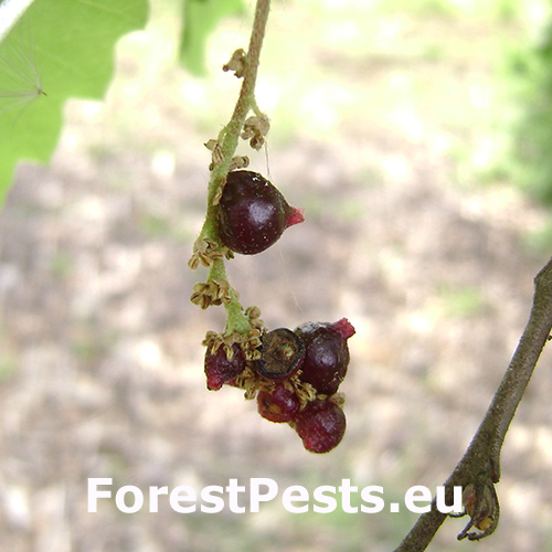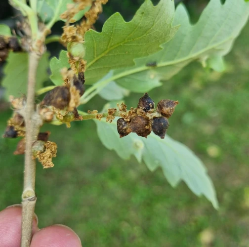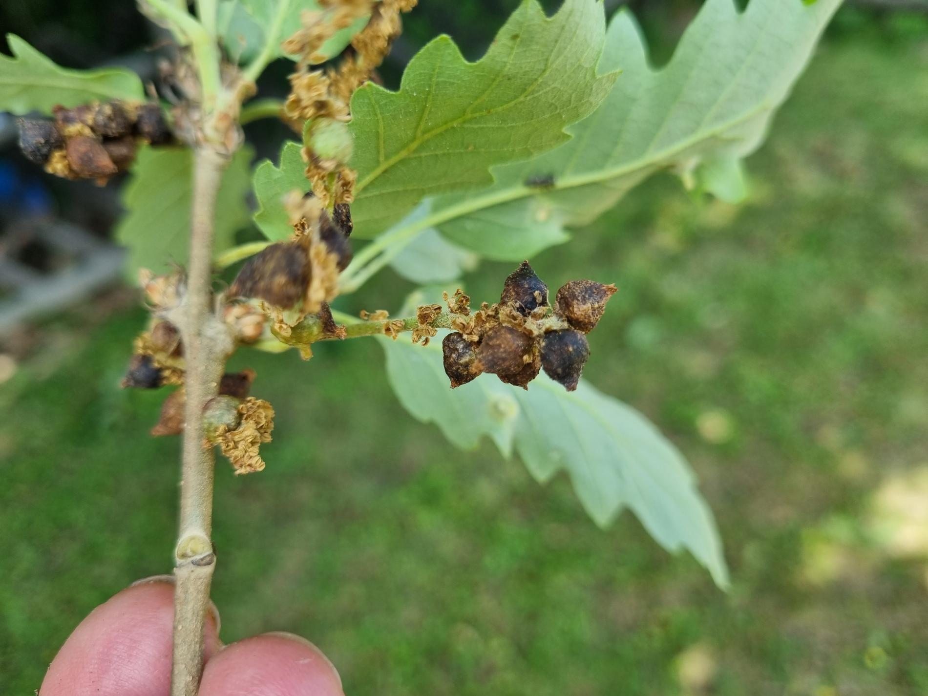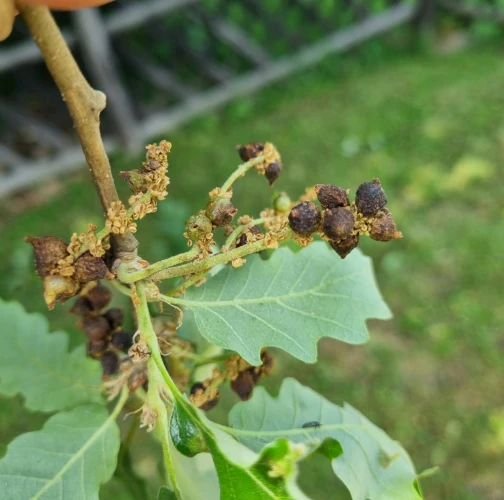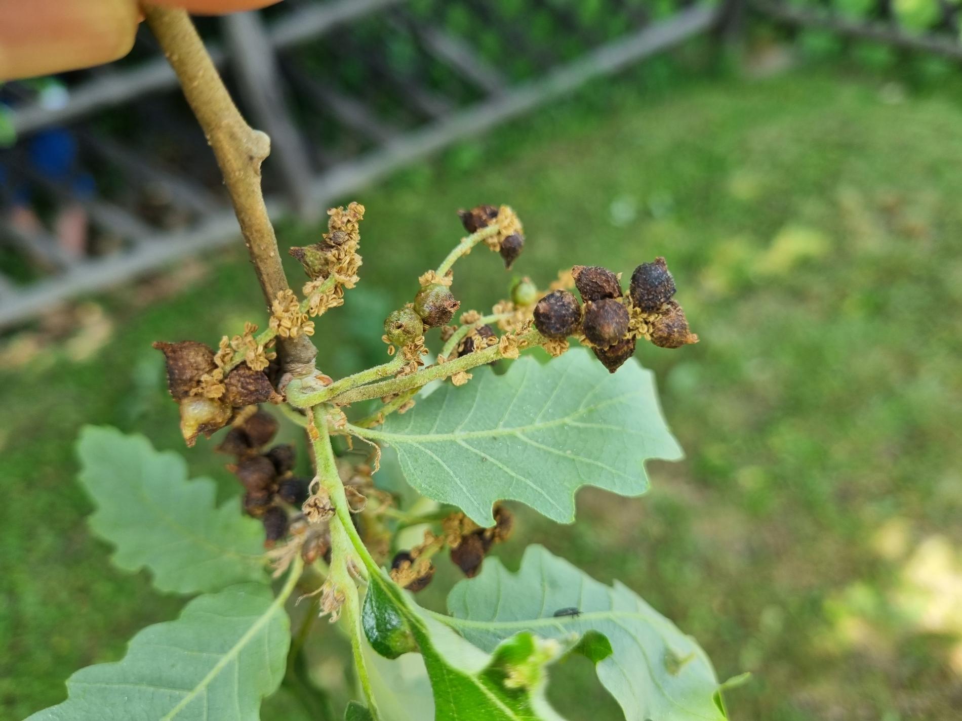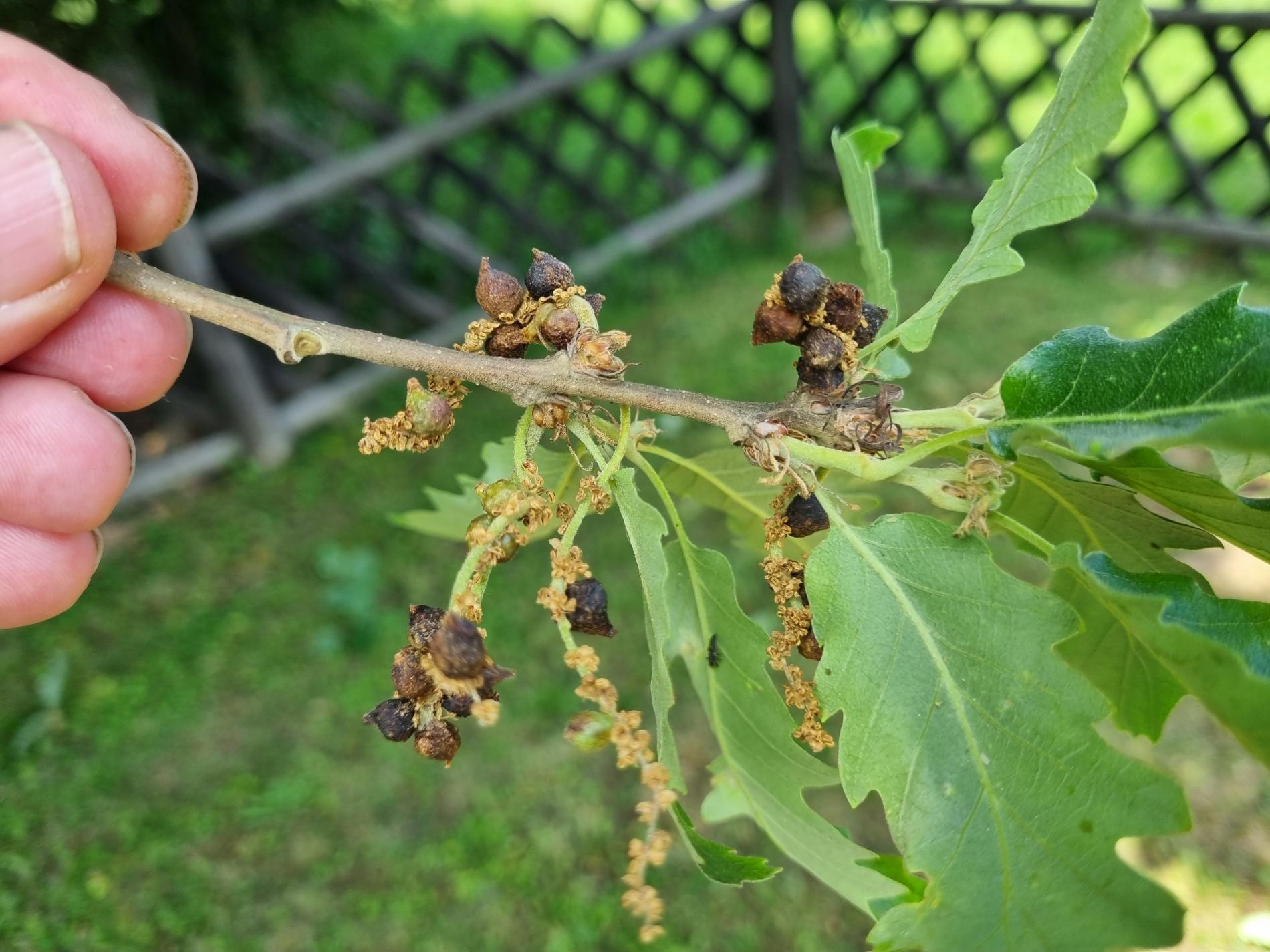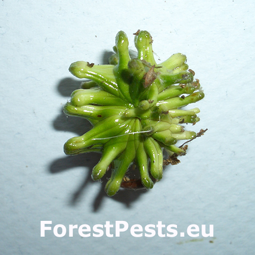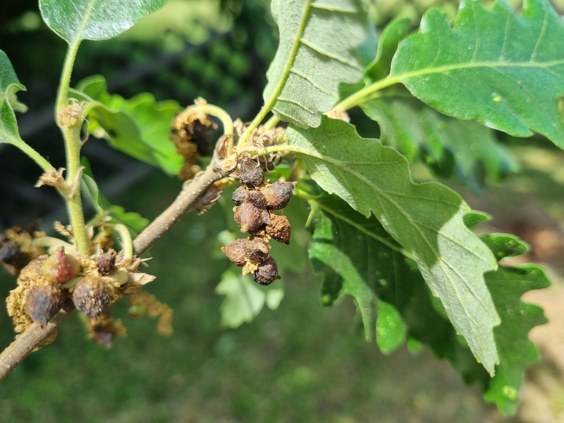 Andricus grossulariae is a gall wasp that induces characteristic acorn cup galls on oaks (Quercus spp.). Also known under the name Andricus mayri. The asexual generation develops inside acorns, with the gall remaining almost entirely hidden within the acorn cupule or bud, featuring a bunch of fleshy appendages on top. The sexual generation forms small, rounded galls on male catkins of Quercus cerris, often appearing in clusters. This species is monophagous, primarily infesting Quercus cerris, Q. frainetto, Q. infectoria, Q. lusitanica, Q. petraea, Q. pubescens, Q. pyrenaica, and Q. robur. It is distributed across Europe, particularly in temperate and warm regions. Although gall formation does not significantly harm host trees, high gall densities can affect acorn production and, in some cases, distort flower structures.