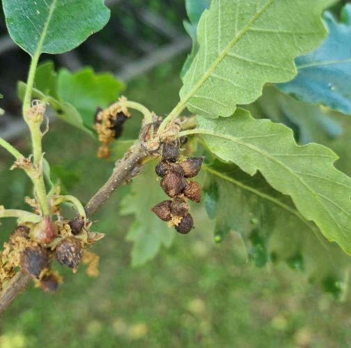 The galls of the asexual generation are round, partially embedded in the acorn cupule, with many fleshy lobes on top. The sexual generation galls appear as small, hairy, spherical swellings on male catkins, sometimes forming dense clusters.