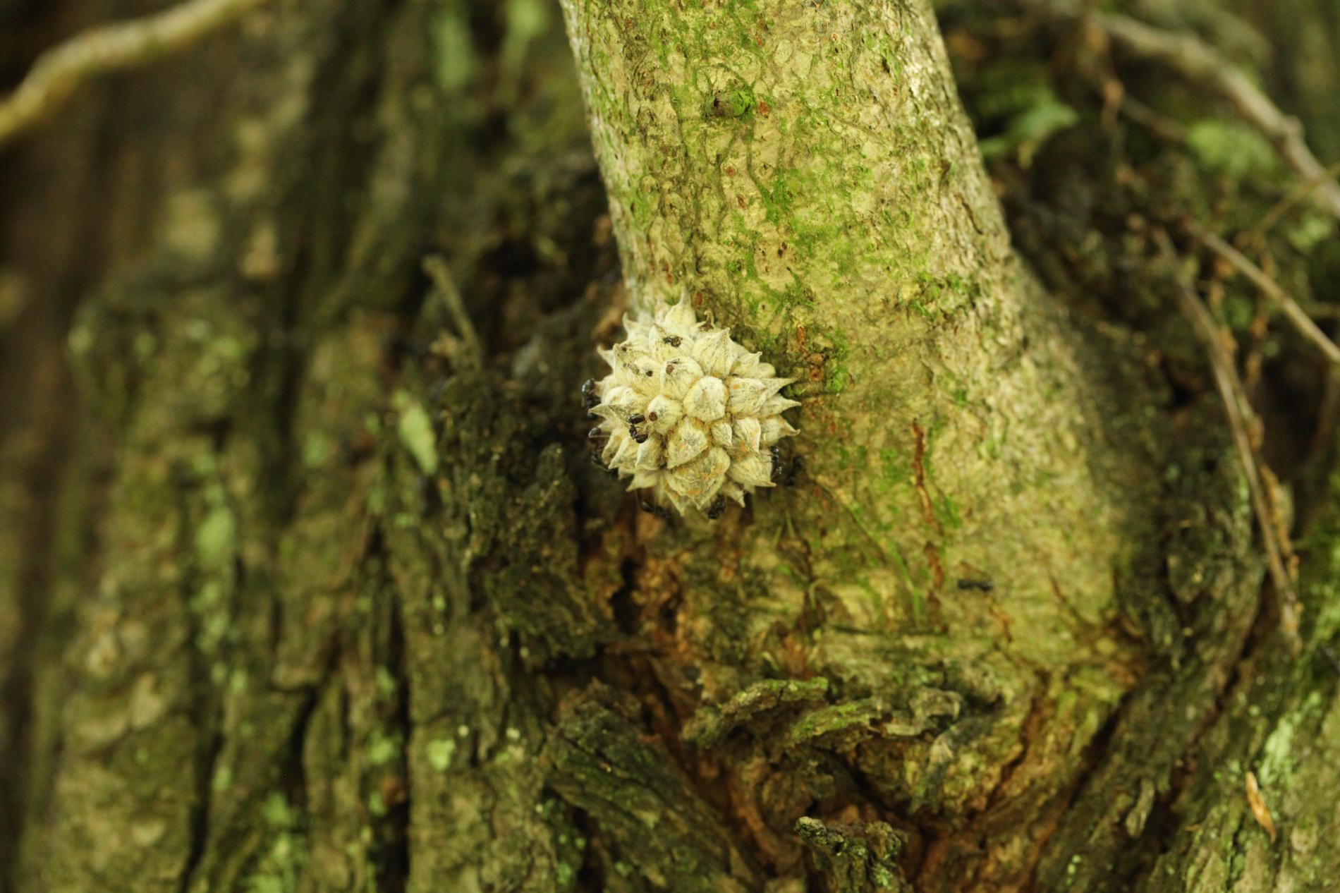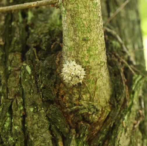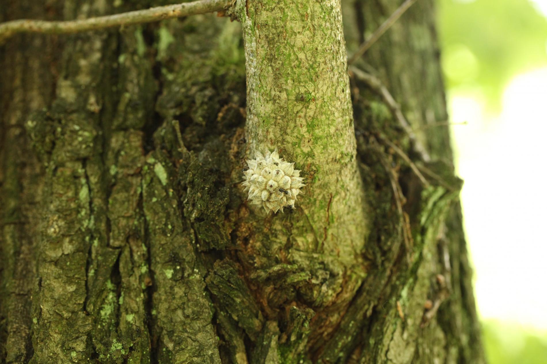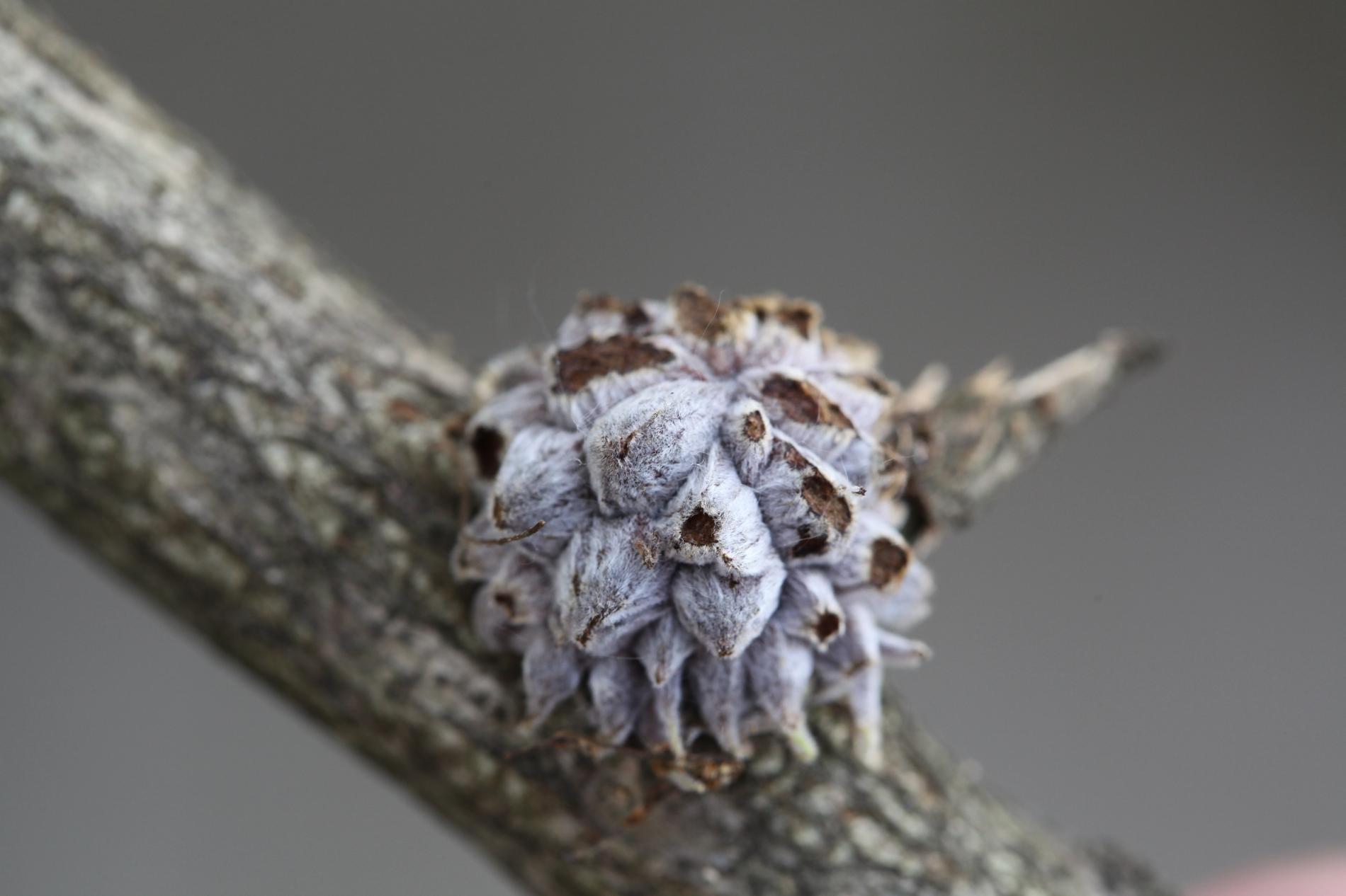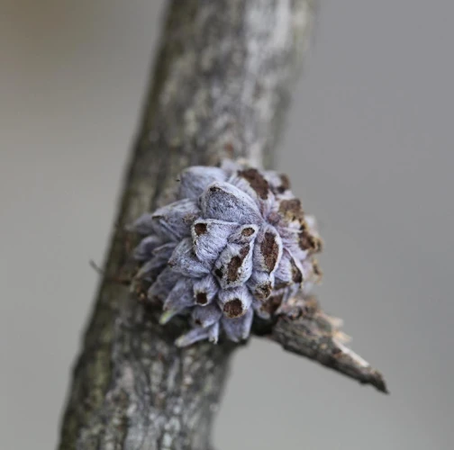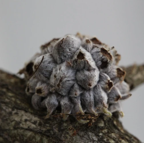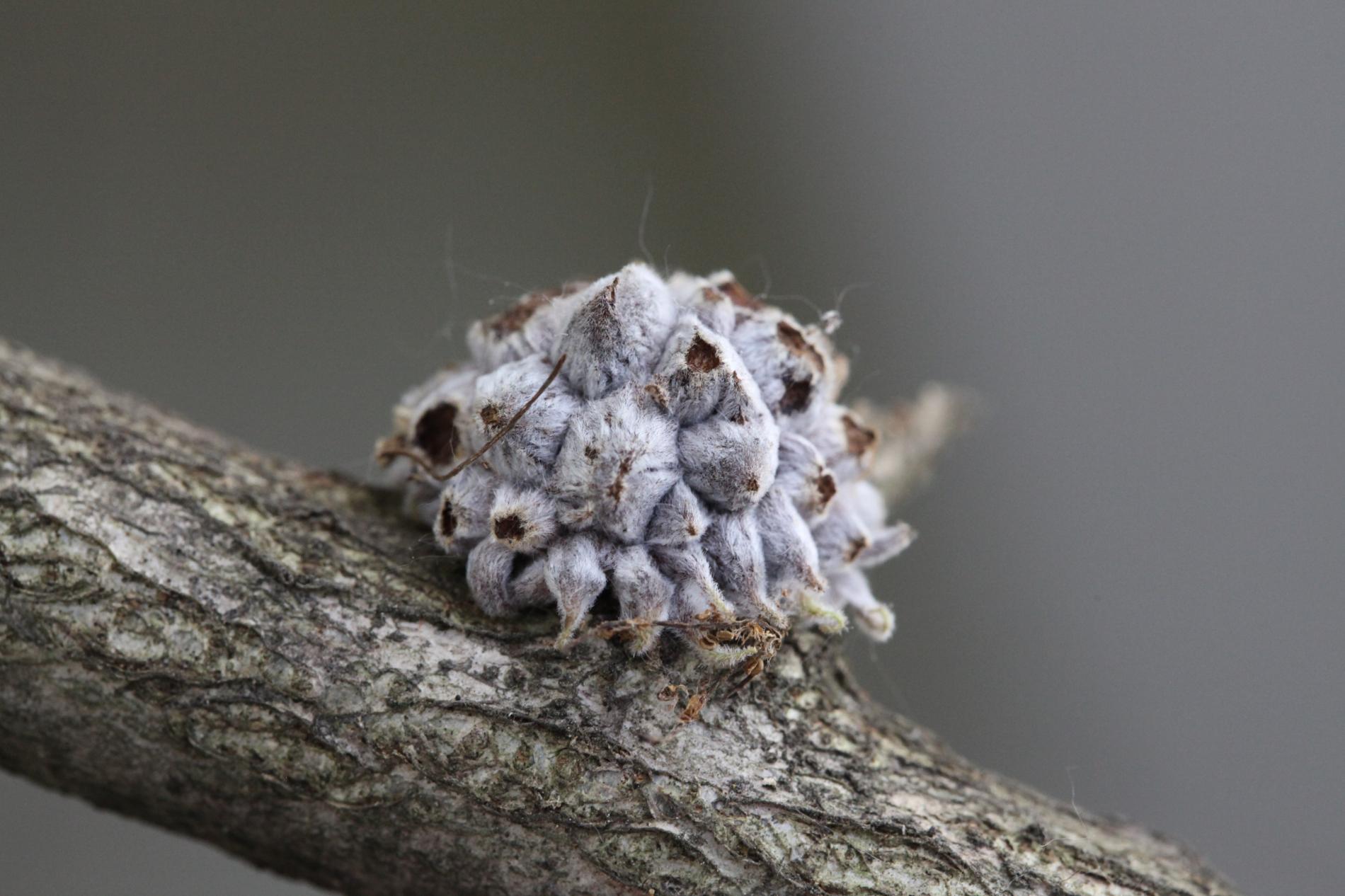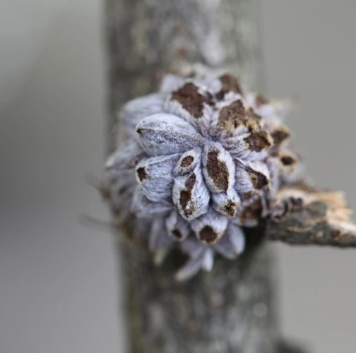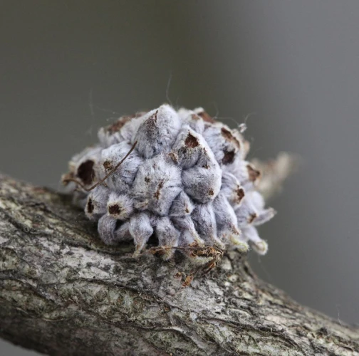 The gall of the species Andricus hartigi forms from a dormant bud, typically on a twig or even on a thicker branch. The gall itself measures 4-6 mm in size. However, it remains entirely concealed under 25-30 outgrowths, each consisting of a narrow stalk with a broader cone-shaped structure on top. It has a woolly appearance and a gray color, later turning brown when dry.