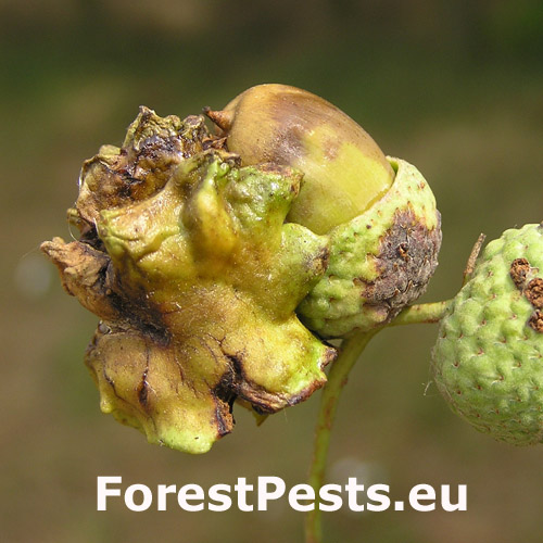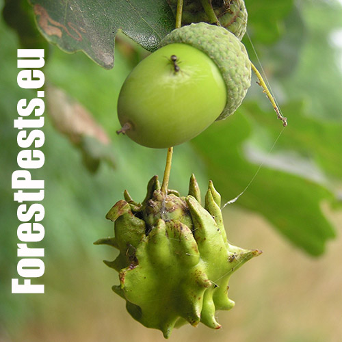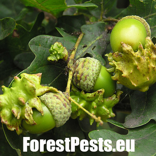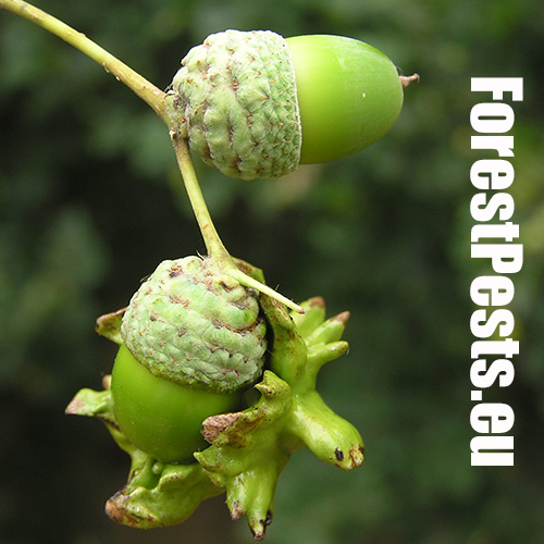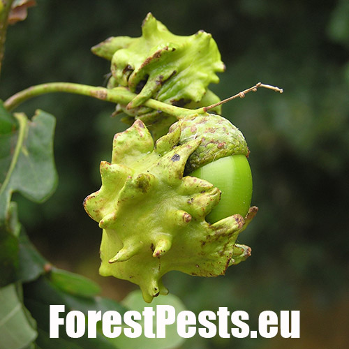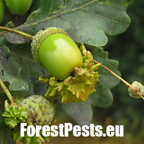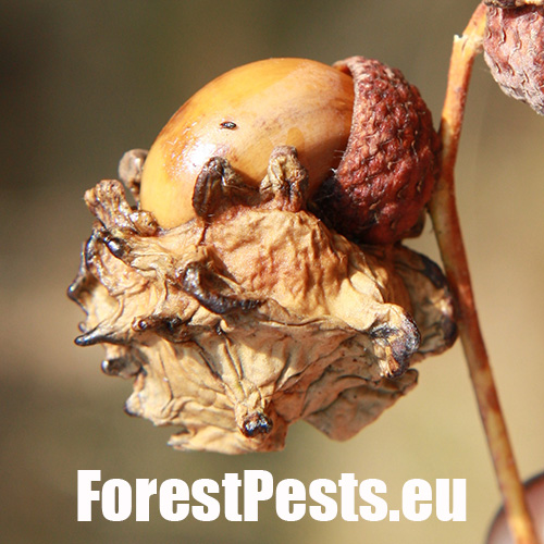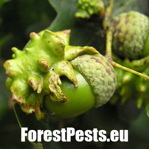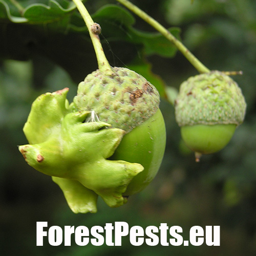 The female of this small wasp lays eggs on the acorn cup in May, injecting a special liquid inside. As a result, oak forms a specific neoplasm - a very irregular, about 2 cm long, green lump - gall - in which is developed a larva. The gall as if were overgrown with the acorn cup and it sometimes word-for-word absorbs the entire acorn. The acorn stops developing normally and it loses its germinability. It can damage up to 70-80 % of harvest locally. Damaged acorns prematurely fall off. The species needs Quercus cerris (sexual generation) for its development.