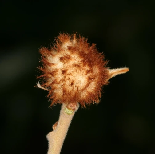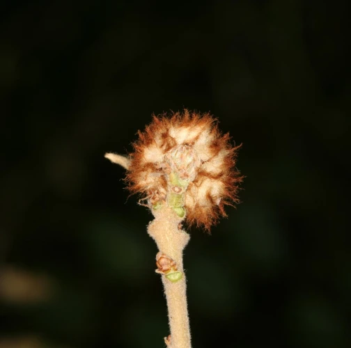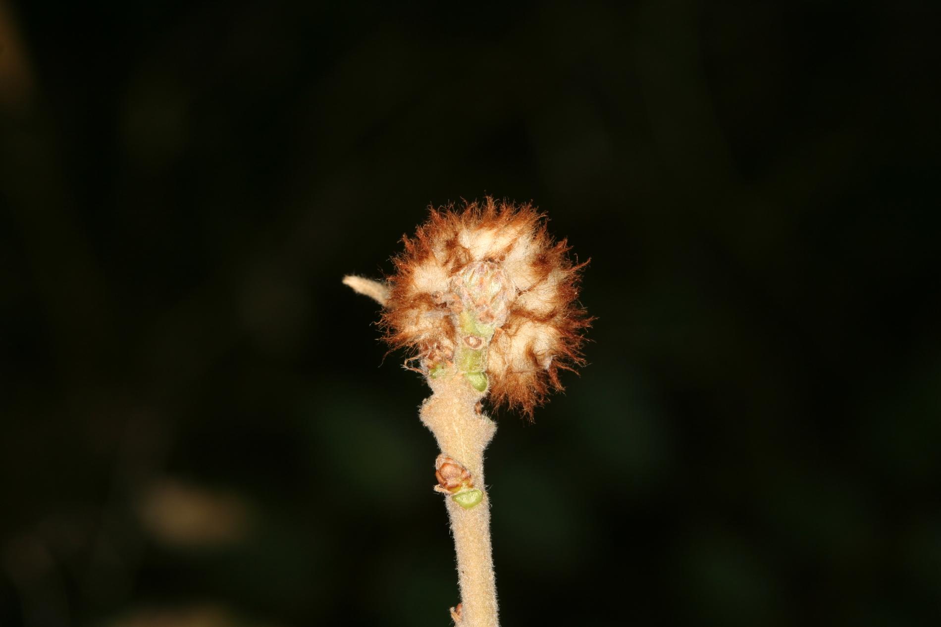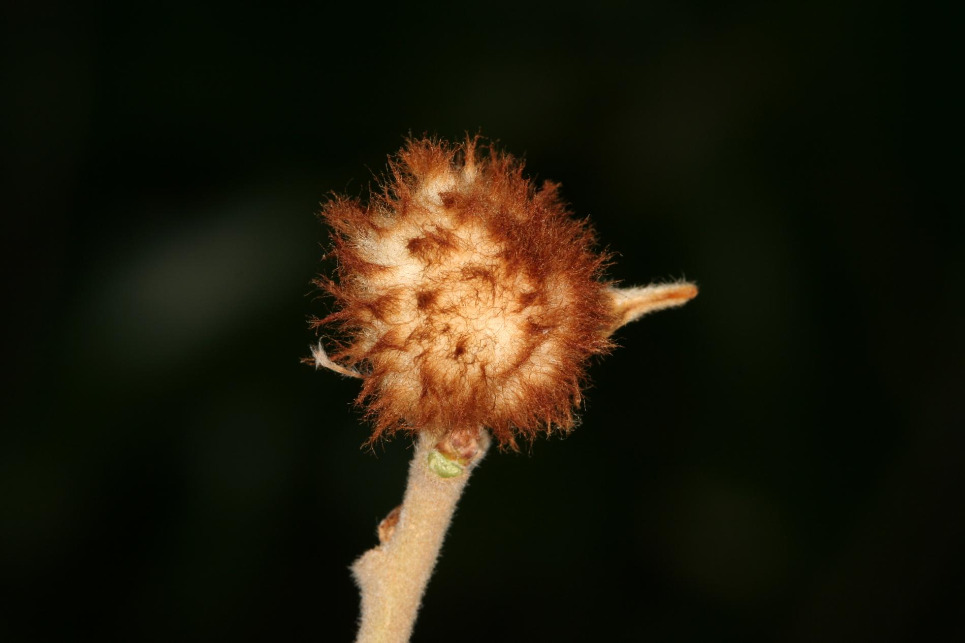 A gall attaches directly to branches. It is a solid, round structure measuring 6-8 mm in diameter. Enveloping this gall is a layer of compact wool, ranging from yellowish white to reddish, with a thickness of up to 10 mm or even more. Inside the gall lives larva of the hymenopteran species Andricus theophrasteus. Gal is similar to those formed by Andricus quercusramuli. Andricus quercusramuli gall is covered by white cotton-like mass whily in case of Andricus theophrasteus cover is yellowish or reddish.