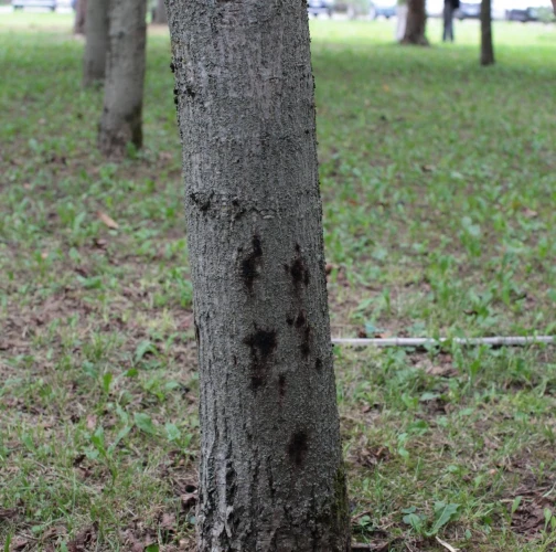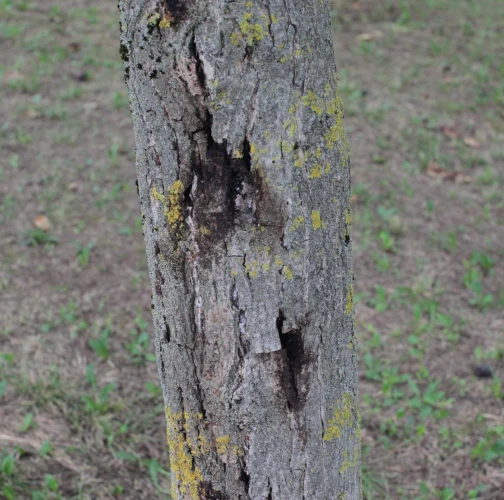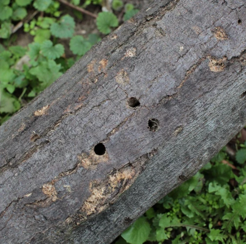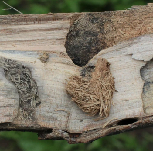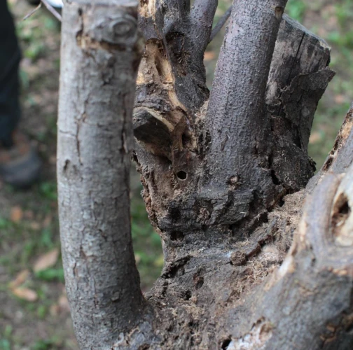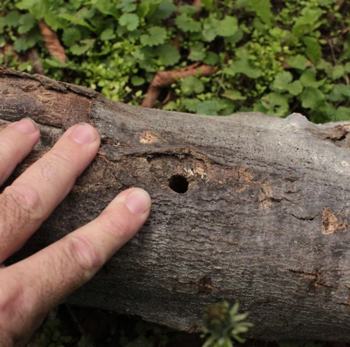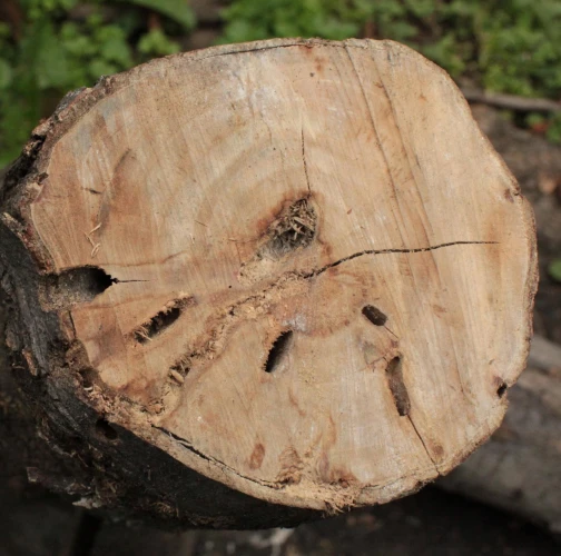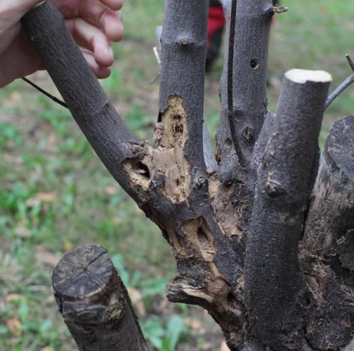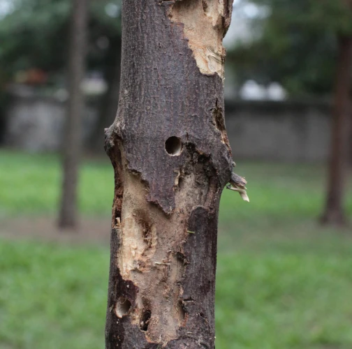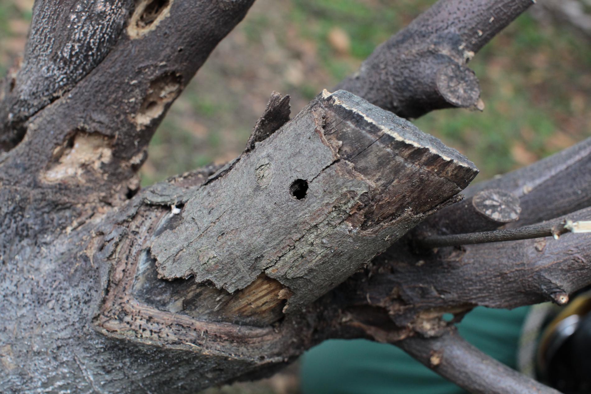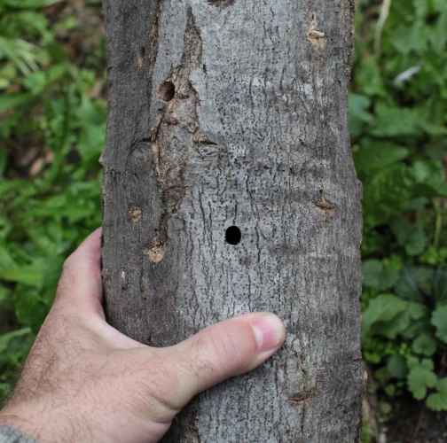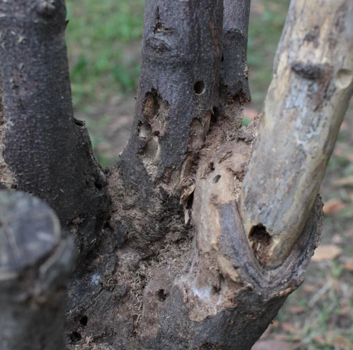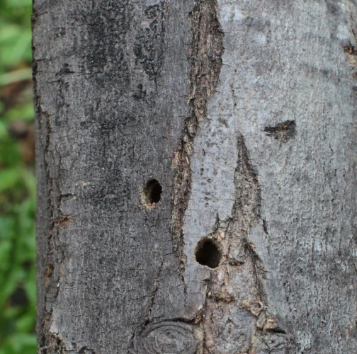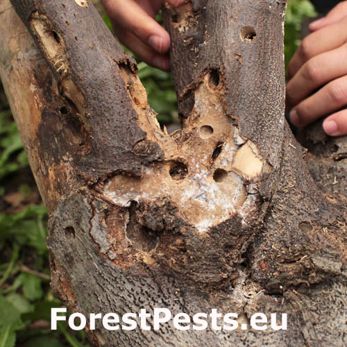 Infested trees can be recognized by the maturity feeding of beetles on twigs, traces of feeding on the surface of the bark (females lay eggs in the gnawed areas), and the outflow of sap from the larval tunnels in the cambial zone. Larval activity is recognized by galleries under the bark and, later, tunnels in the wood. Masses of wood shavings extruding from round exit holes are signs that adults have emerged from infested wood. The wood shavings extruded from the galleries often accumulate at the base of the infested tree trunk. The trees are more infested on the southern side of the trunk. Here can be found large exit holes, usually in the middle and top of the tree. The resin leaking from the wounds (after the beetle feeding in the bark) attracts secondary pests and can be a fungal infection source. Infested trees with reduced turgor have smaller leaves that turn yellow, hang and fall off, while the canopy cover of stands is significantly reduced. Wood damaged by long-horned beetle larvae can be considerably devalued. Mechanically weakened branches on infested trees are easily broken. Weakening the structural strength of wood by larvae feeding on trees in an urban environment (cities, villages, etc.) presents a significant danger to pedestrians, cars, and buildings by broken branches.