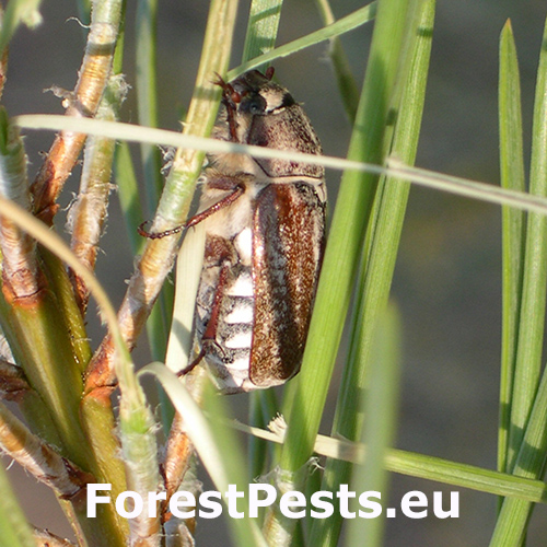 Anoxia australis is a beetle in the Scarabaeidae family, widely distributed across southern and central Europe. The adults primarily feed on foliage of different trees, while the larvae, which develop in the soil, target roots of various woody plants and grasses. This beetle prefers warm, sandy habitats where it can be found on a range of trees and shrubs, including oaks, pines, and occasionally ornamental plants. Feeding damage is generally not severe, but when populations are high, adults can cause significant defoliation, impacting the aesthetic appearance of ornamental plants and lovering the general vigor of the trees. The larvae, on the other hand, can damage root systems, potentially affecting plant vitality, especially in younger or stressed trees.