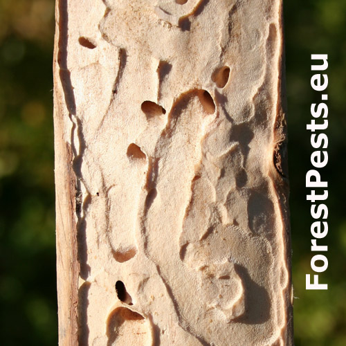 On spruce branches and stems about 10 cm thick larval galleries of this species are rather commonly found. The beetle attacks thinner stems and branches of conifers, especially spruce and pine. The larvae bore feeding galleries extend to sapwood, widen gradually and bend in a meandering pattern. A severe outbreak normally doesn’t occur and only declining trees (damaged by sunburn, drought, fire, etc.) are attacked. The pest may also invade sun-exposed felled logs with bark still unremoved. Exceptionally it may act as a primary pest in juvenile spruce plantations aged 10 minus. Similar damage is caused by A. godeti or A. nigrojubata.