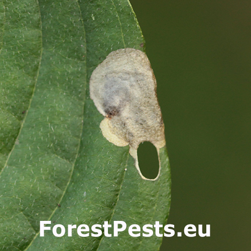 Antispila treitschkiella = petryi – chiefly on Cornus sanguinea. The mine typically does not begin with a corridor but starts directly as a blotch; it likewise ends with a cut-out “shield.”