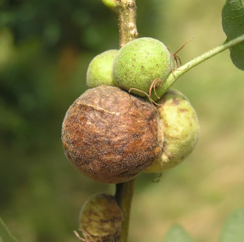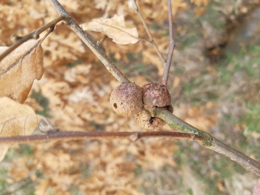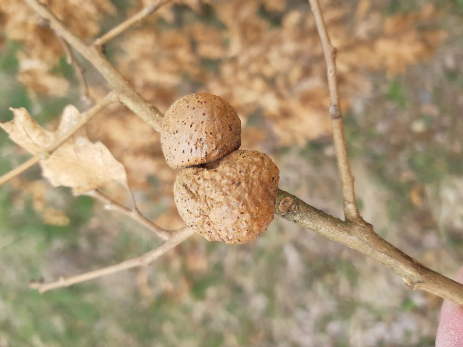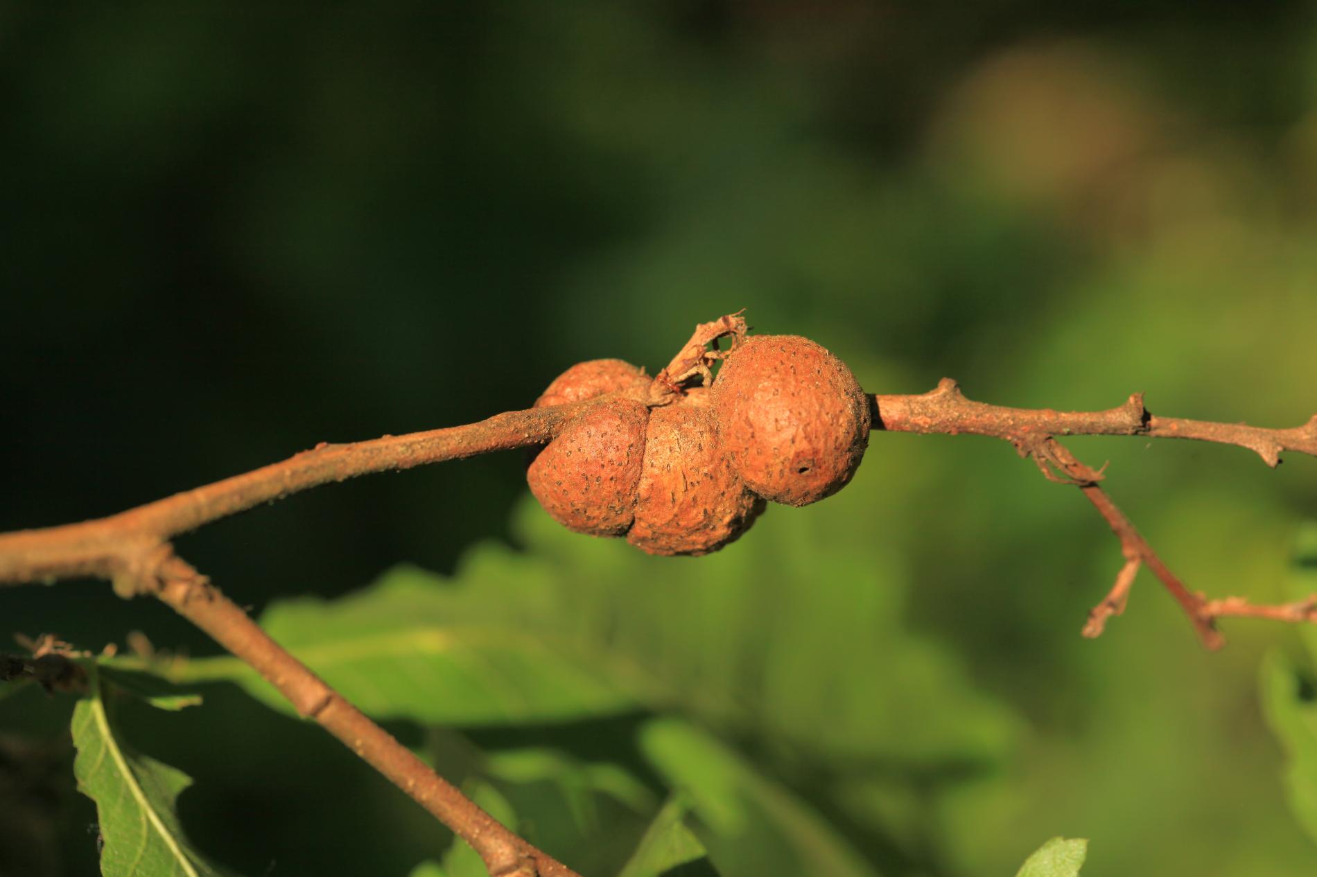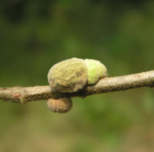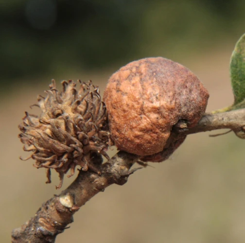 Gall wasp are 10-30 mm long, first green, later turning brown and wrinkly. They often twine the twig around.