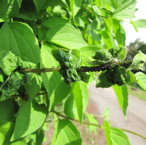 On infested leaves, visible symptoms include curled or deformed young leaves, stunted shoots, and a sticky honeydew coating, often covered with black sooty mold. High populations form dense clusters on stems and leaf undersides.