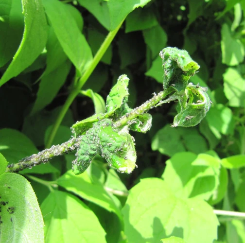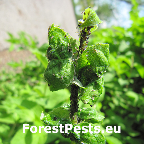 The black bean aphid (Aphis fabae) is a small sap-sucking insect belonging to the order Hemiptera. This species alternates between primary woody hosts (Euonymus europaeus, Viburnum spp., Philadelphus spp.) and secondary herbaceous hosts, including sugar beet, beans, and sunflowers. In spring, wingless females hatch from overwintering eggs and reproduce asexually, rapidly building up large populations on young shoots and leaves. By mid-summer, winged forms appear, which migrate to new plants. In autumn, winged females return to woody hosts to mate and lay overwintering eggs.