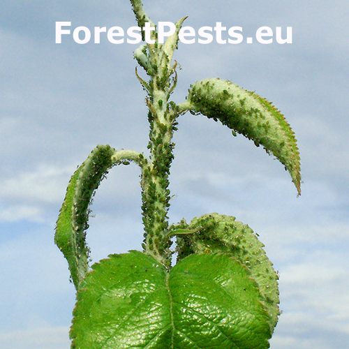 Aphis pomi is a bright green aphid. Adults are 1.5–2.0 mm long, elongated. They have transparent wings, black thorax and green abdomen. The large colonies can be found on a shoot of apple in the spring. The green apple aphid feeds on and causes curling of apple leaves. The damage caused by this aphid can be locally significant.