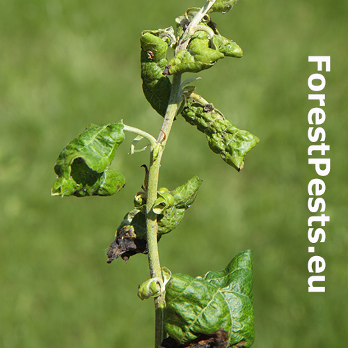 Twisting, curling or other deformations of leaves or entire young shoots. The presence of green aphids on the shoots and the underside of the leaves. Often in large colonies.