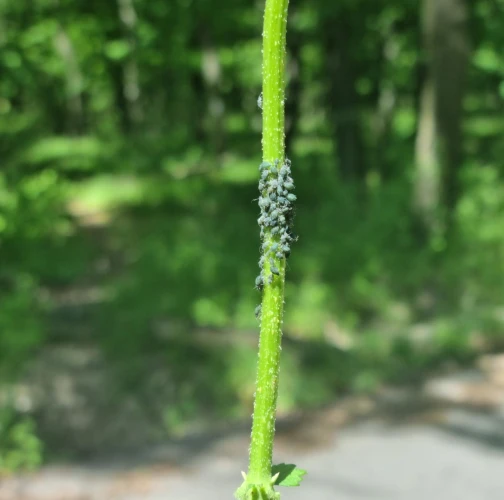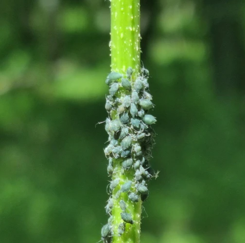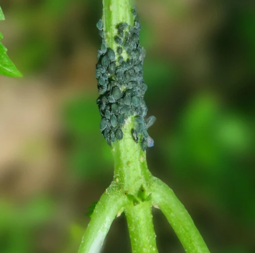 Infestations often lead to distorted or curled leaves and shoots due to the aphids' feeding activity. The aphids excrete a sticky substance called honeydew, which can cause sooty mold to develop on the plant's surface. This can lead to a black, sooty appearance on leaves and stems. Heavy infestations can weaken plants, resulting in stunted growth and reduced vigor. As aphids feed on plant sap, the leaves may turn yellow and may eventually drop off. Long-term infestations can contribute to the overall decline of plant health, affecting their ability to photosynthesize and grow.