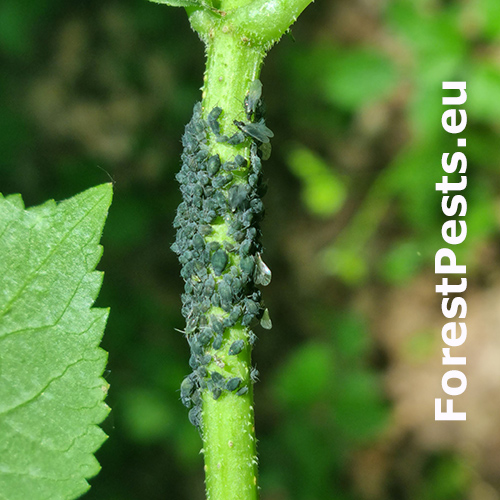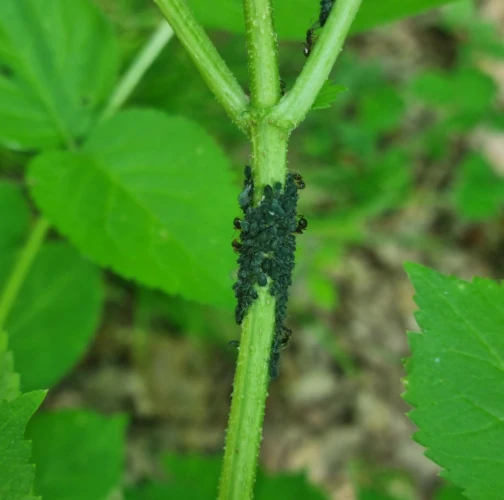 Aphis sambuci, commonly known as the elder aphid, alternates between its primary host, elder (Sambucus nigra), and secondary host plants like docks (Rumex) and campions (Silene). In spring, it forms dense colonies on elder, where it is strongly attended and sheltered by ants, particularly Lasius niger. During autumn, sexual forms appear, and overwintering eggs are laid in the axils of elder buds and bark cracks. These eggs hatch into apterous fundatrices, leading to large, persistent colonies. Winged females, or alates, emerge in later generations and may migrate to secondary hosts. Notably, A. sambuci is well-suited to urban environments, thriving on elder in marginal habitats like gardens, city parks and roadsides.