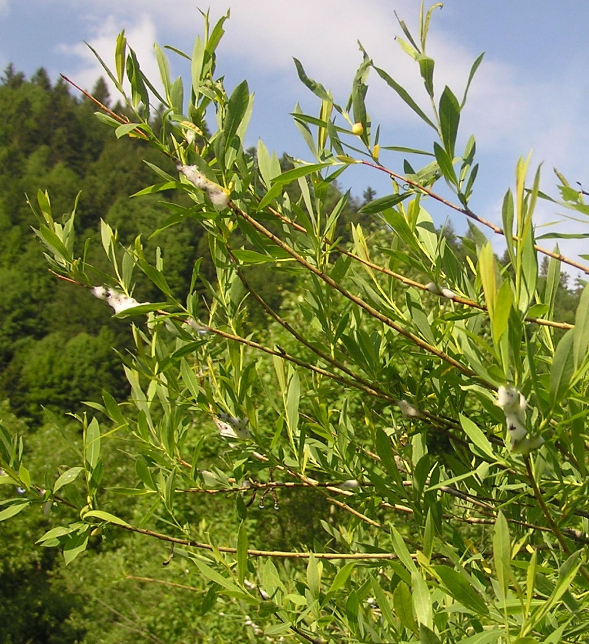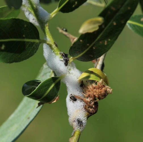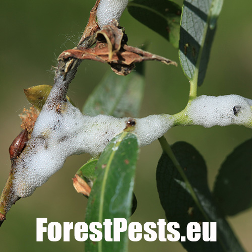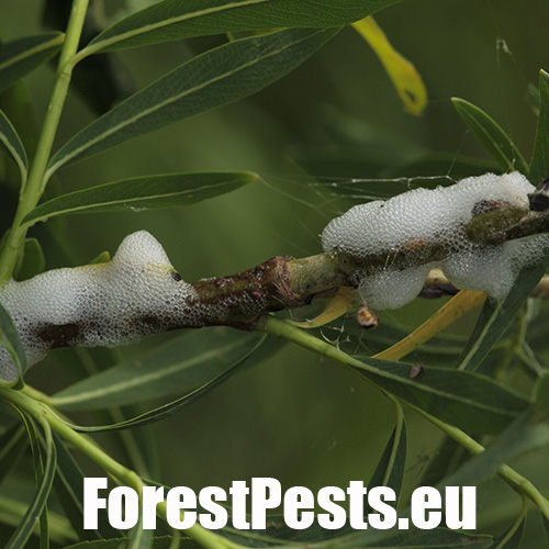 Spittlebug occurrence is striking by spittle, foam formations forming larvae in the places of sucking. In case of widespread occurrence, it seems “to be raining” under the attacked trees also during sunny weather. It is a liquid dripping from foam formations. In the formations live larvae that by their activity can weaken the trees and cause damage to osiers. Adult willow spittlebug is about 1 cm long insect belonging to cicadas.