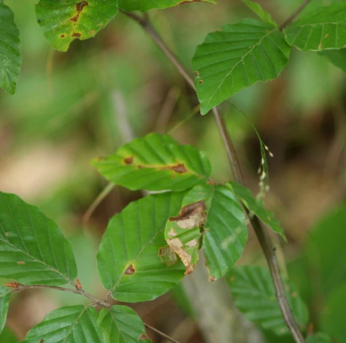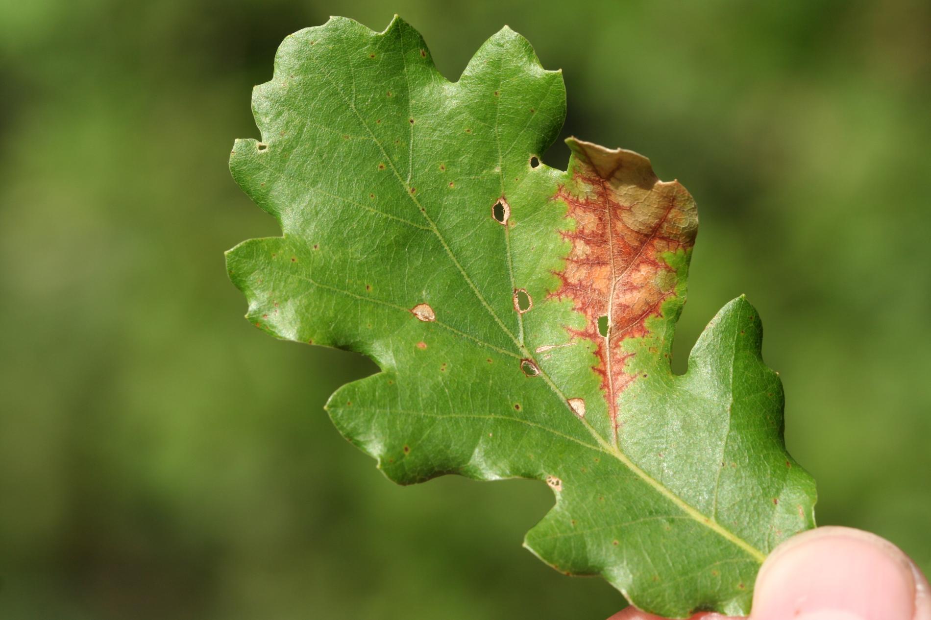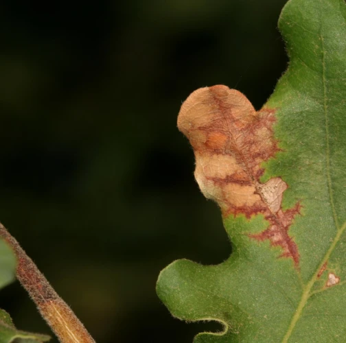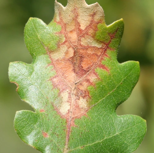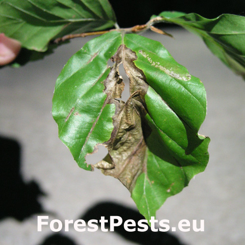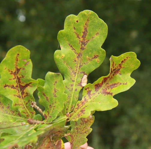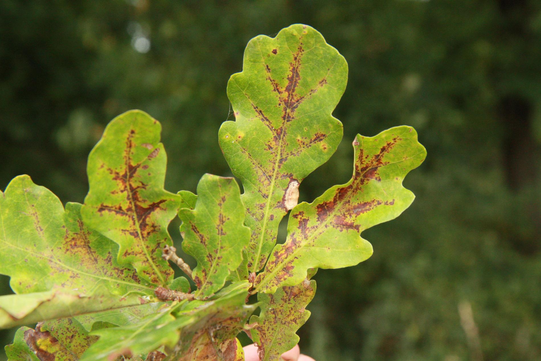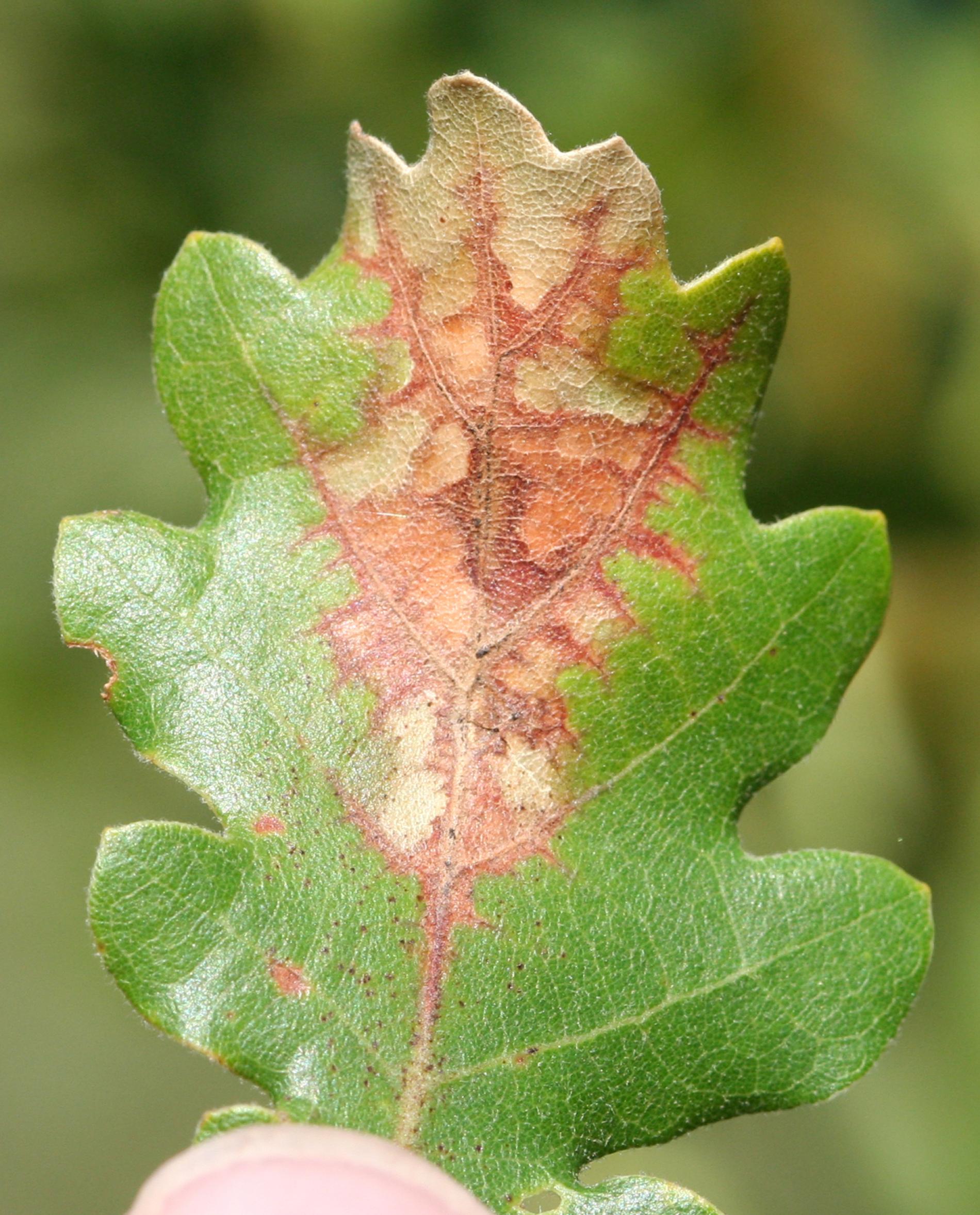 Typical symptoms of the infection are brown spots along the main vein of the leaf blade. Another symptom are brown spots on the leaf blade basis and most rarely occurs the blackening of leaf stems. The fungus is an endophyte living in the green parts of leaves and not causing any damage. In case of the weakening of leaves or the weakening of whole trees e.g. by drought, gall-creating insects or other fungi, there occurs a change in a way of fungus life and it becomes a pathogen. It results in the leaf necrosis, however, by this self-destructing defence mechanism it prevents from  the forming of insect galls.