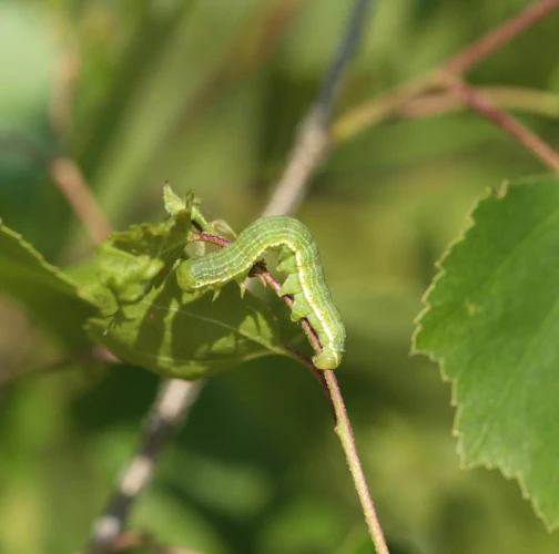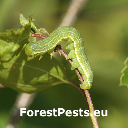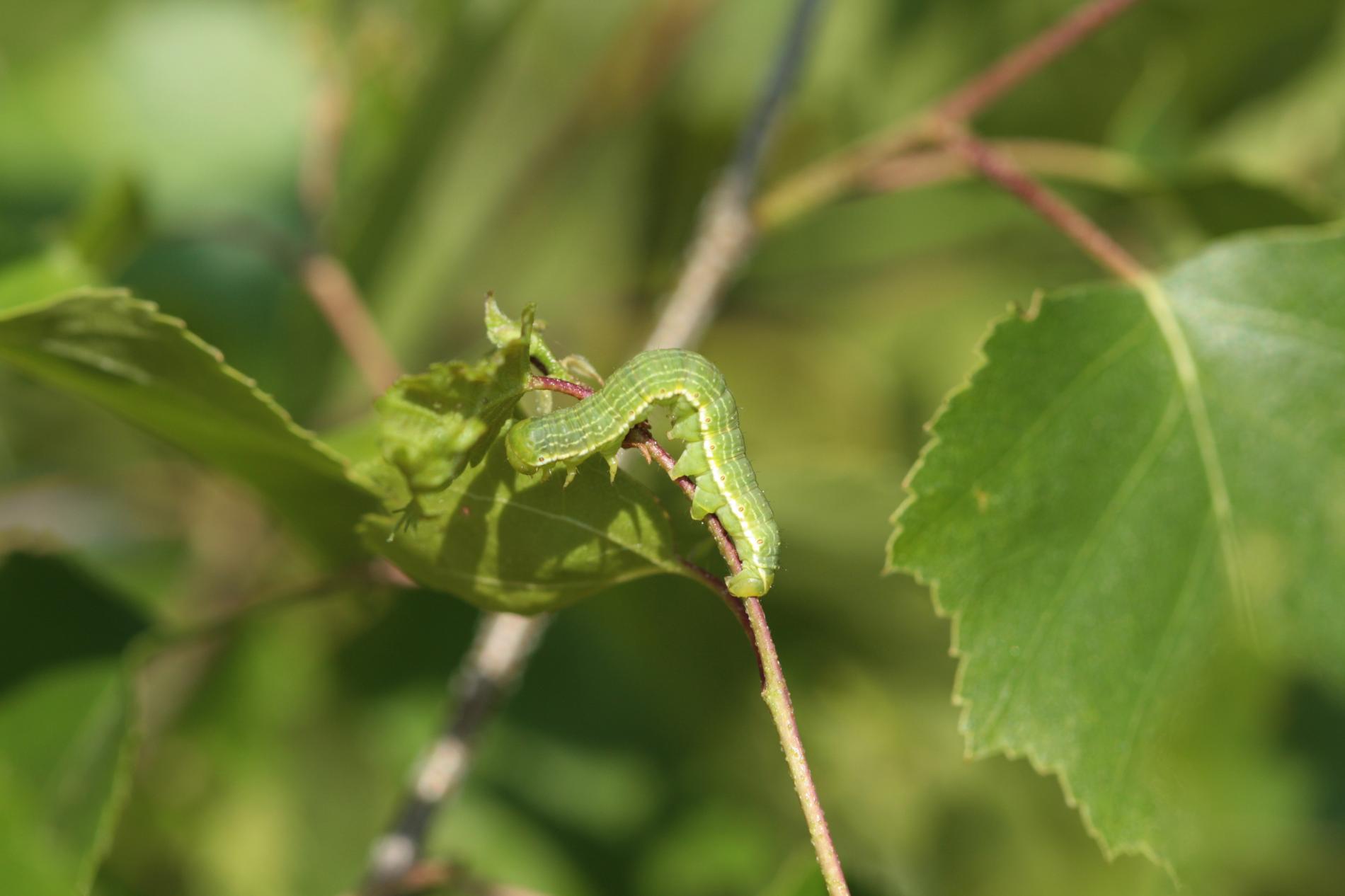 Green catterpilar on leaves or twigs. Defoliation of the crown.