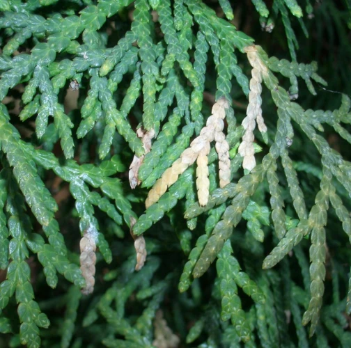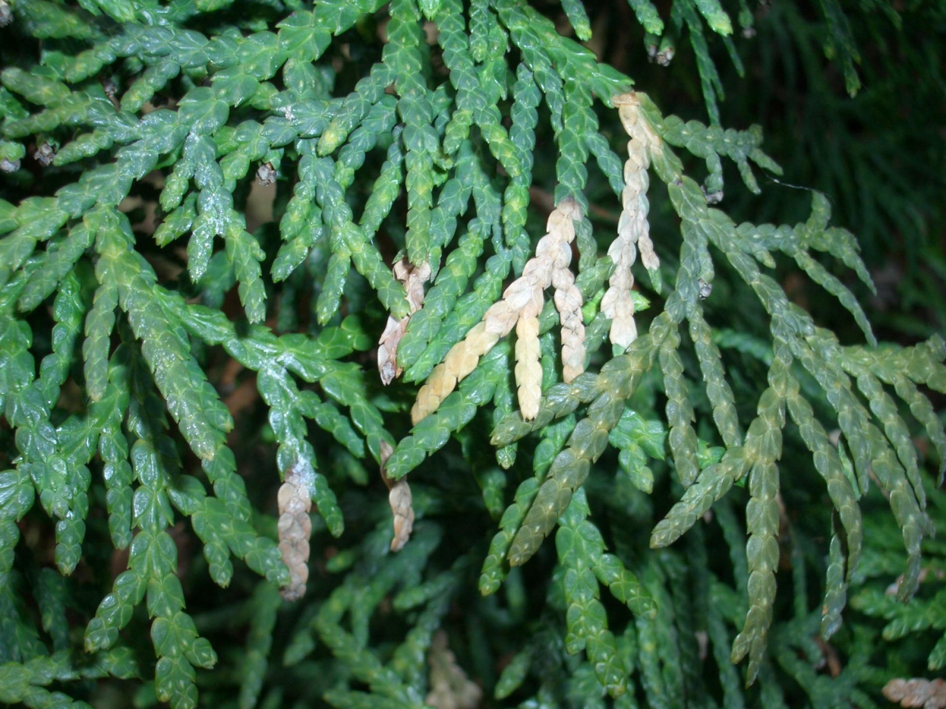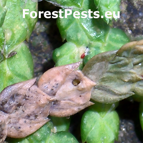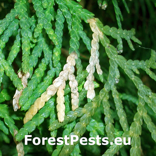 Argyresthia thuiella, commonly known as the arborvitae leafminer, is a moth species (Argyresthiidae) primarily affecting thuja Thuja occidentalis. However, it can also infest other species within the Thuja genus and Chamaecyparis species. Adults are small, light-gray moths with brown and black spots, laying eggs from June to July on the twigs of a host plant. The larvae, greenish-brown with a dark head, feed within the foliage (branches), leading to browning and dieback of leaf tips. This damage is usually visible during the winter and can often be mistaken for other causes. In Europe, A. thuiella has established in many regions a strong populations, especially in urban landscapes and ornamental plantings where its host plants are prevalent.