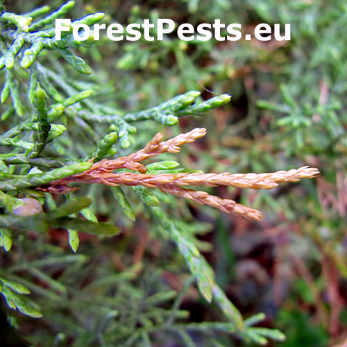 Infestation signs include browning and hollow shoot tips with larvae present inside. Small exit holes on the shoots. Unlike A. thuiella, A. trifasciata typically affects juniper species and prefers warmer conditions.