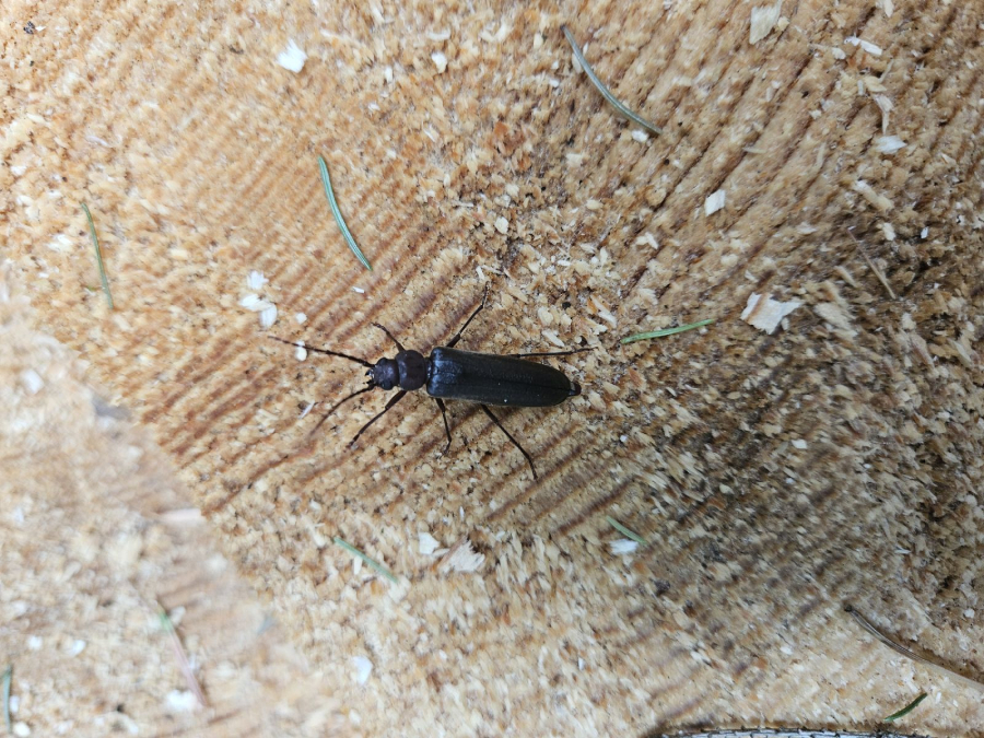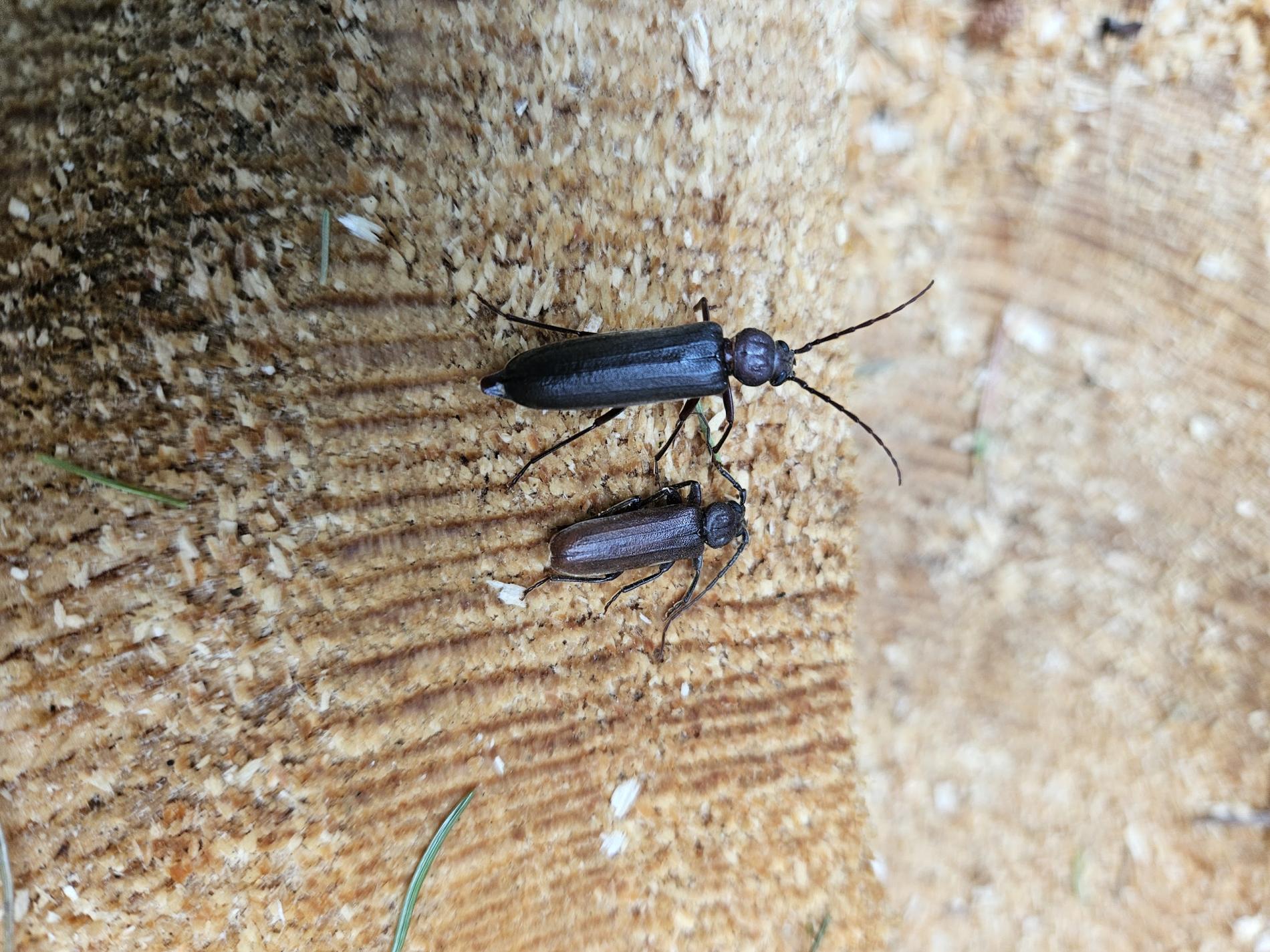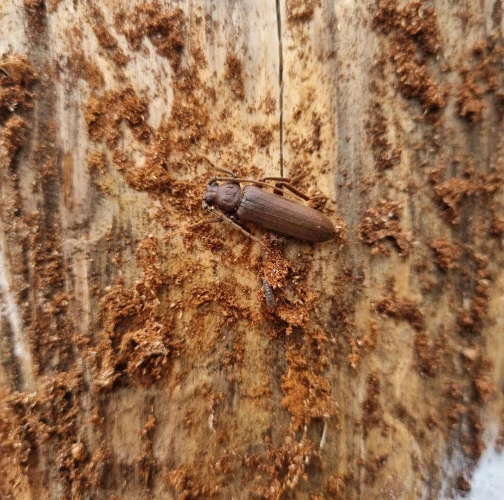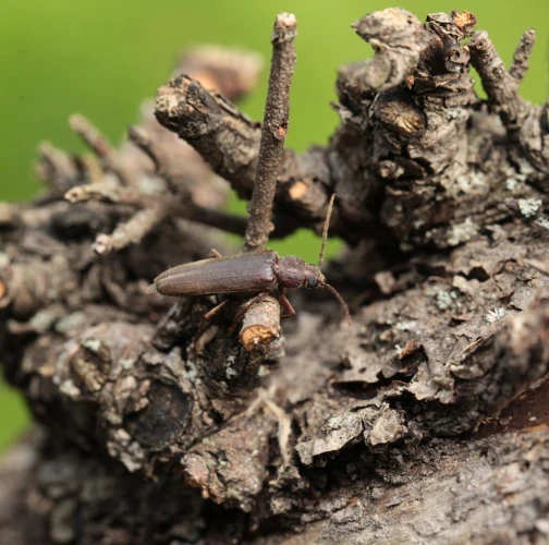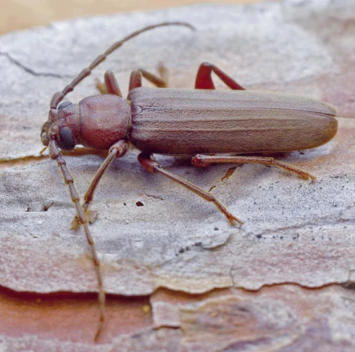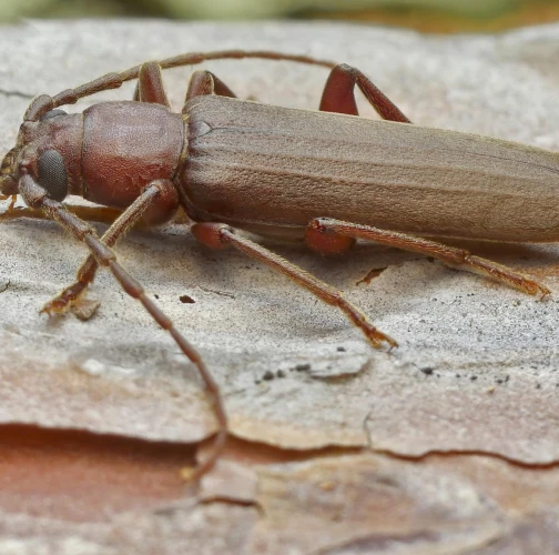 Arhopalus rusticus is a species of longhorn beetle in the family Cerambycidae. It is commonly found in forested areas, ranging from Europe to East Asia, and is known to preferably attack pine trees. It can also develop in other coniferous trees such as Picea, Abies, and Larix; however, Pinus is preferred. The larvae of this beetle live under the bark and in shallow sapwood. It prefers dead trees and is typically a secondary pest. As its galleries can sometimes be a disadvantage in wood processing, it is considered a wood-destroying insect. The adult beetles are typically active during the summer months; they can be found resting on host trees and are attracted to light at night. They have a robust, elongated body with a reddish-brown to dark brown coloration. The species is of particular concern in forestry and wood production industries due to its potential to harm wood products. It is very similar to Arhopalus ferus, which is usually much rarer.