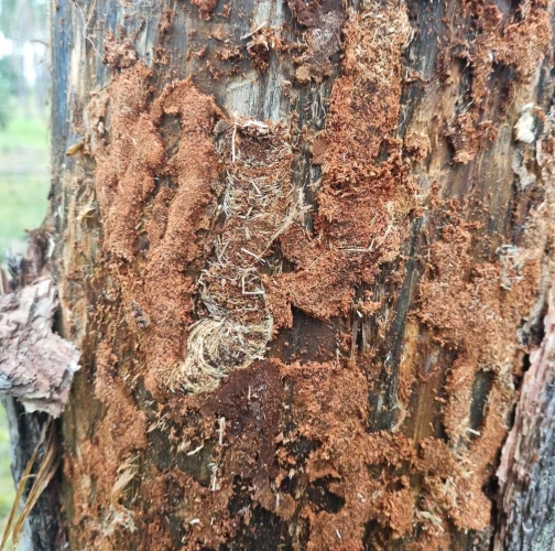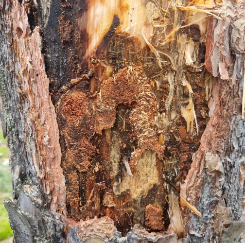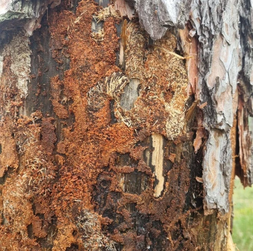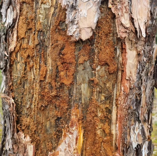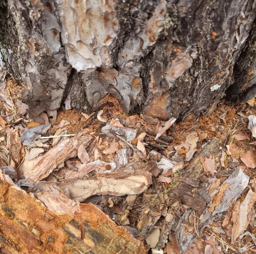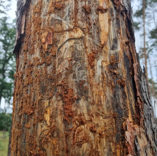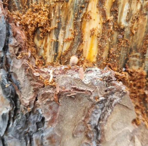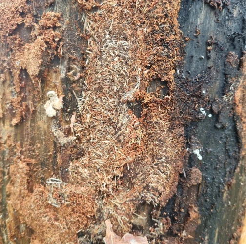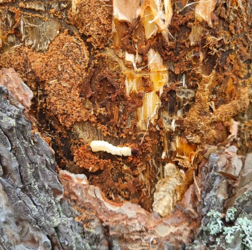The larvae create extensive galleries in the shallow sapwood, which are typically filled with frass (sawdust-like material). Sawdust-like frass can accumulate around the base of the tree or in the immediate area, indicating larval activity.