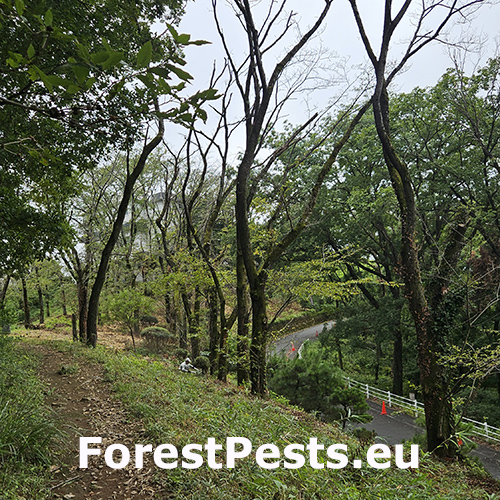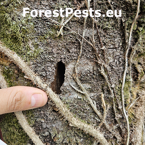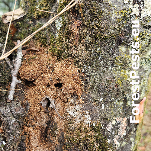 Infestations are identified by oval exit holes (6–12 mm) in the bark, made by adult beetles as they emerge, and the accumulation of coarse wood shavings or frass (a sawdust-like material) around the base of the tree or in bark cracks. Internal tunnels created by larvae weaken the tree, and infested branches may die due to larvae feeding on the cambium layer. Some trees may also exude sap around the infestation site as a defense response.