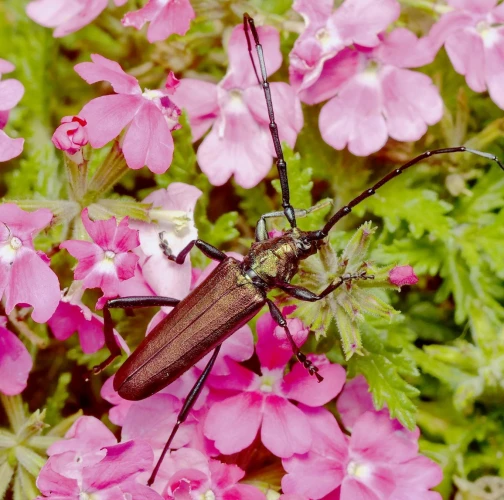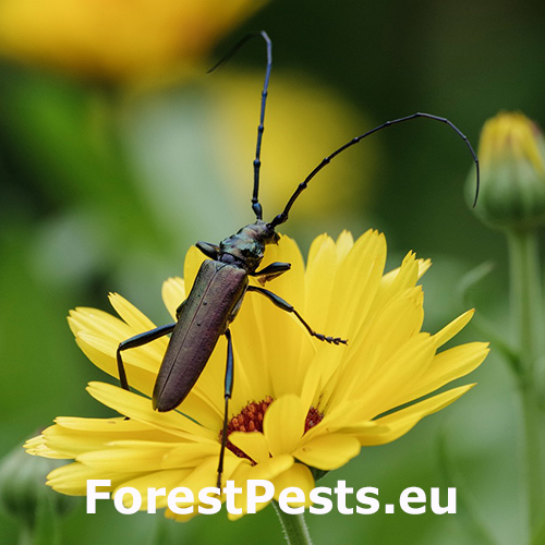 Aromia moschata, commonly known as the musk beetle, is a metalic green longhorn beetle native to Europe and parts of Asia. It primarily feeds on willows (Salix spp.) but can also infest other deciduous trees, such as poplars and birches. Female musk beetles lay their eggs in crevices of tree bark, primarily on willows. After hatching, the larvae bore into the wood and spend most of their life in this stage, feeding on the inner bark and in the wood. The larval stage lasts for about 1 to 2 years, during which the larvae create long tunnels. The larvae typically pupate closer to the surface of the wood rather than very deep inside, often just under the bark or in the outer layers of the wood. Adult beetles emerge in summer, from June to September. They live for a few weeks, feeding on flowers some plants, feeding on nectar and pollen. Sometimes also on tree sap. Larval activity beneath the bark and within the wood can lead to tree dieback, increased susceptibility to disease, and, in severe cases, tree death. Aromia moschata is not a common species, on many areas rare. Although not generally considered a major pest, large infestations can cause significant damage, particularly to weakened or stressed trees.