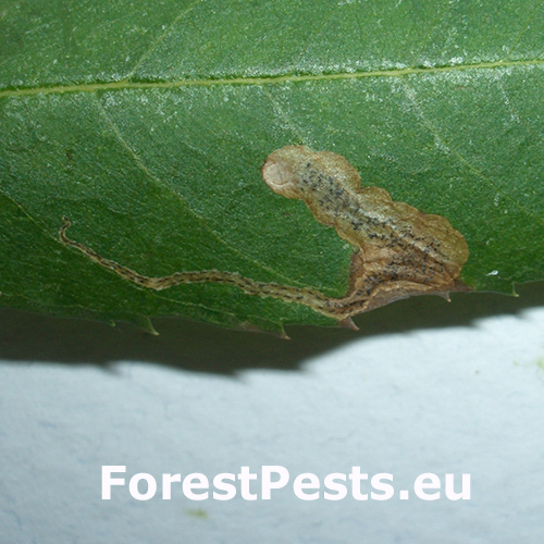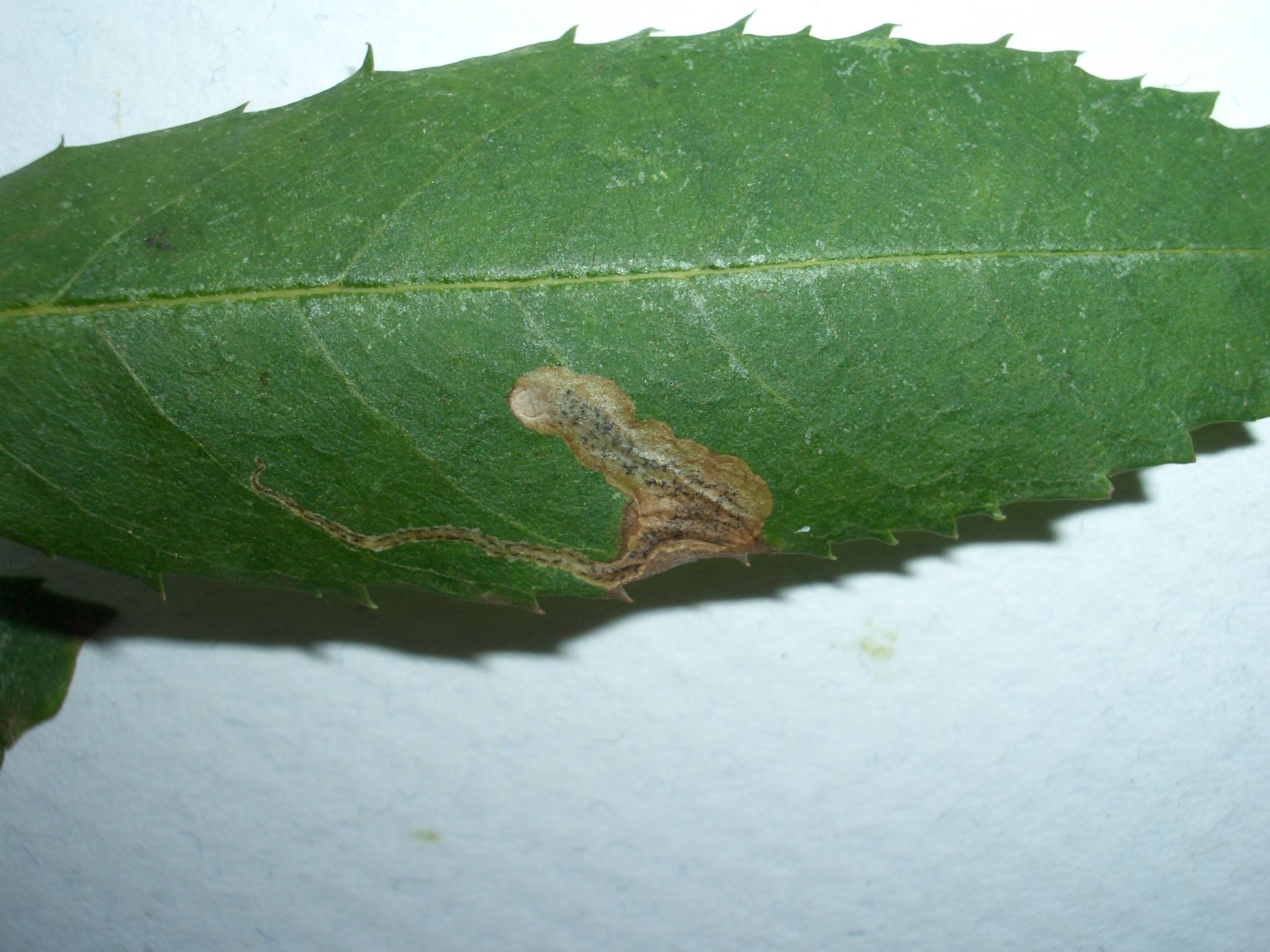 Larvae form upper-surface leaf mines that begin as fine galleries, progressively widening. The mines contain frass in small rod-like formations along the edges. Pupation occurs externally, and vacated mines feature a characteristic semicircular exit slit.